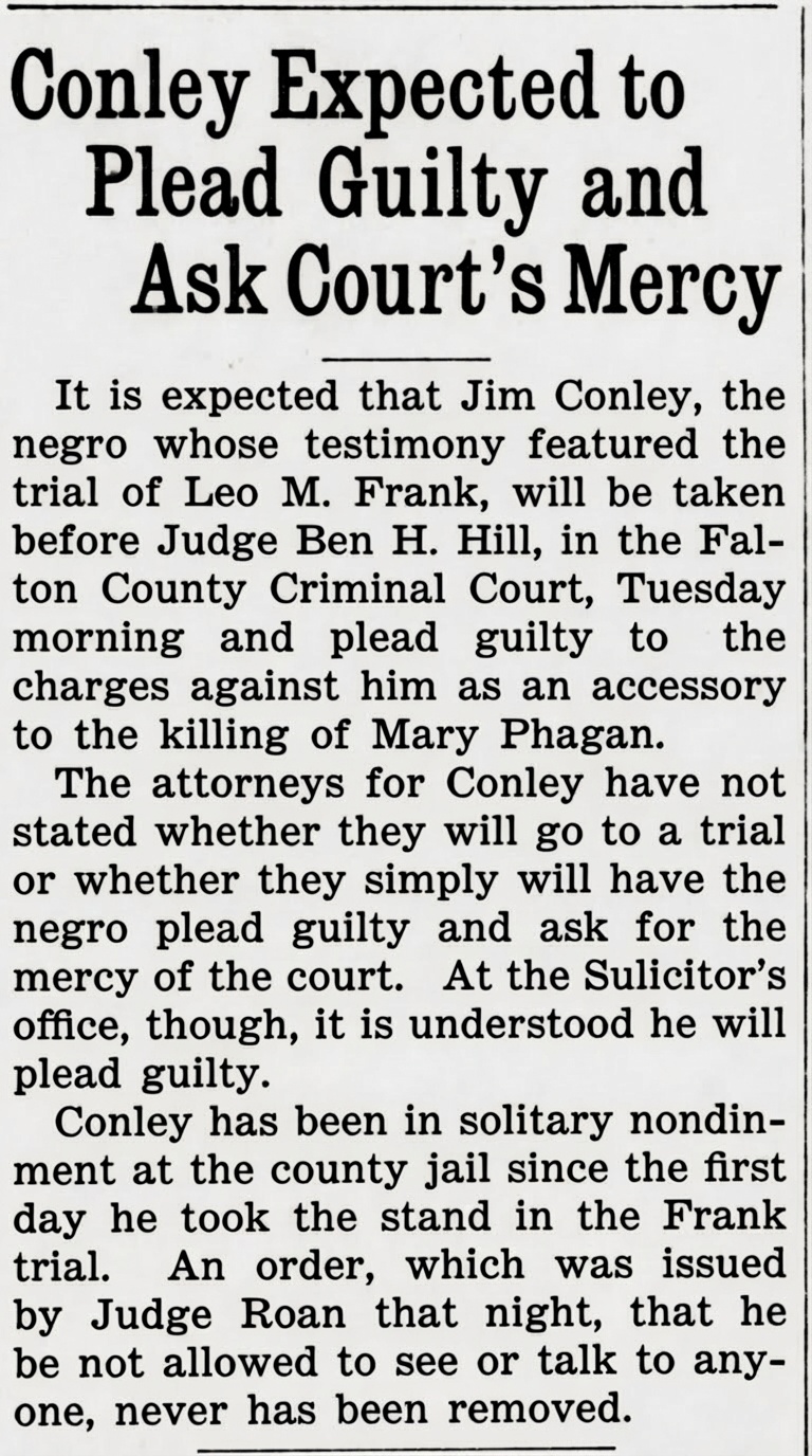 It is expected that Jim Conley, the negro whose testimony featured the trial of Leo M. Frank, will be taken before Judge Ben H. Hill, in the Fulton County Criminal Court, Tuesday morning and plead guilty to the charges against him as accessory to the killing of Mary Phagan.