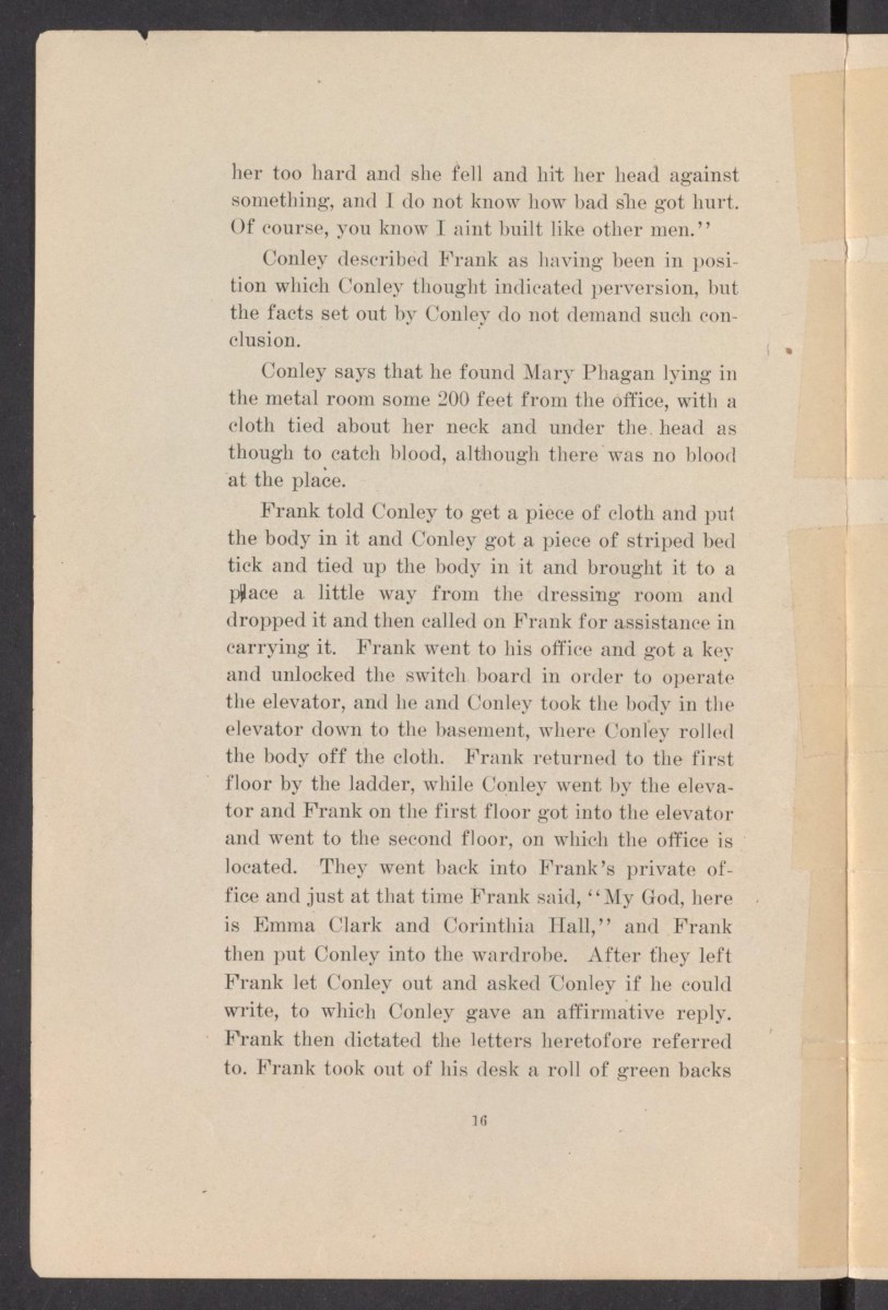 "On May 29th, we talked with Conley almost all day. We pointed out things in his story that were improbable and told him he must do better than that. Anything in his story that looked to be out of place, we told him would not do. We tried to get him to tell about the little mesh bag. We tried pretty strong. He always denied ever having seen it. He denied knowing anything about the matter down in the basement in the elevator shaft. He never said he went down there himself between the time he came to the factory and went to Montag's. He never said anything about Mr. Frank having hit her, or having hit her too hard, or about tiptoes from the metal department. He said there was no thought of burning the body.