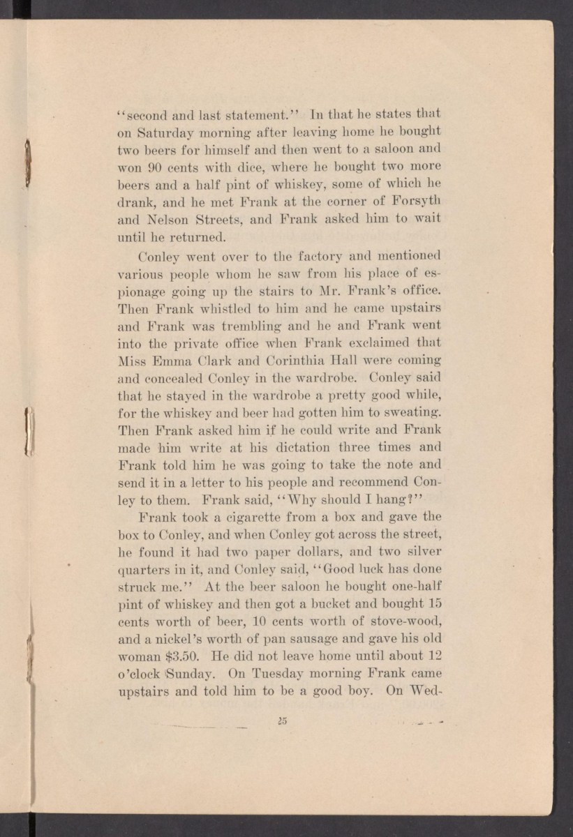 for five or six hours again, endeavoring to make clear several points which were far-fetched in his statement. We pointed out to him that this statement would not do and would not fit, and he then made the statement of May 28th, after he had been told that his previous statement showed deliberation and could not be accepted. He told us nothing about Frank making an engagement to stamp and for him to lock the door, and told nothing about Monteen Stover. He did not tell us about seeing Mary Phagan. He said he did not see her. He did not say he saw Quinn. Conley was a rather dirty Negro when I first saw him. He looked pretty good when he testified here.