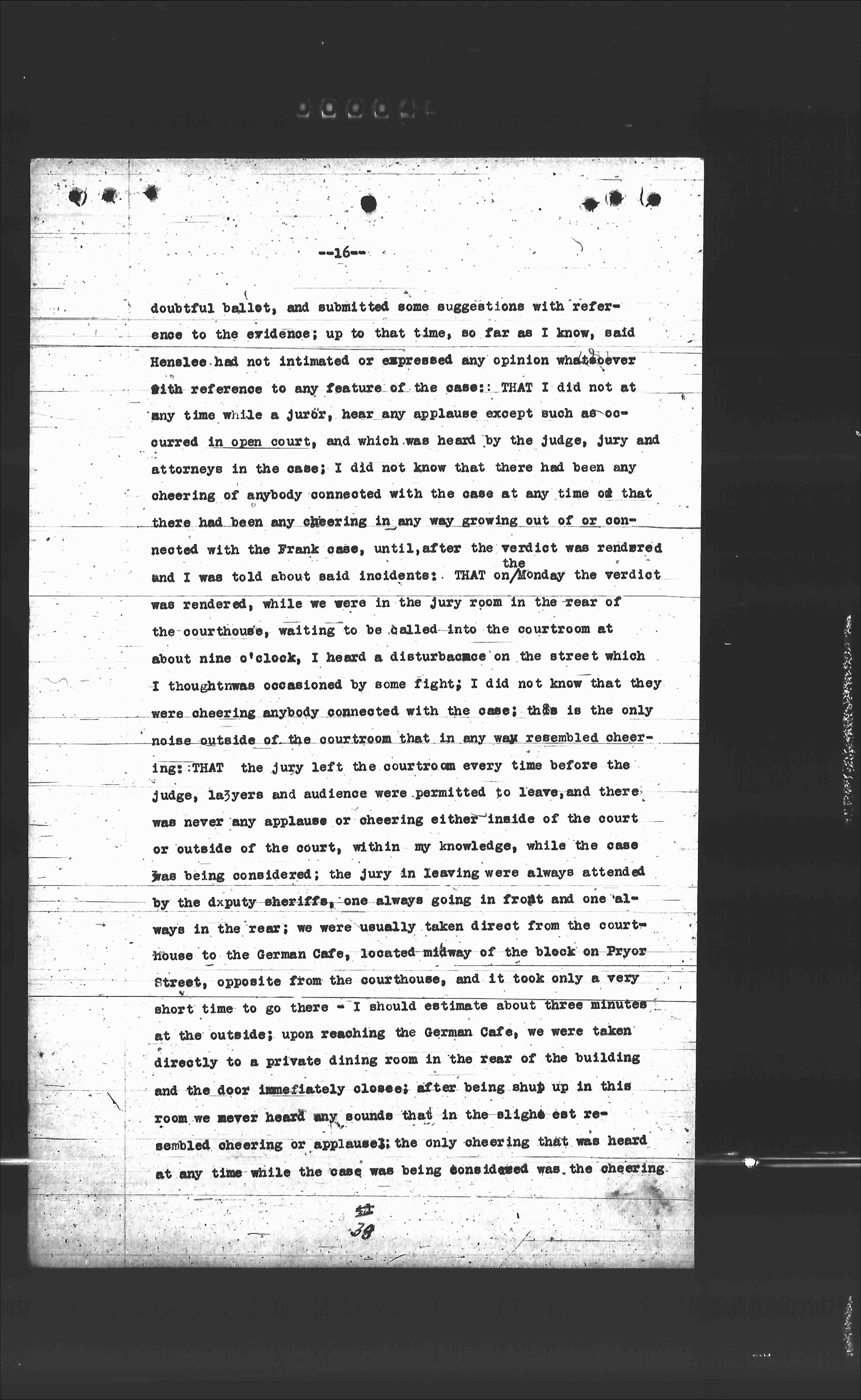 doubtful ballot, and submitted some suggestions with reference to the evidence; up to that time, so far as I know, said Henslee had not intimated or expressed any opinion whatsoever with reference to any feature of the case; and I did not at any time while a juror, hear any applause except such as occurred in open court, and which was heard by the Judge, Jury and attorneys in the case; I did not know that there had been any cheering of anybody connected with the case at any time or that there had been any cheering in any way growing out of or connected with the Frank case, until, after the verdict was rendered and I was told about said incidents. THAT on Monday the verdict was rendered, while we were in the jury room in the rear of the courthouse, waiting to be called into the courtroom at about nine o'clock, I heard a disturbance on the street which I thought was occasioned by some fight; I did not know that they were cheering anybody connected with the case; this is the only noise outside of the courtroom that in any way resembled cheering; THAT the jury left the courtroom every time before the Judge, lawyers and audience were permitted to leave, and there was never any applause or cheering either inside of the court or outside of the court, within my knowledge, while the case was being considered; the jury in leaving were always attended by the deputy sheriffs - one always going in front and one always in the rear; we were usually taken direct from the courthouse to the German Cafe, located midway of the block on Pryor Street, opposite from the courthouse, and it took only a very short time to go there - I should estimate about three minutes at the outside; upon reaching the German Cafe, we were taken directly to a private dining room in the rear of the building and the door immediately closed; after being shut up in this room we never heard any sounds that in the slightest resembled cheering or applause; the only cheering that was heard at any time while the case was being considered was the cheering