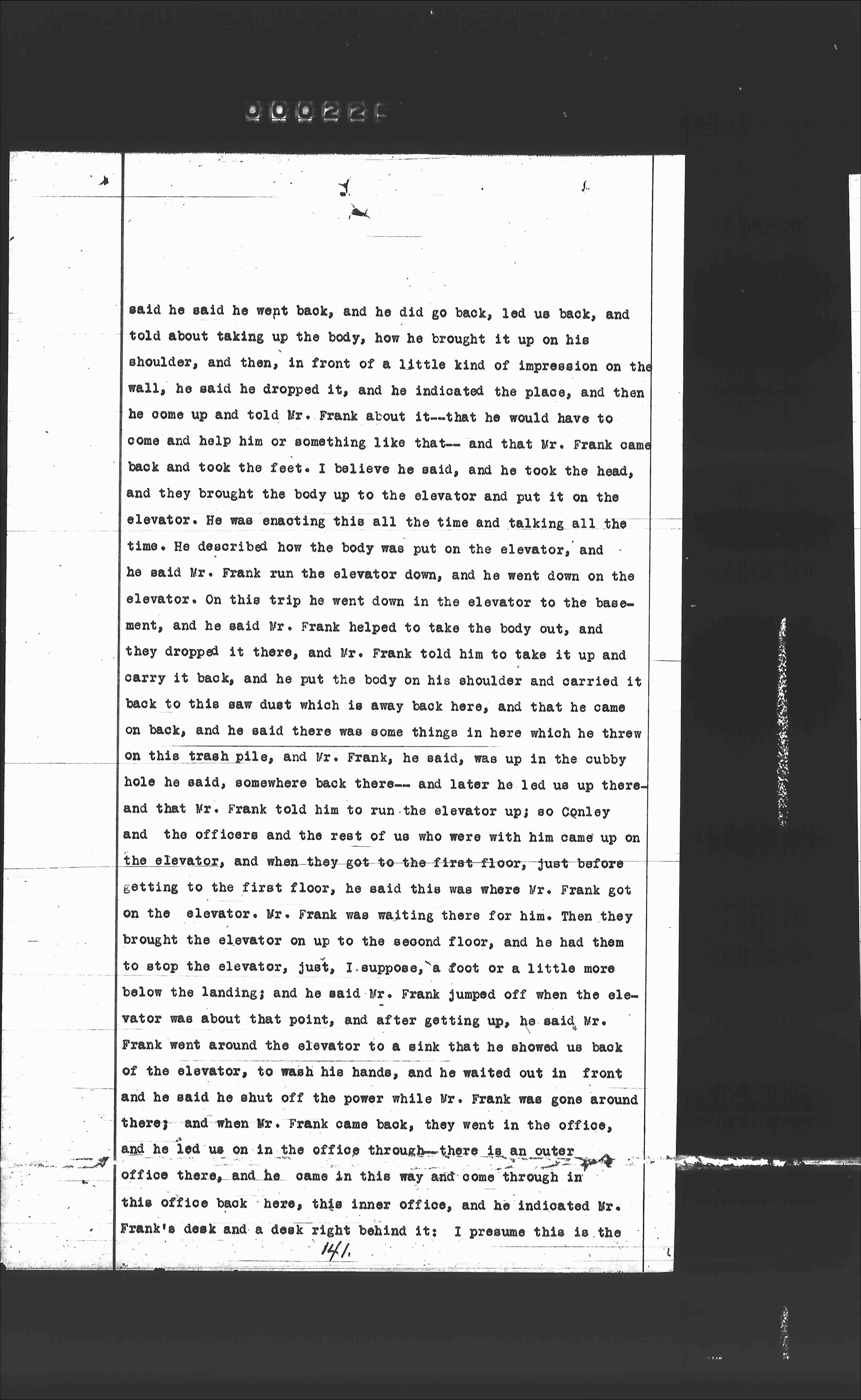 said he said he went back, and he did go back, led us back, and told about taking up the body, how he brought it up on his shoulder, and then, in front of a little kind of impression on the wall, he said he dropped it, and he indicated the place, and then he come up and told Mr. Frank about it—that he would have to come and help him or something like that—and that Mr. Frank came back and took the feet. I believe he said, and he took the head, and they brought the body up to the elevator and put it on the elevator. He was enacting this all the time and talking all the time. He described how the body was put on the elevator, and he said Mr. Frank run the elevator down, and he went down on the elevator. On this trip he went down in the elevator to the basement, and he said Mr. Frank helped to take the body out, and they dropped it there, and Mr. Frank told him to take it up and carry it back, and he put the body on his shoulder and carried it back to this saw dust which is away back here, and that he came on back, and he said there was some things in here which he threw on this trash pile, and Mr. Frank, he said, was up in the cubby hole he said, somewhere back there—and later he led us up there—and that Mr. Frank told him to run the elevator up, so Conley and the officers and the rest of us who were there came up on the elevator, and when they got to the first floor, just before getting to the first floor, he said this was where Mr. Frank got on the elevator. Mr. Frank was waiting there for him. Then they brought the elevator on up to the second floor, and he had them to stop the elevator, just, I suppose, a foot or a little more below the landing, and he said Mr. Frank jumped off when the elevator was about that point, and after getting up, he said Mr. Frank went around the elevator to a sink that he showed us back of the elevator, to wash his hands, and he waited out in front and he said he shut off the power while Mr. Frank was gone around there, and when Mr. Frank came back, they went in the office, and he led us on in the office through—there is an outer office there, and he came in this way and come through in this office back here, this inner office, and he indicated Mr. Frank's desk and a desk right behind it; I presume this is the