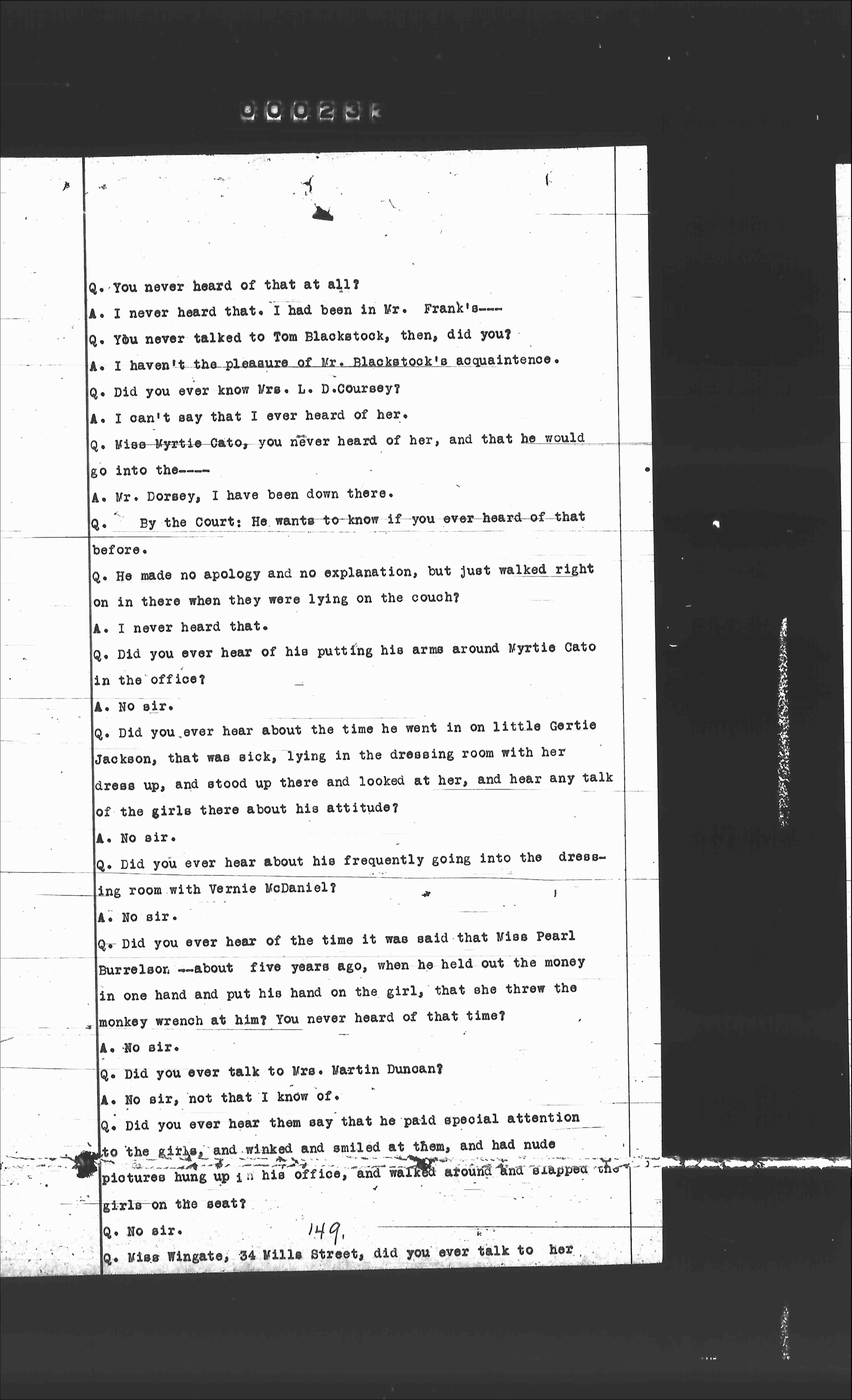 Q: Did you ever hear of his putting his arms around Myrtle Cato