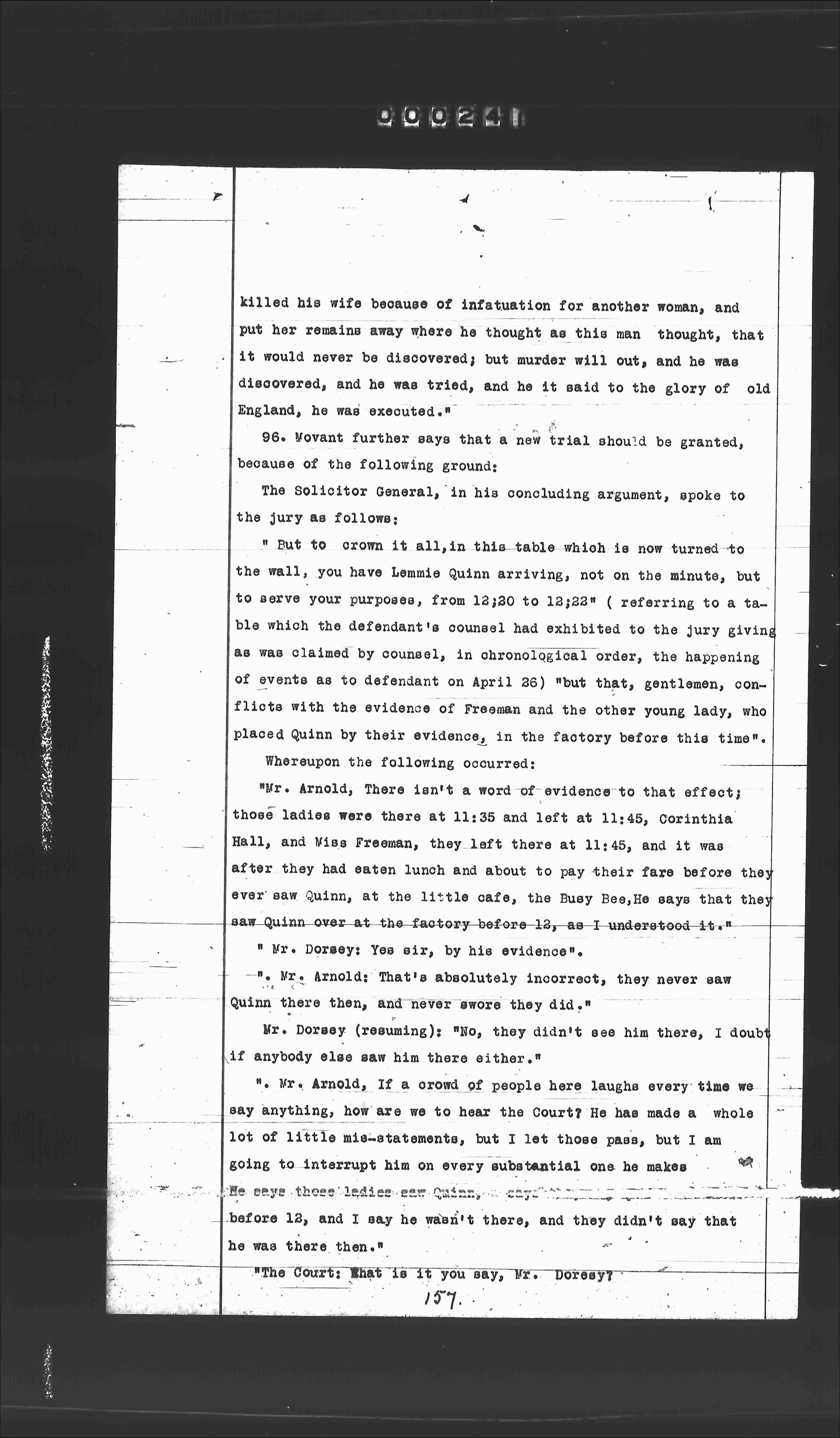 "Mr. Arnold, If a crowd of people here laugh every time we say anything, how are we to hear the Court? He has made a whole lot of little mis-statements, but I let those pass, but I am going to interrupt him on every substantial one he makes He says those ladies saw Quinn before 12, and I say he wasn't there, and they didn't say that he was there then."
