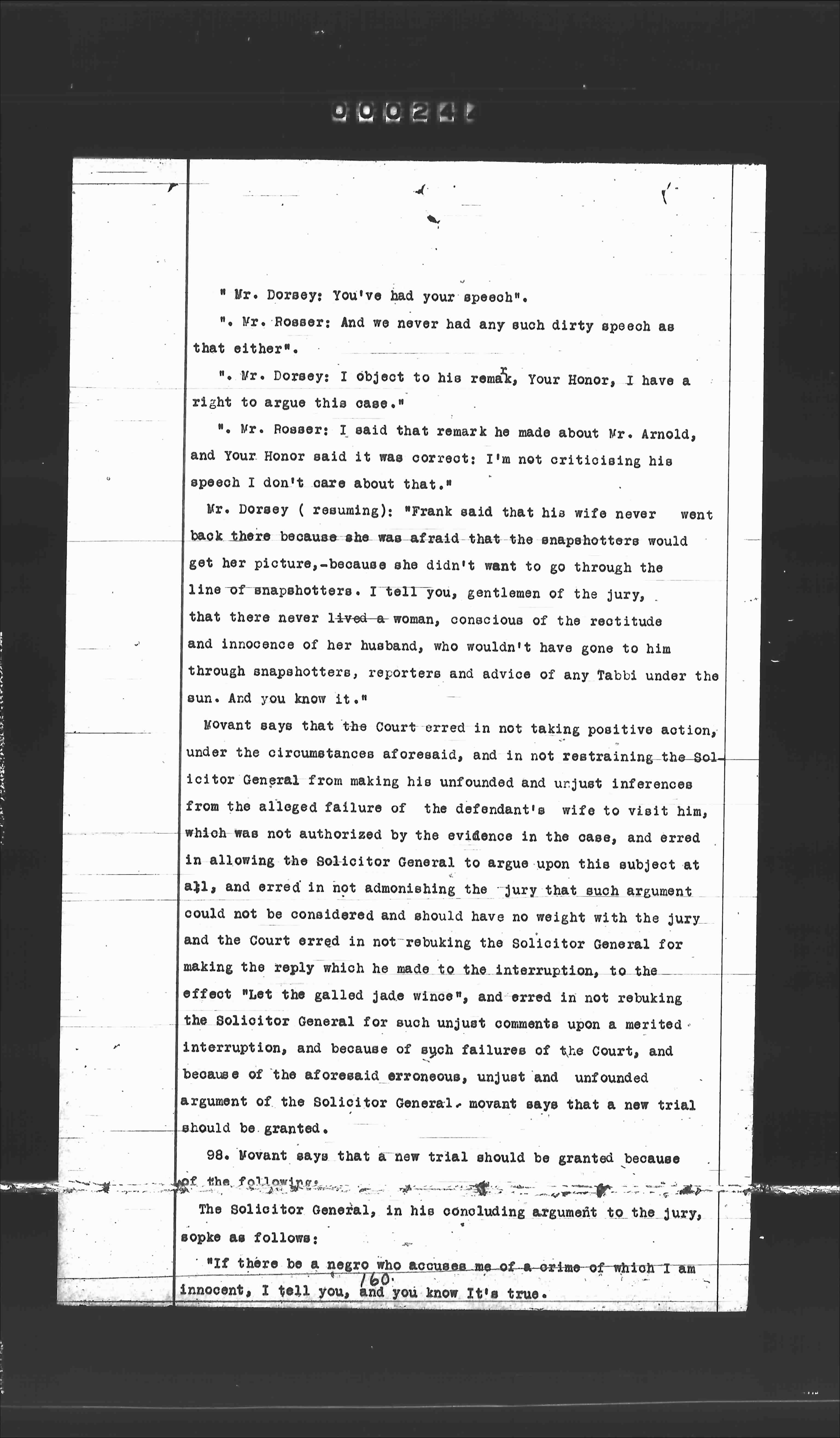 Mr. Dorsey (resuming): "Frank said that his wife never went back there because she was afraid that the snapshooters would get her picture,-because she didn't want to go through the line of snapshooters. I tell you, Gentlemen of the Jury, that there never lived-a woman, conscious of the rectitude and innocence of her husband, who wouldn't have gone to him through snapshooters, reporters and advice of any Rabbi under the sun. And you know it."
