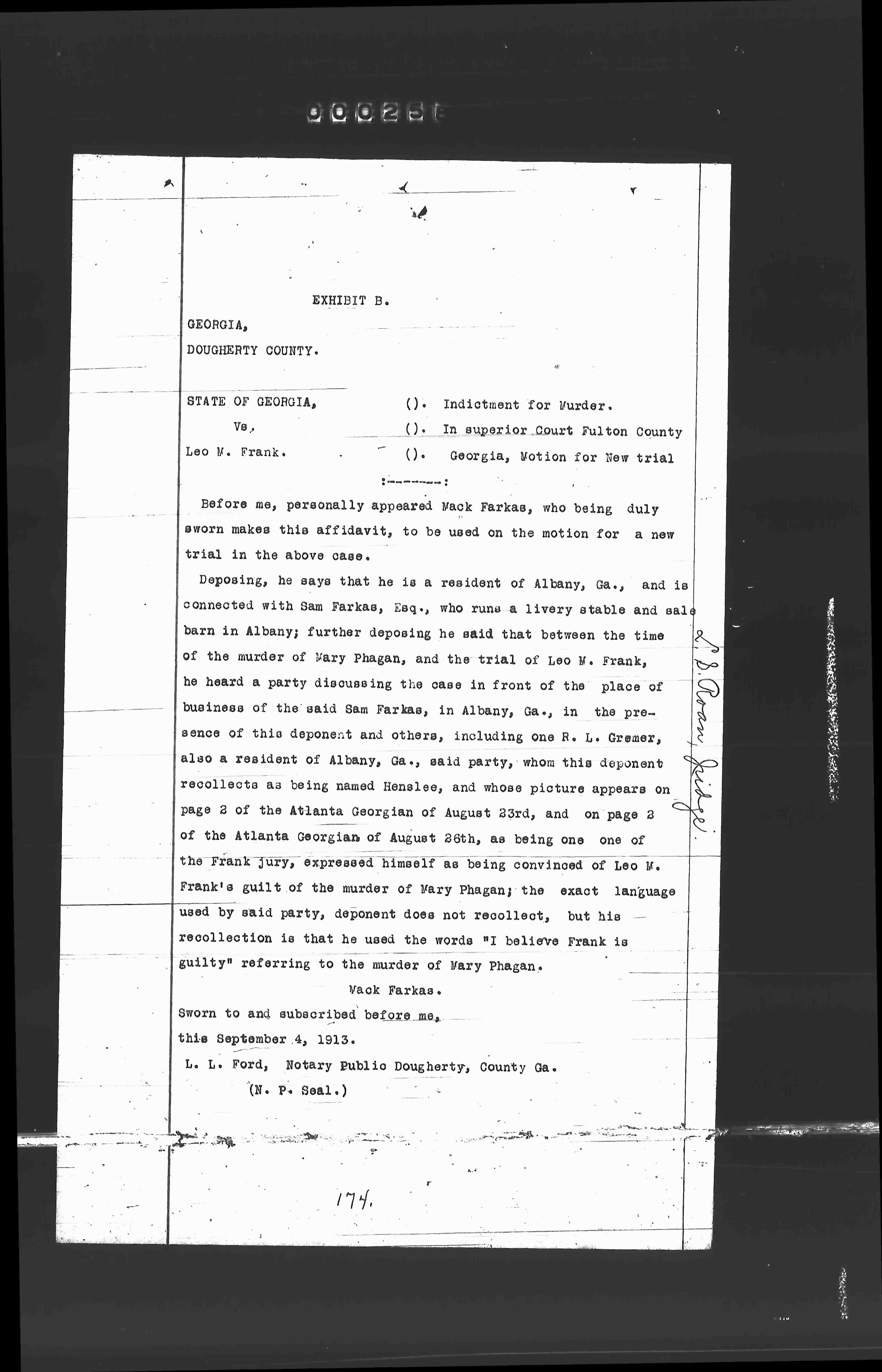 Deposing, he says that he is a resident of Albany, Ga., and is connected with Sam Farkas, Esq., who runs a livery stable and sale barn in Albany; further deposing he said that between the time of the murder of Mary Phagan, and the trial of Leo M. Frank, he heard a party discussing the case in front of the place of business of the said Sam Farkas, in Albany, Ga., in the presence of this deponent and others, including one R. L. Gremer, also a resident of Albany, Ga., said party, whom this deponent recollects as being named Henslee, and whose picture appears on page 2 of the Atlanta Georgian of August 26th, and on page 2 of the Atlanta Georgian of August 28th, 1913, being one of the Frank Jury, expressed himself as being convinced of Leo M. Frank's guilt of the murder of Mary Phagan; the exact language used by said party, deponent does not recollect, but his recollection is that he used the words "I believe Frank is guilty" referring to the murder of Mary Phagan.