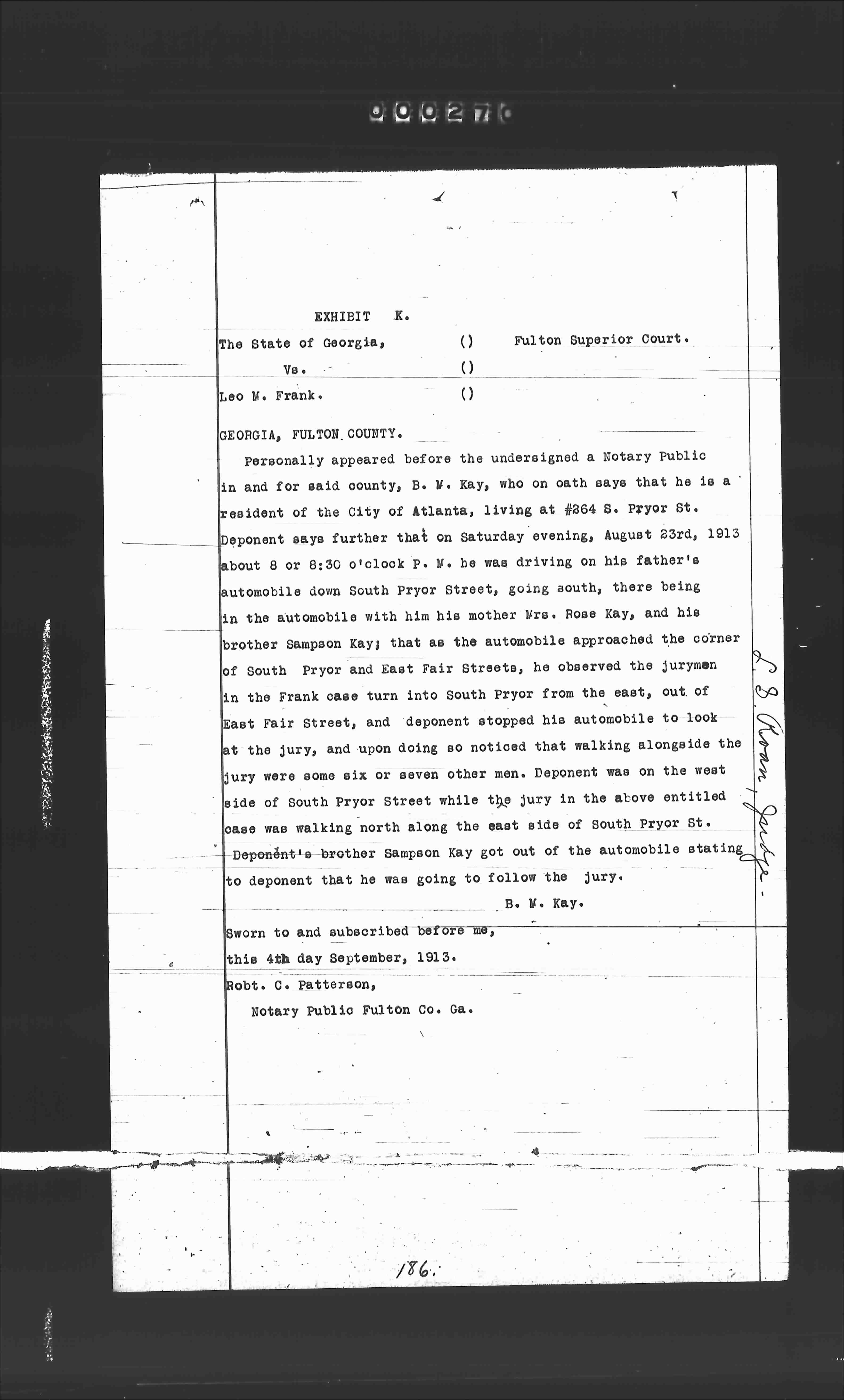 Personally appeared before the undersigned a Notary Public in and for said county, B. W. Kay, who on oath says that he is a resident of the City of Atlanta, living at #364 S. Pryor St. Deponent says further that on Saturday evening, August 23rd, 1913 about 8 or 8:30 o'clock P. M. he was driving on his father's automobile down South Pryor Street, going south, there being in the automobile with him his mother Mrs. Rose Kay, and his brother Sampson Kay; that as the automobile approached the corner of South Pryor and East Fair Streets, he observed the Jurymen in the Frank case turn into South Pryor from the east, out of East Fair Street, and deponent stopped his automobile to look at the jury, and upon doing so noticed that walking alongside the jury were some six or seven other men. Deponent was on the west side of South Pryor Street while the jury in the above entitled case was walking north along the east side of South Pryor St.
