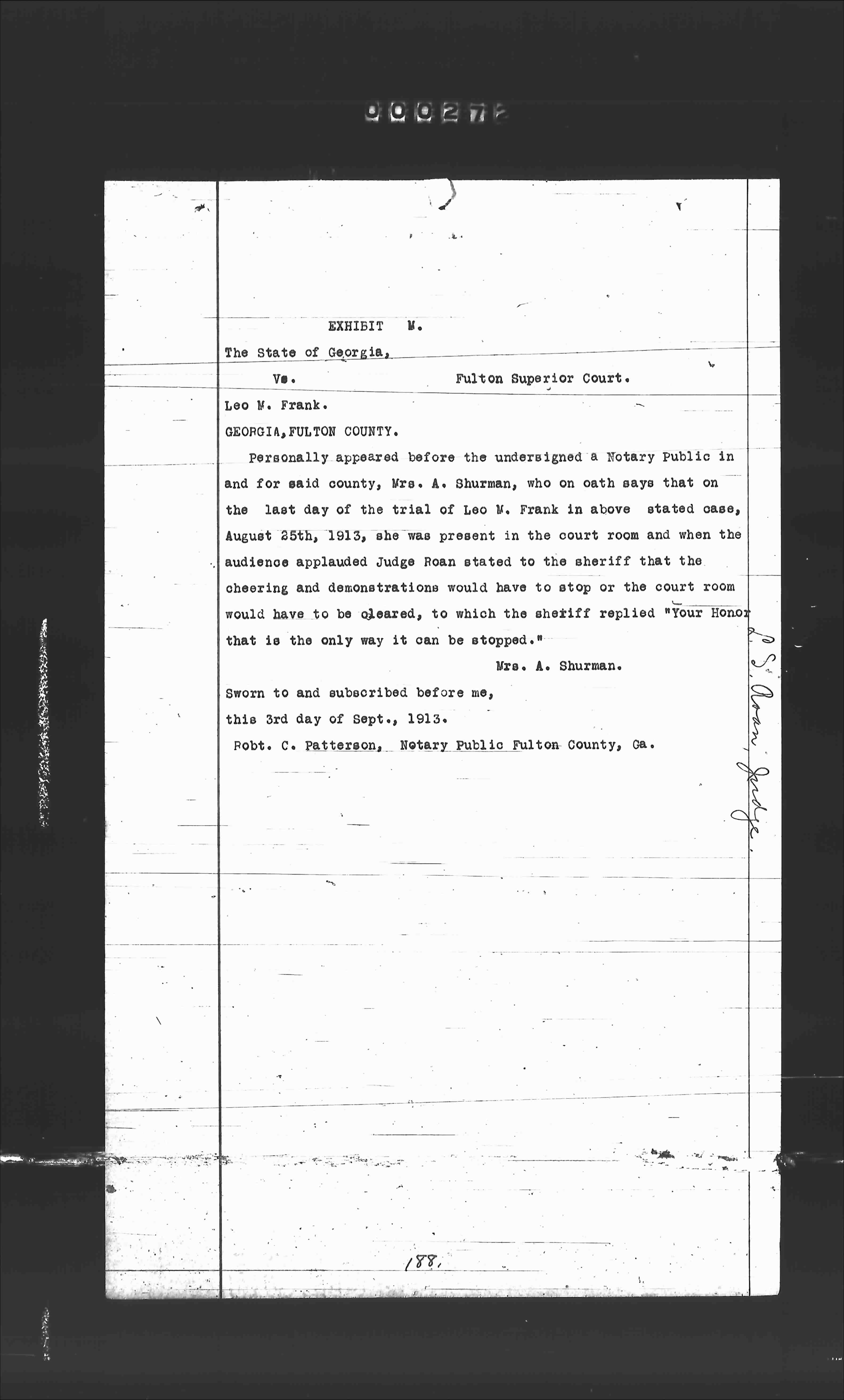 Personally appeared before the undersigned a Notary Public in and for said county, Mrs. A. Shurman, who on oath says that on the last day of the trial of Leo M. Frank in above stated case, August 25th, 1913, she was present in the court room and when the audience applauded Judge Roan stated to the sheriff that the cheering and demonstrations would have to stop or the court room would have to be cleared, to which the sheriff replied "Your Honor that is the only way it can be stopped."