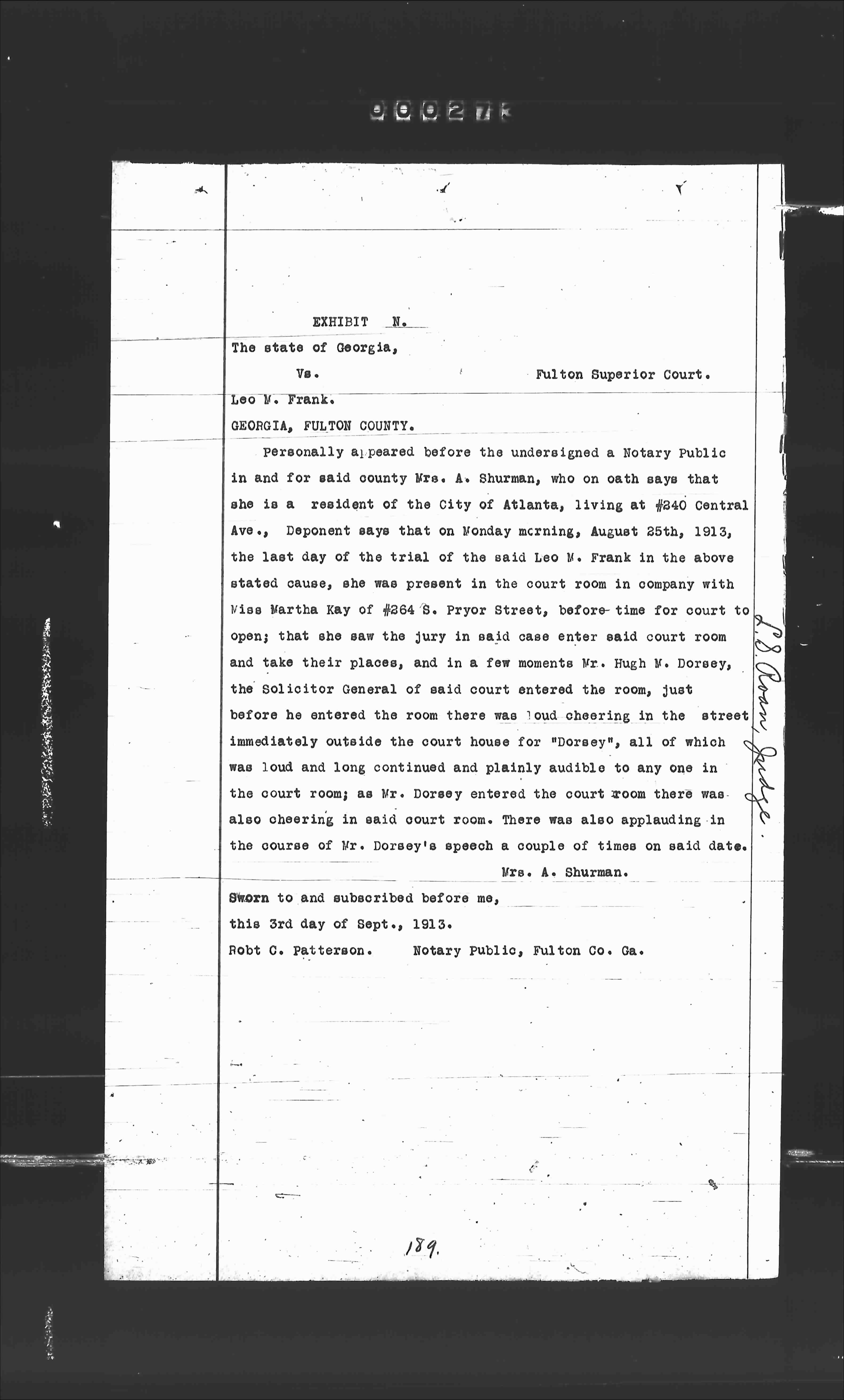 Personally appeared before the undersigned a Notary Public in and for said county Mrs. A. Shurman, who on oath says that she is a resident of the City of Atlanta, living at #240 Central Ave., Deponent says that on Monday morning, August 25th, 1913, the last day of the trial of the said Leo M. Frank in the above stated cause, she was present in the court room in company with Miss Martha Kay of #264 S. Pryor Street, before time for court to open that she saw the jury in said case enter said court room and take their places, and in a few moments Mr. Hugh M. Dorsey, the Solicitor General of said court entered the room, just before he entered the room there was loud cheering in the street immediately outside the court house for "Dorsey", all of which was loud and long continued and plainly audible to any one in the court room; as Mr. Dorsey entered the court room there was also cheering in said court room, there was also applauding in the course of Mr. Dorsey's speech a couple of times on said date.
