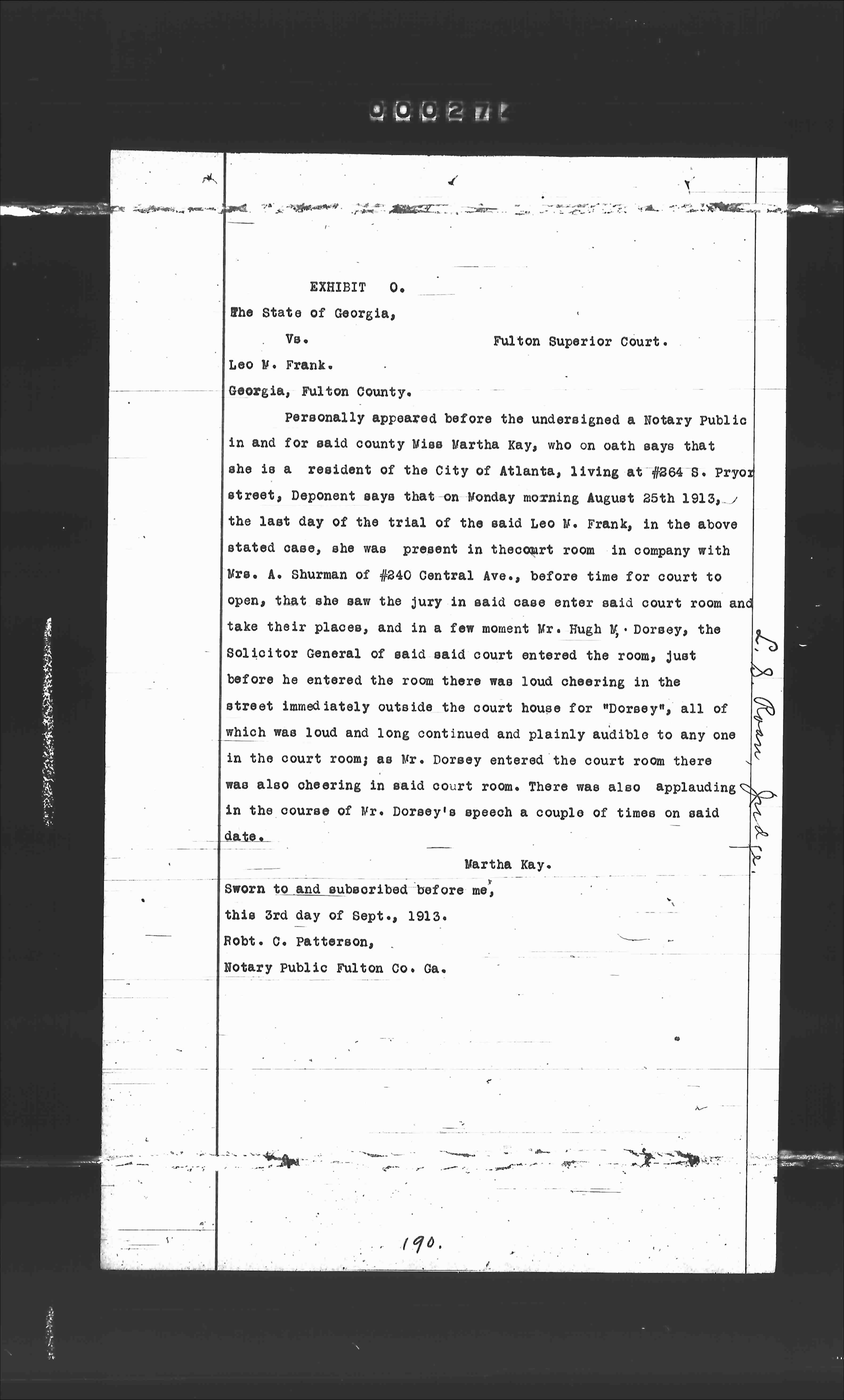 Personally appeared before the undersigned a Notary Public in and for said county Miss Martha Kay, who on oath says that she is a Resident of the City of Atlanta, living at 264 S. Pryor street, Deponent says that on Monday morning August 28th 1913, the last day of the trial of the said Leo M. Frank, in the above stated case, she was present in the court room in company with Mrs. A. Shurman of 240 Central Ave., before time for court to open, that she saw the jury in said case enter said court room and take their places, and in a few moment Mr. Hugh M. Dorsey, the Solicitor General of said said court entered the room, just before he entered the room there was loud cheering in the street immediately outside the court house for "Dorsey", all of which was loud and long continued and plainly audible to any one in the court room as Mr. Dorsey entered the court room there was also cheering in said room. There was also applauding in the course of Mr. Dorsey's speech a couple of times on said date.
