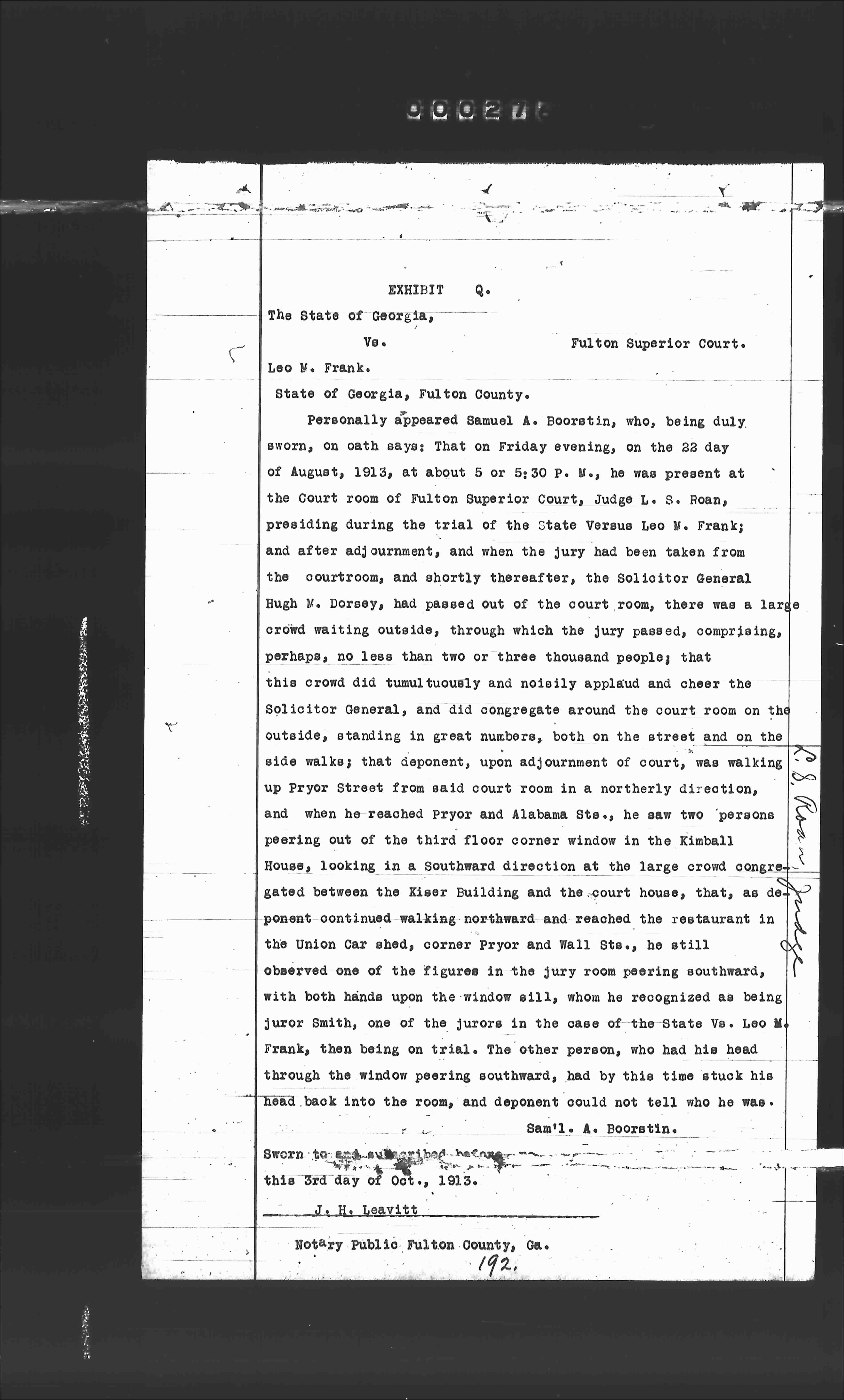 Personally appeared Samuel A. Boorstin, who, being duly sworn, on oath says: That on Friday evening, on the 22 day of August, 1913, at about 5 or 5:30 P. M., he was present at the Court room of Fulton Superior Court, Judge L. S. Roan, presiding during the trial of the State Versus Leo M. Frank; and after adjournment, and when the jury had been taken from the courtroom, and shortly thereafter, the Solicitor General Hugh M. Dorsey, had passed out of the court room, there was a large crowd waiting outside, through which the jury passed, comprising, perhaps, no less than two or three thousand people; that this crowd did tumultuously and noisily applaud and cheer the Solicitor General, and did congregate around the court room on the outside, standing in great numbers, both on the street and on the side walks; that deponent, upon adjournment of court, was walking up Pryor Street from said court room in a northerly direction, and when he reached Pryor and Alabama Sts., he saw two persons peering out of the third floor corner window in the Kimball House, looking in a Southwest direction at the large crowd congregated between the Kiser Building and the court house, that, as deponent continued walking northward and reached the restaurant in the Union Car shed, corner Pryor and Wall Sts., he still observed one of the figures in the jury room peering southward, with both hands upon the window sill, whom he recognized as being Juror Smith, one of the Jurors in the case of the State Vs. Leo M. Frank, then being on trial. The other person, who had his head through the window peering southward, had by this time stuck his head back into the room, and deponent could not tell who he was.