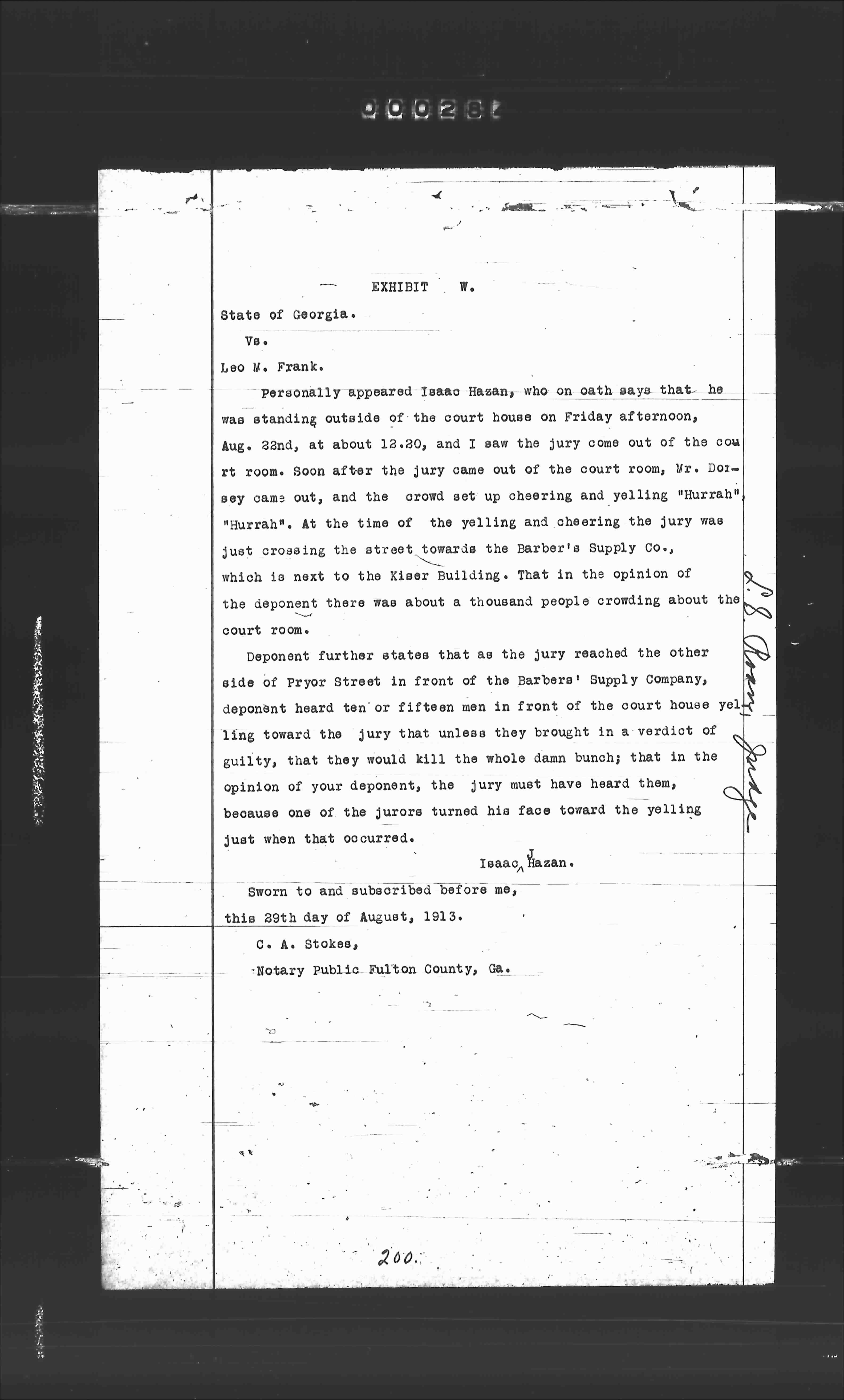 Personally appeared Isaac Haas who on oath says that he was standing outside of the court house on Friday afternoon, Aug. 22nd, at about 12.30, and I saw the jury come out of the court room. Soon after the jury came out of the court room, Mr. Dor- sey came out, and the crowd set up cheering and yelling "Hurrah" "Hurrah". At the time of the yelling and cheering the jury was just crossing the street toward the Barber's Supply Co., which is next to the Kiser Building. That in the opinion of the deponent there was about a thousand people crowding about the court room.