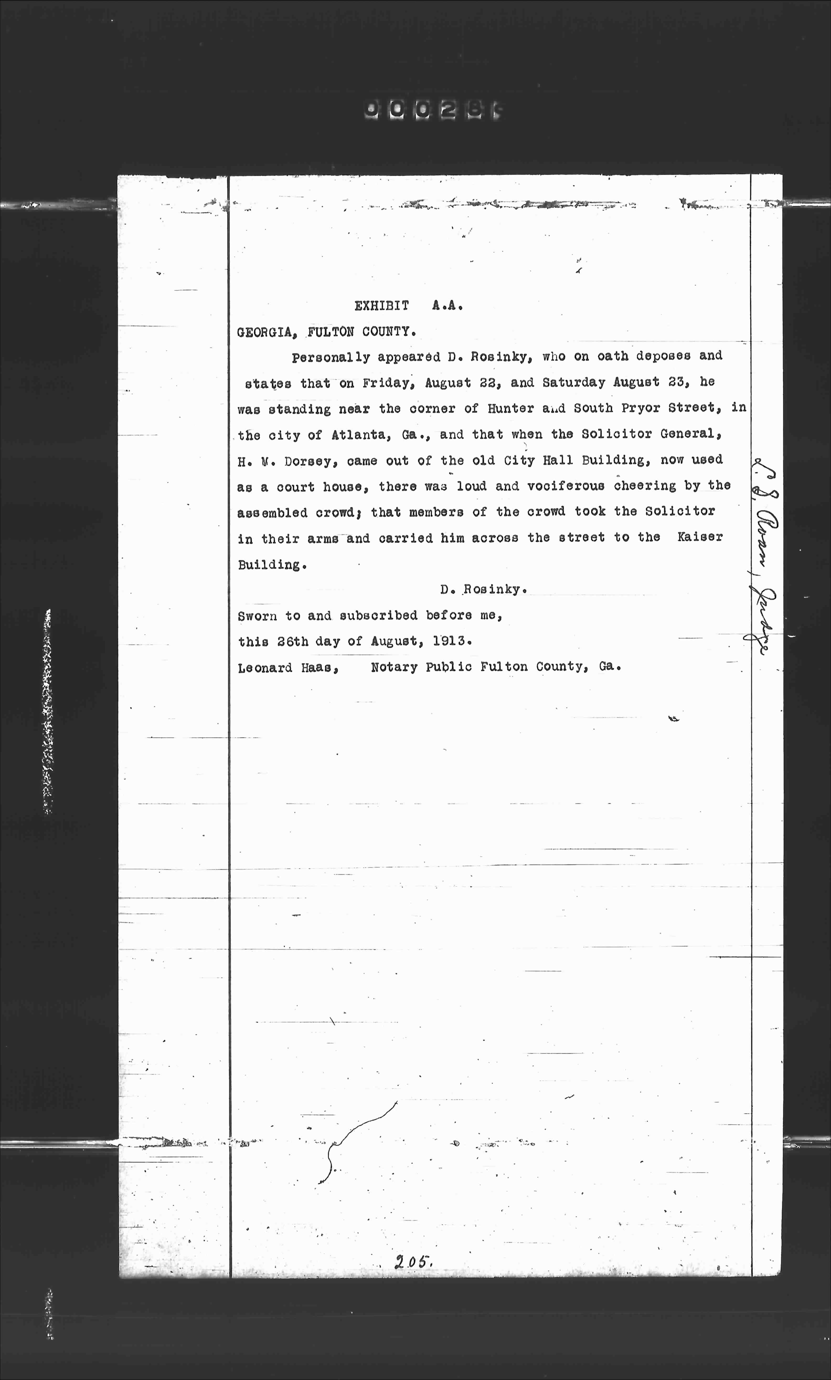 Personally appeared D. Rosinsky, who on oath deposes and states that on Friday, August 22nd and Saturday August 23, he was standing near the corner of Hunter and South Pryor Street, in the city of Atlanta, Ga., and that when the Solicitor General, H. W. Dorsey, came out of the old City Hall Building, now used as a court house, there was loud and vociferous cheering by the assembled crowd; that members of the crowd took the Solicitor in their arms and carried him across the street to the Kaiser Building.