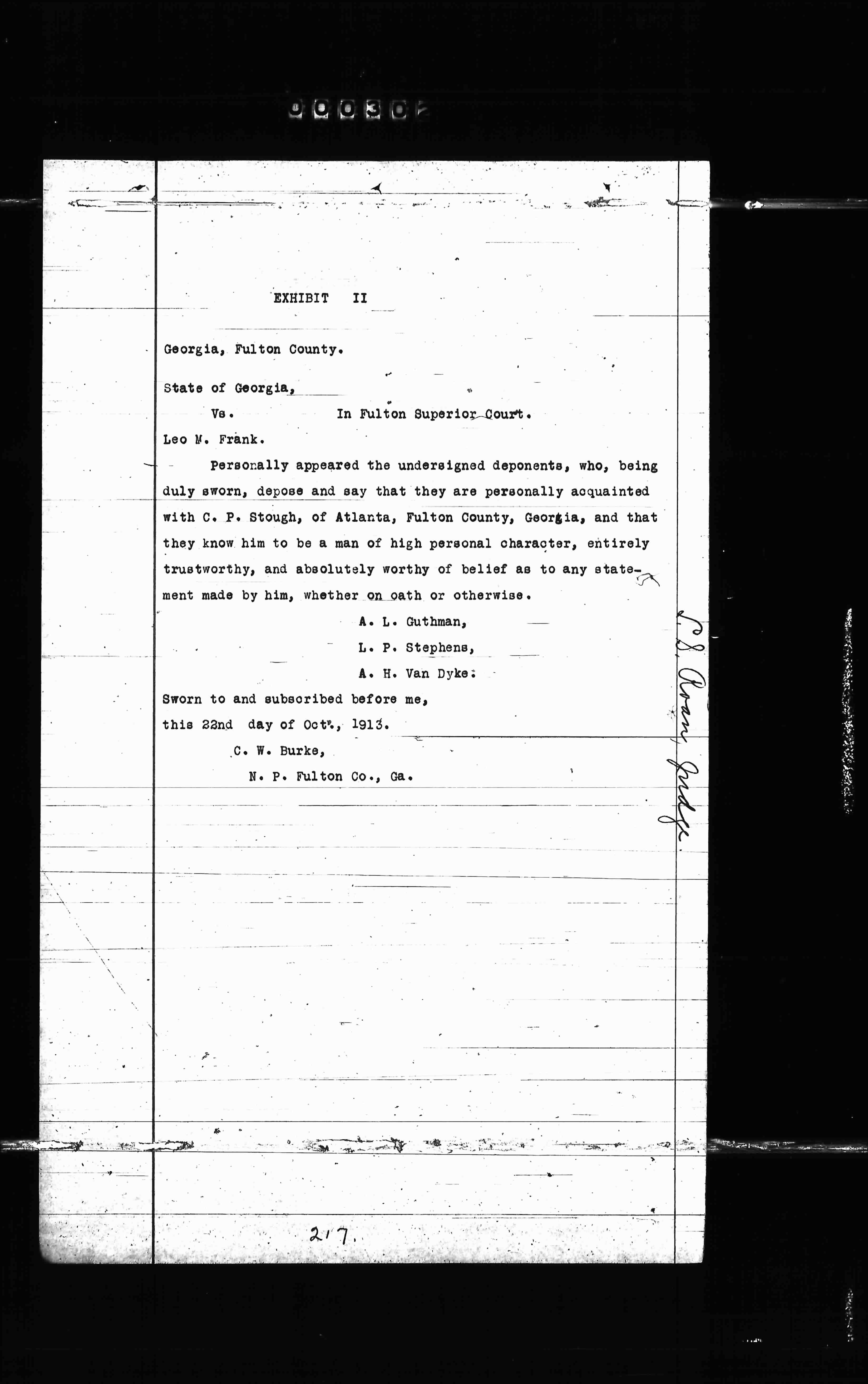 Personally appeared the undersigned deponents, who, being duly sworn, depose and say that they are personally acquainted with C. P. Stough, of Atlanta, Fulton County, Georgia, and that they know him to be a man of high personal character, entirely trustworthy, and absolutely worthy of belief as to any statement made by him, whether on oath or otherwise.