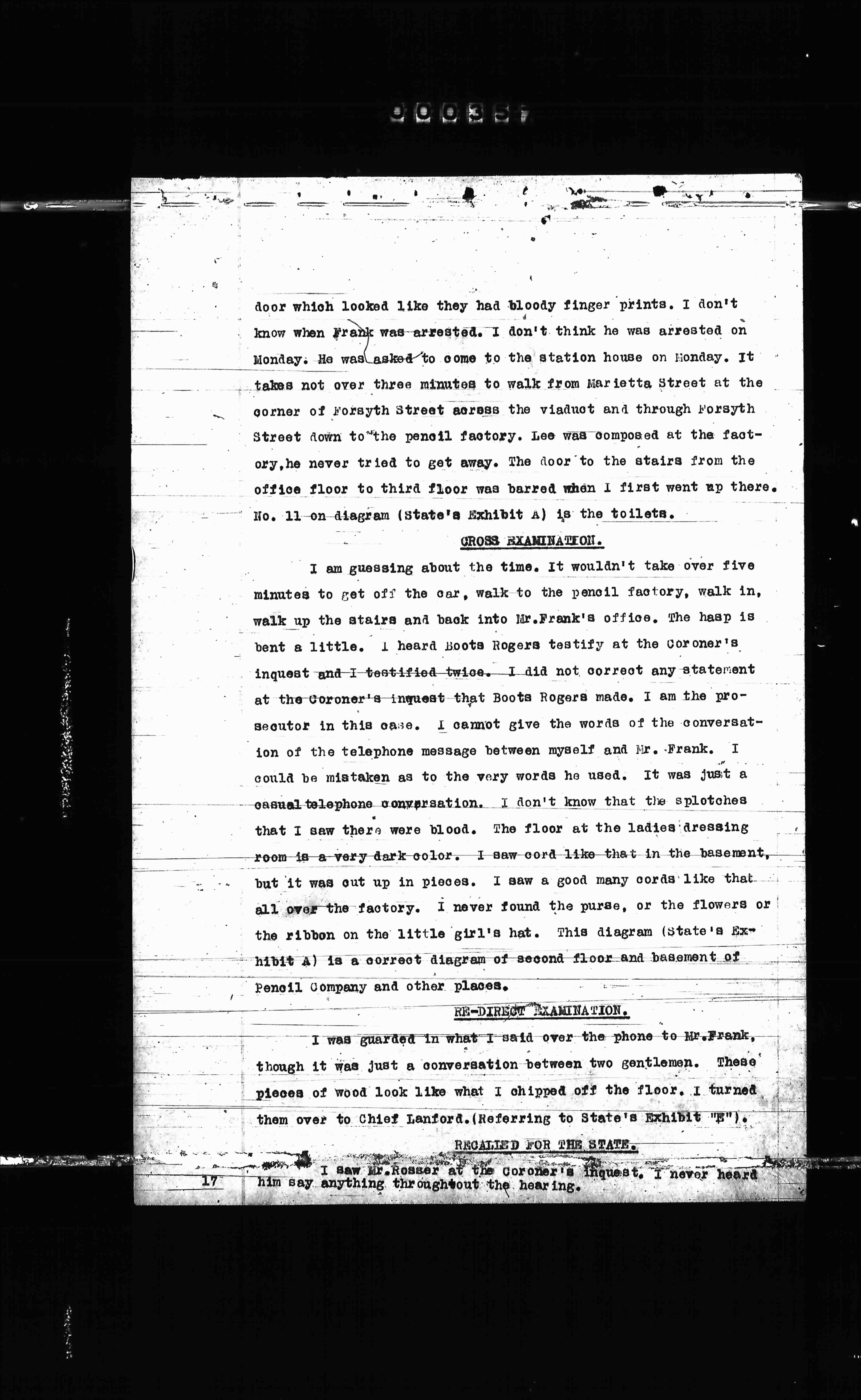 door which looked like they had bloody finger prints. I don't know when Frank was arrested. I don't think he was arrested on Monday. He was asked to come to the station house on Monday. It takes not over three minutes to walk from Marietta Street at the corner of Forsyth Street across the viaduct and through Forsyth Street down to the pencil factory. Lee was composed at the factory; he never tried to get away. The door to the stairs from the office floor to third floor was barred when I first went up there. No. 11 on diagram (State's Exhibit A) is the toilets.