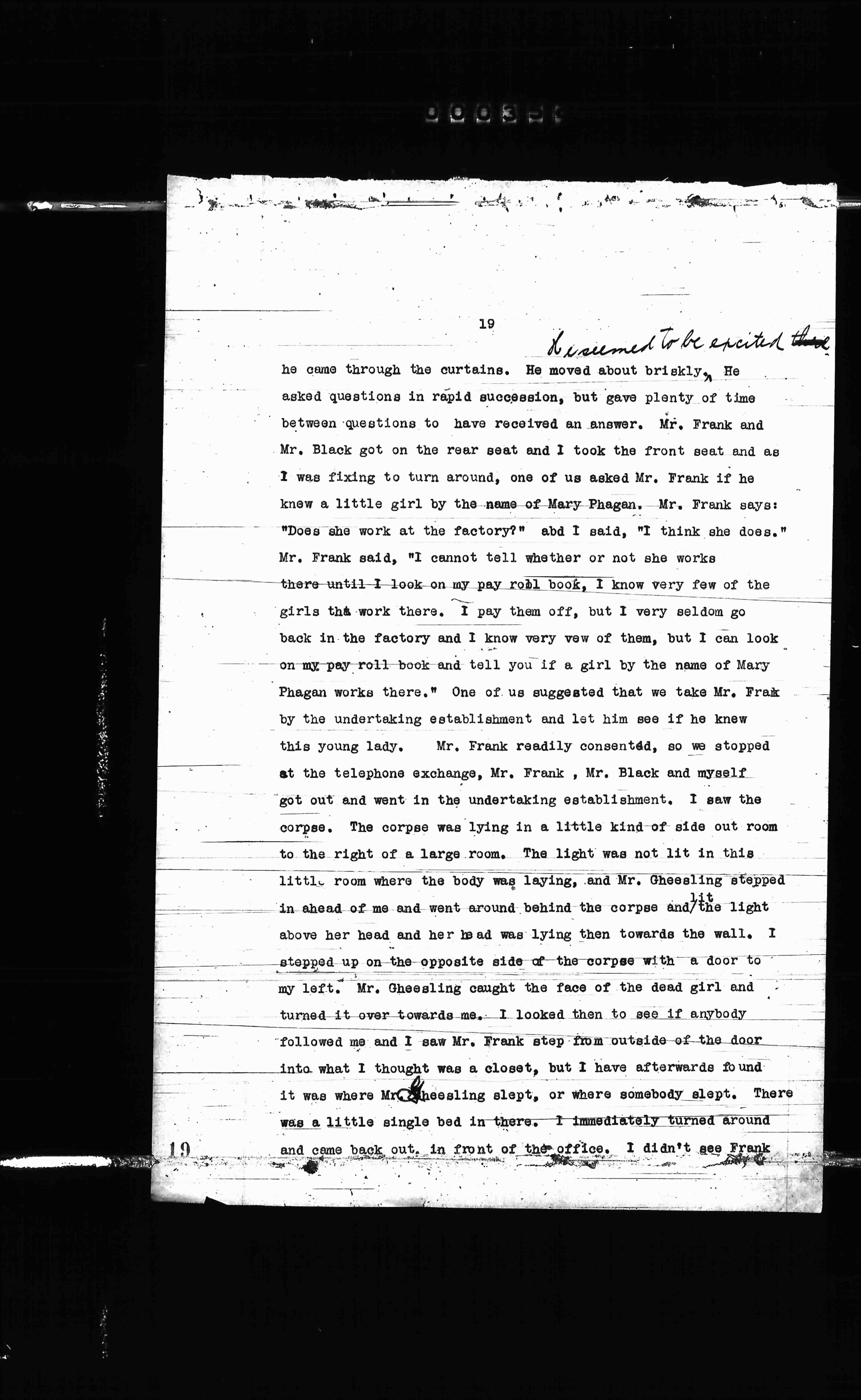 he came through the curtains. He seemed about briskly. He asked questions in rapid succession, but gave plenty of time between questions to have received an answer. Mr. Frank and Mr. Black got on the rear seat and I took the front seat and as I was fixing to turn around, one of us asked Mr. Frank if he knew a little girl by the name of Mary Phagan. Mr. Frank says: "Does she work at the factory?" and I said, "I think she does." Mr. Frank said, "I cannot tell whether or not she works there until I look on my pay roll book, I know very few of the girls that work there. I pay them off, but I very seldom go back in the factory and I know very few of them, but I can look on my pay roll book and tell you if a girl by the name of Mary Phagan works there." One of us suggested that we take Mr. Frank by the undertaking establishment and let him see if he knew this young lady. Mr. Frank readily consented, so we stopped at the telephone exchange, Mr. Frank, Mr. Black and myself got out and went in the undertaking establishment. I saw the corpse. The corpse was laying in a little kind of side out room to the right of a large room. The light was not lit in this little room where the body was laying, and Mr. Gheesling stepped in ahead of me and went around behind the corpse and the light above her head and her head was lying then towards the wall. I stepped up on the opposite side of the corpse with a door to my left. Mr. Gheesling caught the face of the dead girl and turned it over towards me. I looked then to see if anybody followed me and I saw Mr. Frank step from outside of the door into what I thought was a closet, but I have afterwards found it was where Mr. Gheesling slept, or where somebody slept. There was a little single bed in there. I immediately turned around and came back out. In front of the office, I didn't see Frank
