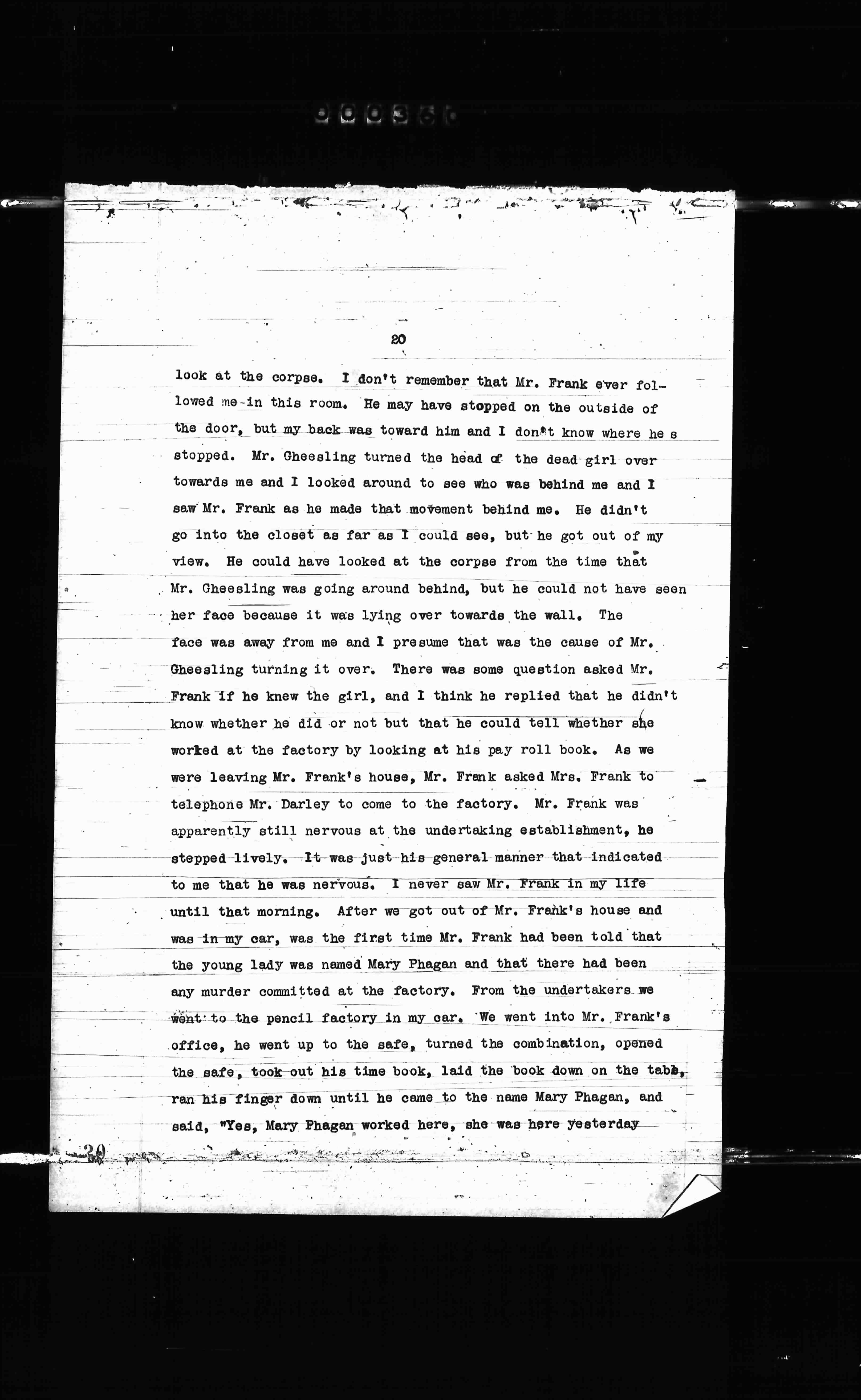 look at the corpse. I don't remember that Mr. Frank ever followed me in this room. He may have stopped on the outside of the door, but my back was toward him and I don't know where he stopped. Mr. Gheesling turned the head of the dead girl over towards me and I looked around to see who was behind me and I saw Mr. Frank as he made that movement behind me. He didn't go into the closet as far as I could see, but he got out of my view. He could have looked at the corpse from the time that Mr. Gheesling was going around behind, but he could not have seen her face because it was lying over towards the wall. The face was away from me and I presume that was the cause of Mr. Gheesling turning it over. There was some question asked Mr. Frank if he knew the girl, and I think he replied that he didn't know whether he did or not but that he could tell whether she worked at the factory by looking at his pay roll book. As we were leaving Mr. Frank's house, Mr. Frank asked Mrs. Frank to telephone Mr. Darley to come to the factory. Mr. Frank was apparently still nervous at the undertaker's establishment, he stepped lively. It was just his general manner that indicated to me that he was nervous. I never saw Mr. Frank in my life until that morning. After we got out of Mr. Frank's house and was in my car, was the first time Mr. Frank had been told that the young lady was named Mary Phagan and that there had been any murder committed at the factory. From the undertaker's we went to the pencil factory in my car. We went into Mr. Frank's office, he went up to the safe, turned the combination, opened the safe, took out his time book, laid the book down on the table, ran his finger down until he came to the name Mary Phagan, and said, "Yes, Mary Phagan worked here, she was here yesterday