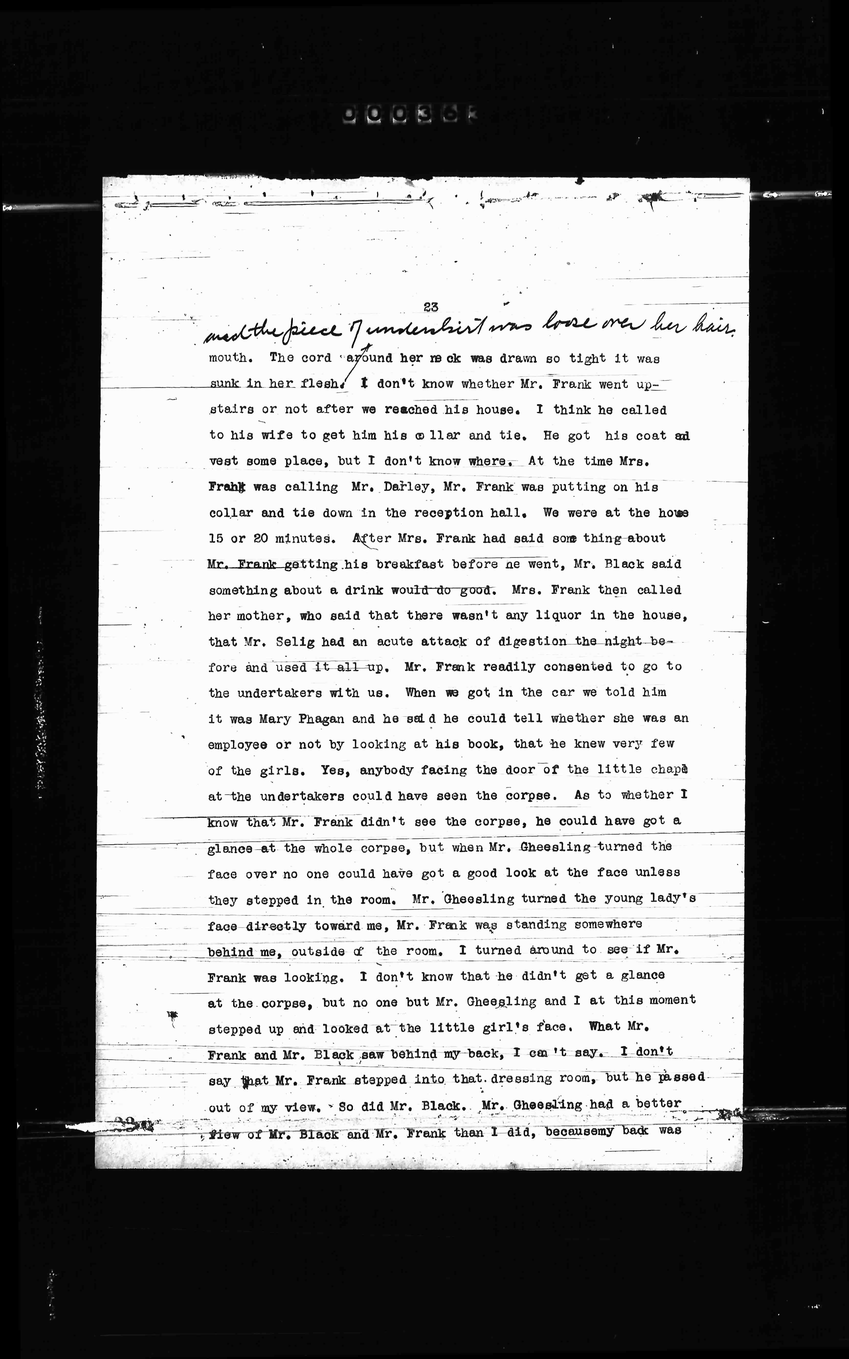 and the piece of undershirt was broke me her hair mouth. The cord around her neck was drawn so tight it was sunk in her flesh. I don't know whether Mr. Frank went upstairs or not after we reached his house. I think he called to his wife to get him his collar and tie. He got his coat and vest some place, but I don't know where. At the time Mrs. Frank was calling Mr. Darley, Mr. Frank was putting on his collar and tie down in the reception hall. We were at the house 15 or 20 minutes. After Mrs. Frank had said some thing about Mr. Frank getting his breakfast before he went, Mr. Black said something about a drink would do good. Mrs. Frank then called her mother, who said that there wasn't any liquor in the house, that Mr. Selig had an acute attack of digestion the night before and used it all up. Mr. Frank readily consented to go to the undertakers with us. When we got in the car we told him it was Mary Phagan and he said he could tell whether she was an employee or not by looking at his book, that he knew very few of the girls. Yes, anybody facing the door of the little chapel at the undertakers could have seen the corpse. As to whether I know that Mr. Frank didn't see the corpse, he could have got a glance at the whole corpse, but when Mr. Gheesling turned the face over no one could have got a good look at the face unless they stepped in the room. Mr. Gheesling turned the young lady's face directly toward me, Mr. Frank was standing somewhere behind me, outside of the room. I turned around to see if Mr. Frank was looking. I don't know that he didn't get a glance at the corpse, but no one but Mr. Gheesling and I at this moment stepped up and looked at the little girl's face. What Mr. Frank and Mr. Black saw behind my back, I can't say. I don't say that Mr. Frank stepped into that dressing room, but he passed out of my view. So did Mr. Black. Mr. Gheesling had a better view of Mr. Black and Mr. Frank than I did, because my back was