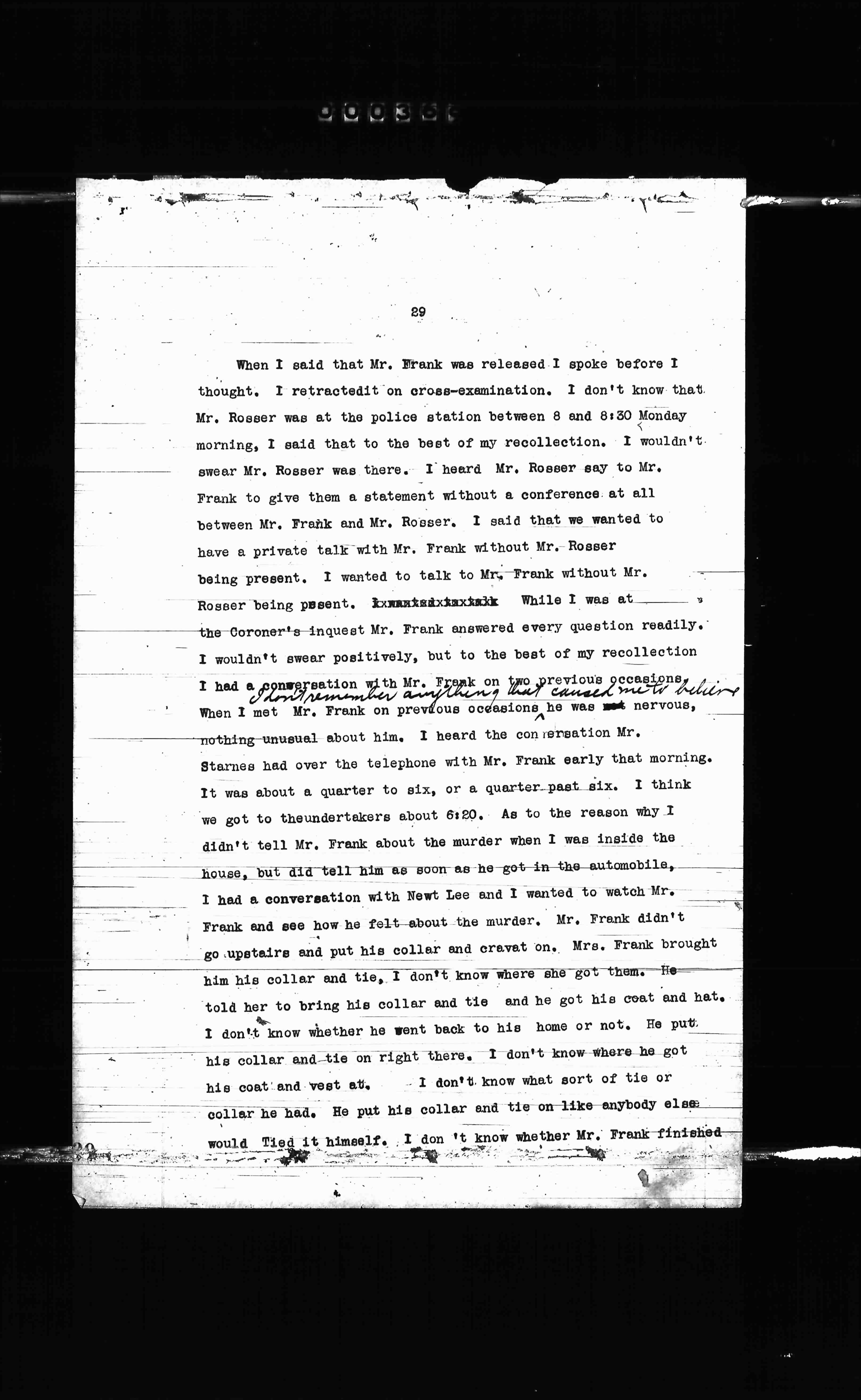 When I said that Mr. Frank was released I spoke before I thought. I retractedit on cross-examination. I don't know that Mr. Roaser was at the police station between 8 and 8:30 Monday morning, I said that to the best of my recollection. I wouldn't swear Mr. Rosser was there. I heard Mr. Rosser say to Mr. Frank to give them a statement without a conference at all between Mr. Frank and Mr. Rosser. I said that we wanted to have a private talk with Mr. Frank without Mr. Rosser being present. I wanted to talk to Mr. Frank without Mr. Rosser being present. Xxxxxxxxaxxx While I was at the Coroner's Inquest Mr. Frank answered every question readily. I wouldn't swear positively, but to the best of my recollection I had a conversation with Mr. Frank on two previous occasions. When I met Mr. Frank on previous occasions he was nervous, nothing unusual about him. I heard the conversation Mr. Starnes had over the telephone with Mr. Frank early that morning. It was about a quarter to six, or quarter past six. I think we got to the undertakers about 6:20. As to the reason why I didn't tell Mr. Frank about the murder while I was inside the house, but did tell him as soon as he got in the automobile, I had a conversation with Newt Lee and I wanted to watch Mr. Frank and see how he felt about the murder. Mr. Frank didn't go upstairs and put his collar and cravat on. Mrs. Frank brought him his collar and tie, I don't know where she got them. He told her to bring his collar and tie and he got his coat and hat. I don't know whether he went back in his home or not. He put his collar and tie on right there. I don't know where he got his coat and vest at. I don't know what sort of tie or collar he had. He put his collar and tie on like anybody else would. Tied it himself. I don't know whether Mr. Frank finished