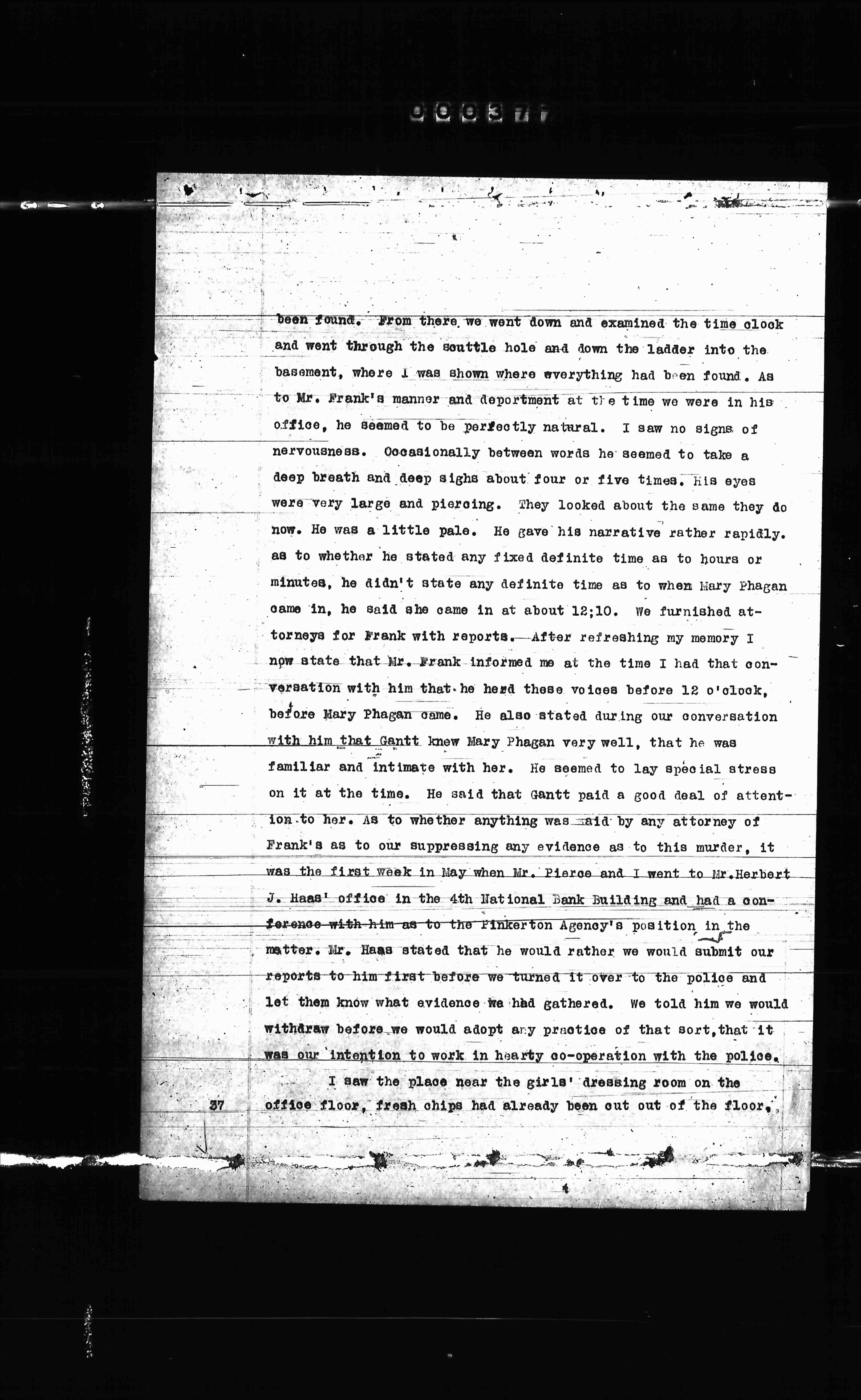 been found. From there we went down and examined the time clock and went through the south aisle and down the ladder into the basement, where I was shown that everything had been found. As to Mr. Frank's manner and deportment at the time we were in his office, he seemed to be perfectly natural. I saw no signs of nervousness. Occasionally between words he seemed to take a deep breath and deep sighs about four or five times. His eyes were very large and piercing. They looked about the same they do now. He was a little pale. He gave his narrative rather rapidly, as to whether he stated any fixed definite time as to hours or minutes, he didn't state any definite time as to when Mary Phagan came in, he said she came in at about 12.10. We furnished attorneys for Frank with reports. After refreshing my memory I now state that Mr. Frank informed me at the time I had that conversation with him that he heard these voices before 12 o'clock, before Mary Phagan came. He also stated during our conversation with him that Gantt knew Mary Phagan very well, that he was familiar and intimate with her. He seemed to lay special stress on it at the time. He said that Gantt paid a good deal of attention to her. As to whether anything was said by any attorney of Frank's as to our suppressing evidence as to this murder, it was the first week in May when Mr. Pierce and I went to Mr. Herbert J. Haas' office in the 4th National Bank Building and had a conference with him as to the Pinkerton Agency's position in the matter. Mr. Haas stated that he would rather we would submit our reports to him first before we turned it over to the police and let them know what evidence we had gathered. We told him we would withdraw before we would adopt any practice of that sort, that it was our intention to work in hearty co-operation with the police. I saw the place near the girls' dressing room on the office floor, fresh chips had already been cut out of the floor.