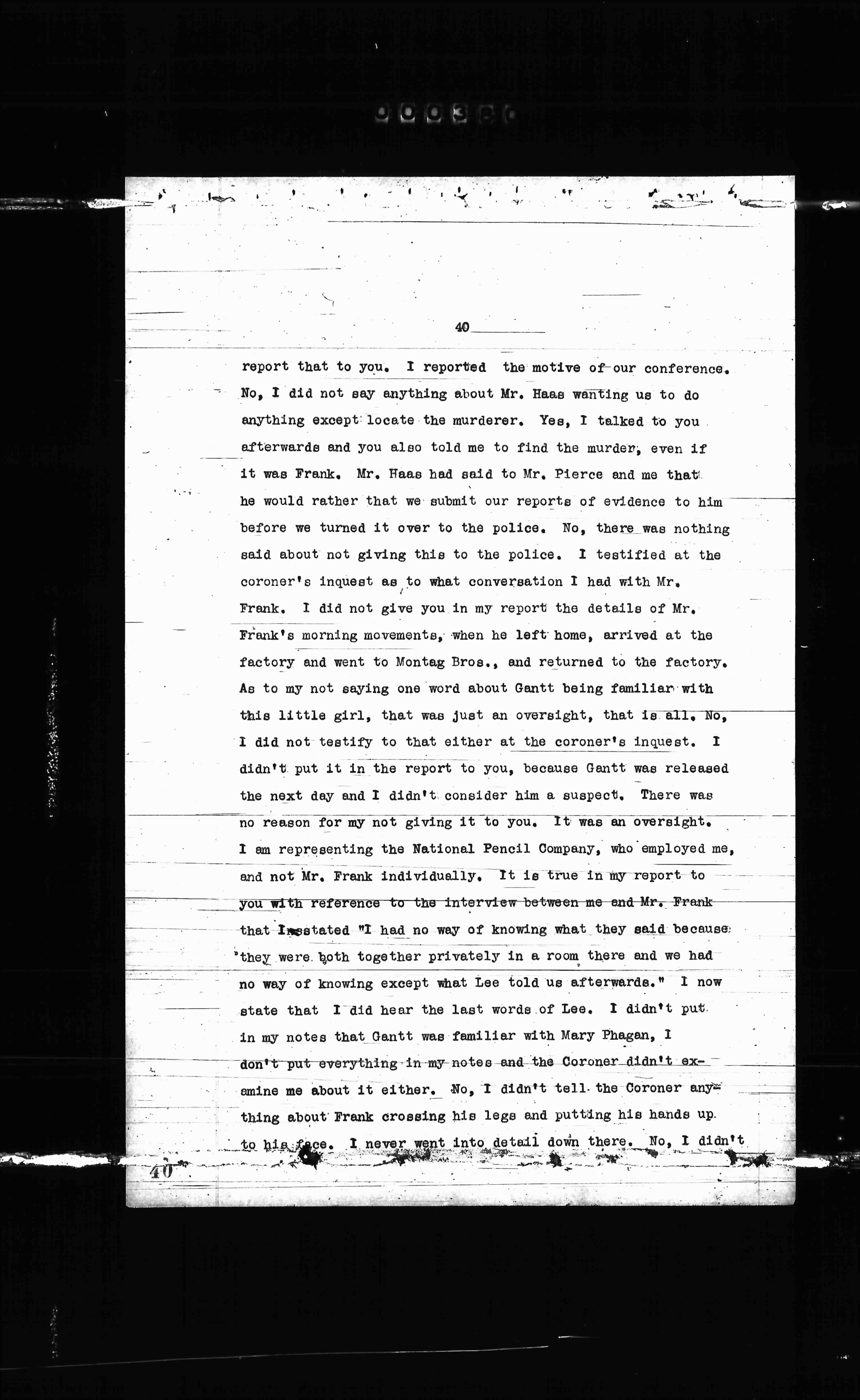 report that to you. I reported the active of our conference. - No, I did not say anything about Mr. Haas wanting us to do anything except locate the murderer. Yes, I talked to you afterwards and you also told me to find the murder, even if it was Frank. Mr. Haas had said to Mr. Pierce and me that he would rather that we submit our reports of evidence to him before we turned it over to the police. No, there was nothing said about not giving this to the police. I testified at the coroner's inquest as to what conversation I had with Mr. Frank. I did not give you in my report the details of Mr. Frank's morning movements, when he left home, arrived at the factory and went to Montag Bros., and returned to the factory. As to my not saying one word about Gantt being familiar with this little girl, that was just an oversight, that is all. No, I did not testify to that either at the coroner's inquest. I didn't put it in the report to you, because Gantt was released the next day and I didn't consider him a suspect. There was no reason for my not giving it to you. It was an oversight. I am representing the National Pencil Company, who employed me, and not Mr. Frank individually. It is true in my report to you with reference to the interview between me and Mr. Frank that I stated "I had no way of knowing what they said because they were both together privately in a room there and we had no way of knowing except what Lee told us afterwards." I now state that I did hear the last words of Lee. I didn't put in my notes that Gantt was familiar with Mary Phagan. I don't put everything in my notes and the Coroner didn't examine me about it either. No, I didn't tell the Coroner anything about Frank crossing his legs and putting his hands up to his face. I never went into so detail down there. No, I didn't