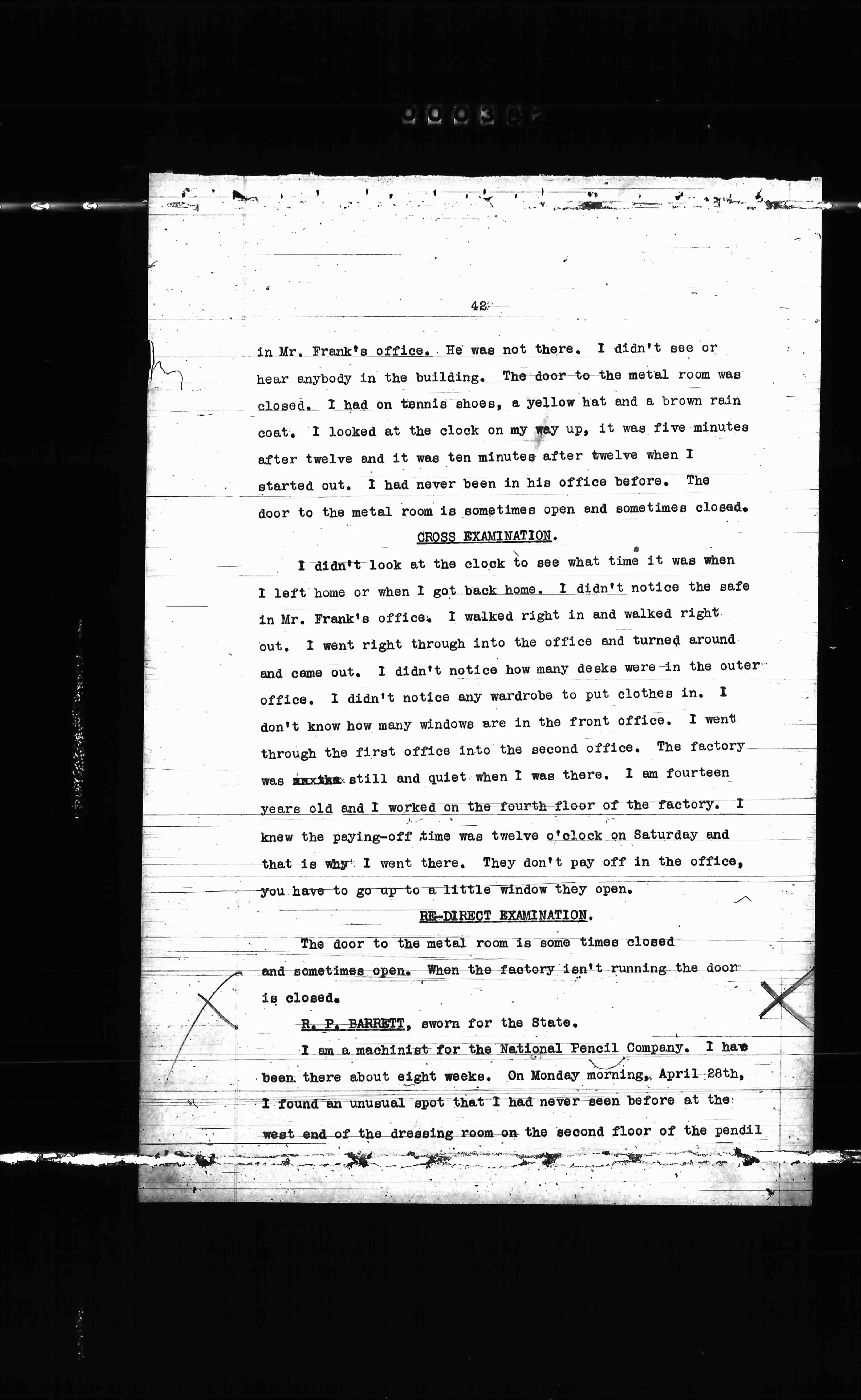 I didn't look at the clock to see what time it was when I left home or when I got back home. I didn't notice the safe in Mr. Frank's office. I walked right in and walked right out. I went right through into the office and turned around and came out. I didn't notice how many desks were in the outer office. I didn't notice any wardrobe to put clothes in. I don't know how many windows are in the front office. I went through the first office into the second office. The factory was still and quiet when I was there. I am fourteen years old and I worked on the fourth floor of the factory. I knew the paying-off time was twelve o'clock on Saturday and that is why I went there. They don't pay off in the office, you have to go up to a little window they open.