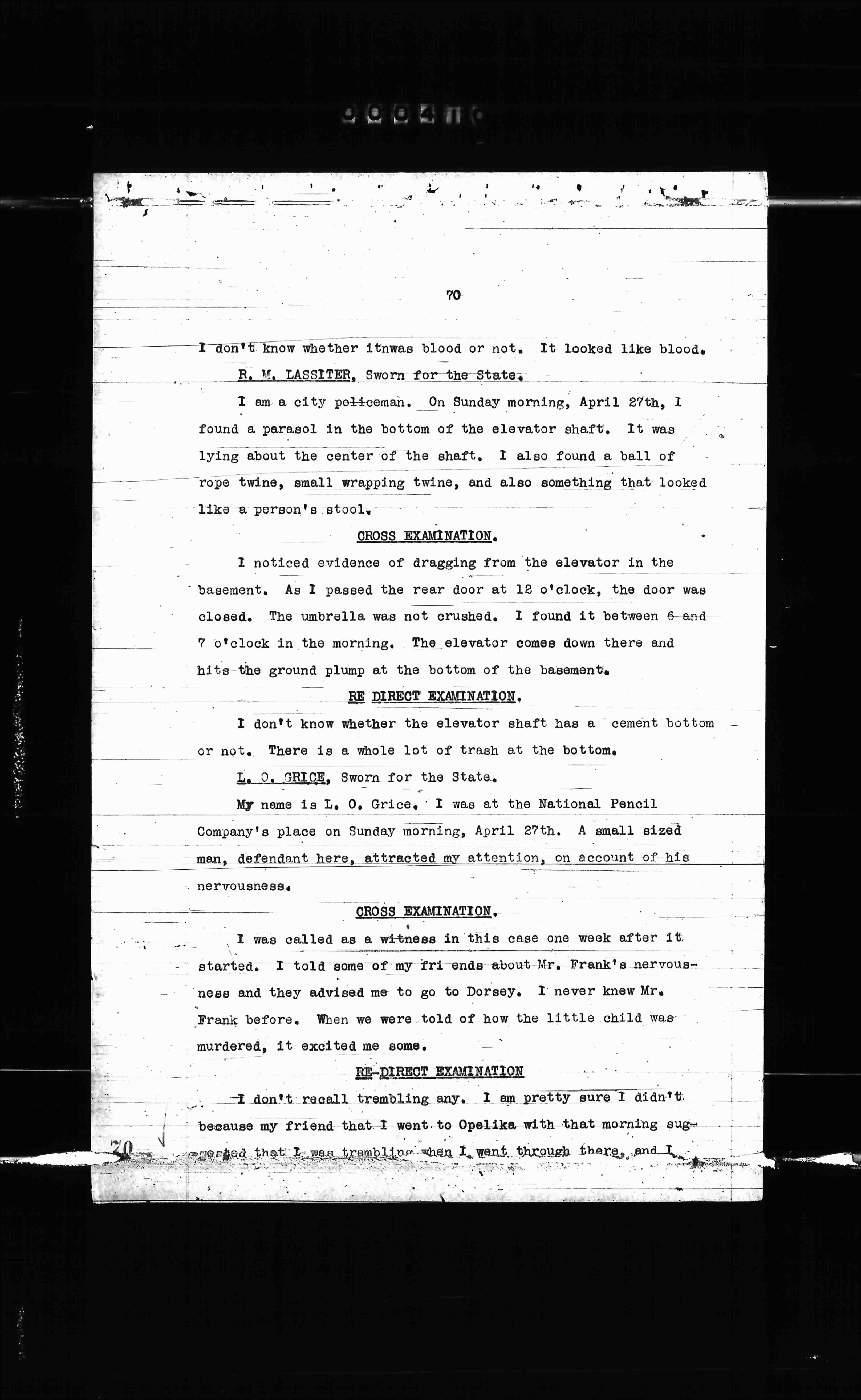 I was called as a witness in this case one week after it started. I told some of my friends about Mr. Frank's nervousness and they advised me to go to Dorsey. I never knew Mr. Frank before. When we were told how the little child was murdered, it excited me some.