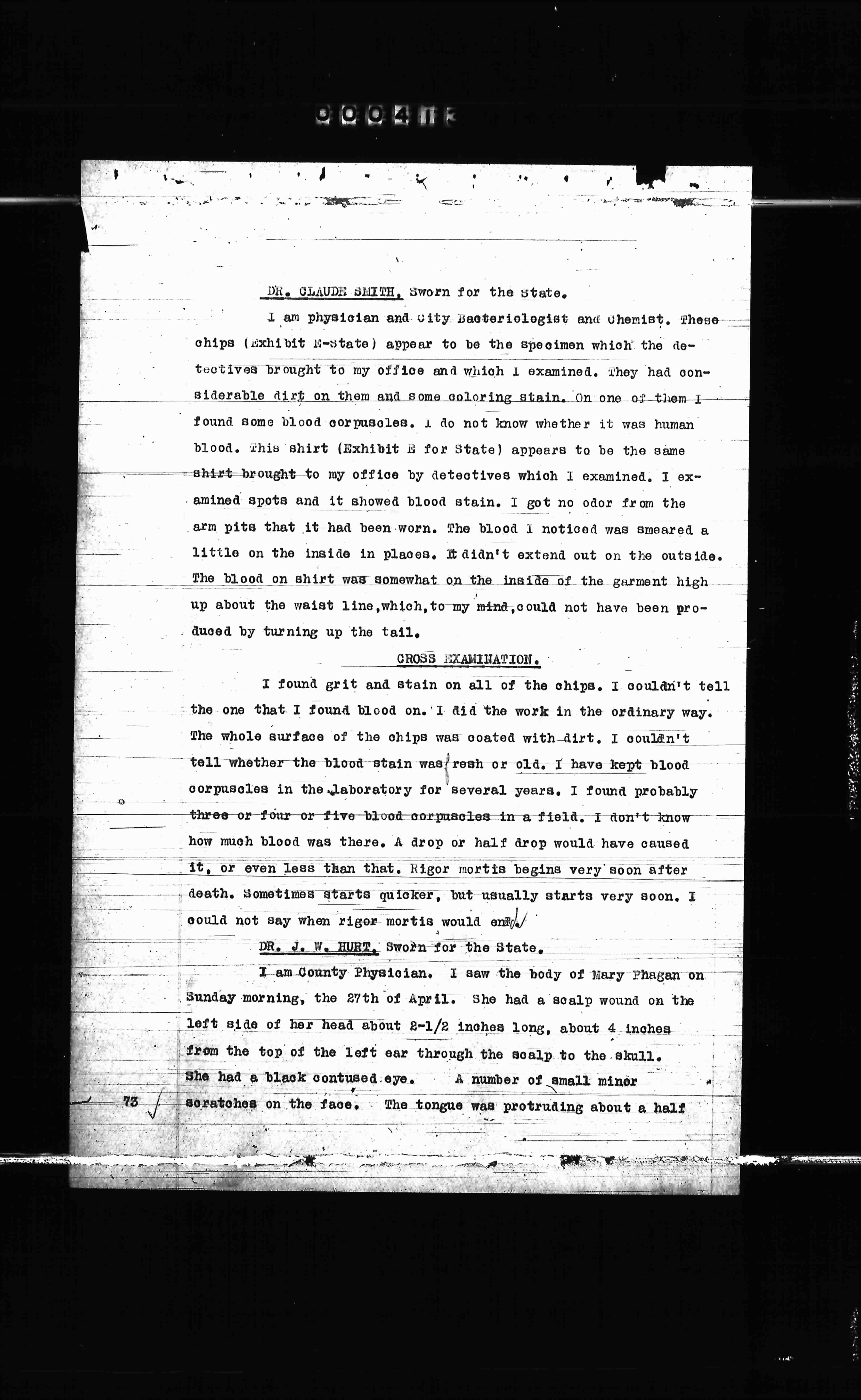 I found grit and stain on all of the chips. I couldn't tell the one that I found blood on. I did the work in the ordinary way. The whole surface of the chips was coated with dirt. I couldn't tell whether the blood stain was fresh or old. I have kept blood corpuscles in the laboratory for several years. I found probably three or four or five corpuscles to a field. I don't know how much blood was there. A drop or two of blood would cause it, or even less than that. Rigor mortis begins very soon after death, sometimes starts quicker, but usually starts very soon. I could not say when rigor mortis would end.