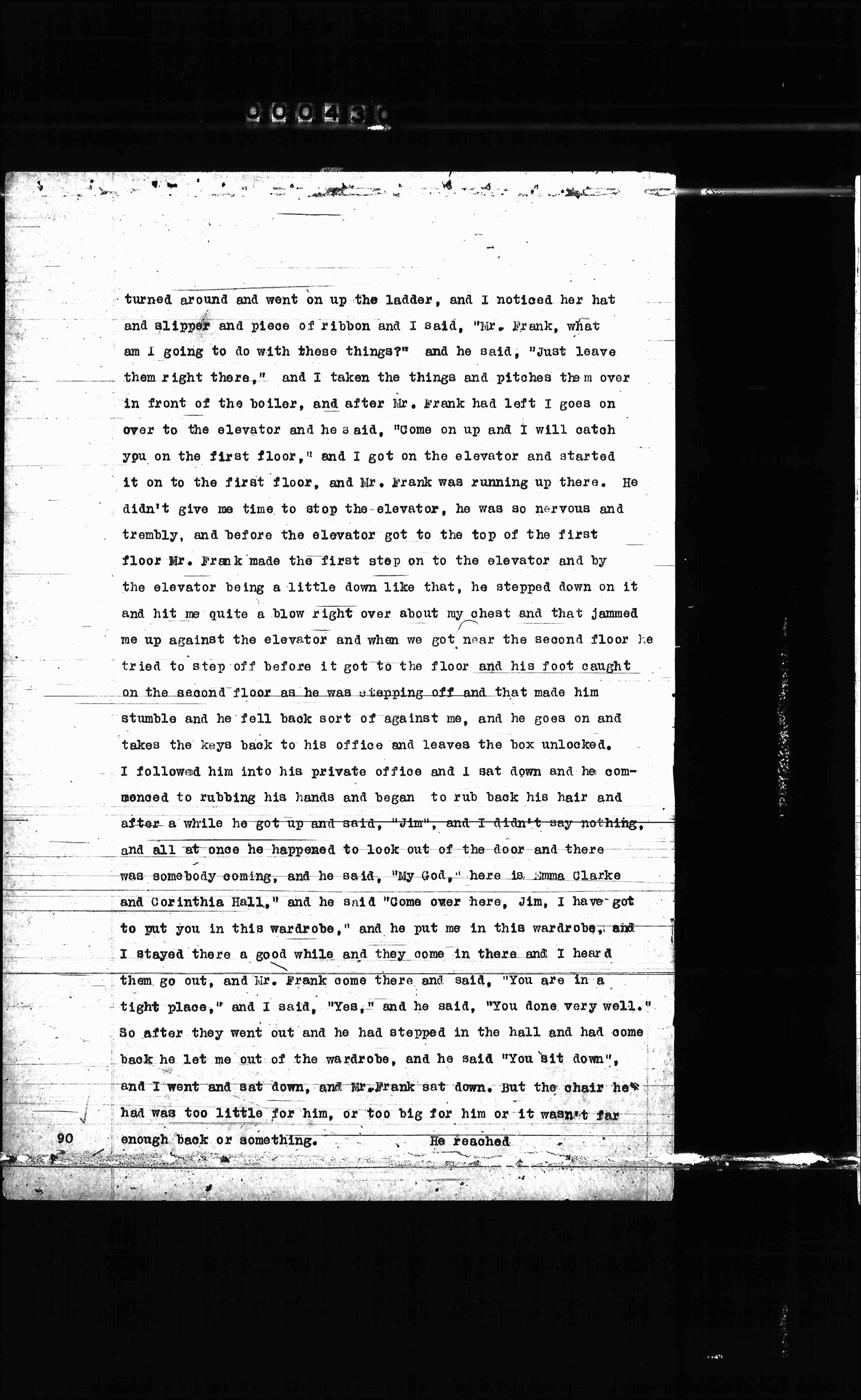 turned around and went on up the ladder, and I noticed her hat and allipper and piece of ribbon and I said, "Mr. Frank, what am I going to do with these things?" and he said, "Just leave them right there," and I taken the things and pitched them over in front of the boiler, and after Mr. Frank had left I goes on over to the elevator and he said, "Come on up and I will catch you on the first floor," and I got on the elevator and started it on to the first floor, and Mr. Frank was running up there. He didn't give me time to stop the elevator, he was so nervous and trembly, and before the elevator got to the top of the first floor Mr. Frank made the first step on to the elevator and by the elevator being a little down like that, he stepped down on it and hit me quite a blow right over about my chest and that jammed me up against the elevator and when we got near the second floor he tried to step off before it got to the floor and his foot caught on the second floor as he was stepping off and that made him stumble and he fell back sort of against me, and he goes on and takes the keys back to his office and leaves the box unlocked. I followed him into his private office and I sat down and he commenced to rubbing his hands and began to rub back his hair and after a while he got up and said, "Jim", and I didn't say nothing, and all at once he happened to look out of the door and there was somebody coming, and he said, "My God", here is Emma Clarke and Corinthia Hall," and he said "Come here, Jim, I have got to put you in this wardrobe," and he put me in this wardrobe, and I stayed there a good while and they come in there and I heard them go out, and Mr. Frank come there and said, "You are in a tight place," and I said, "Yes," and he said, "You done very well." So after they went out and he had stepped in the hall and had come back he let me out of the wardrobe, and he said "You sit down", and I went and sat down, and Mr. Frank set down, but the chair he had was too little for him, or too big for him or it wasn't far enough back or something. He reached