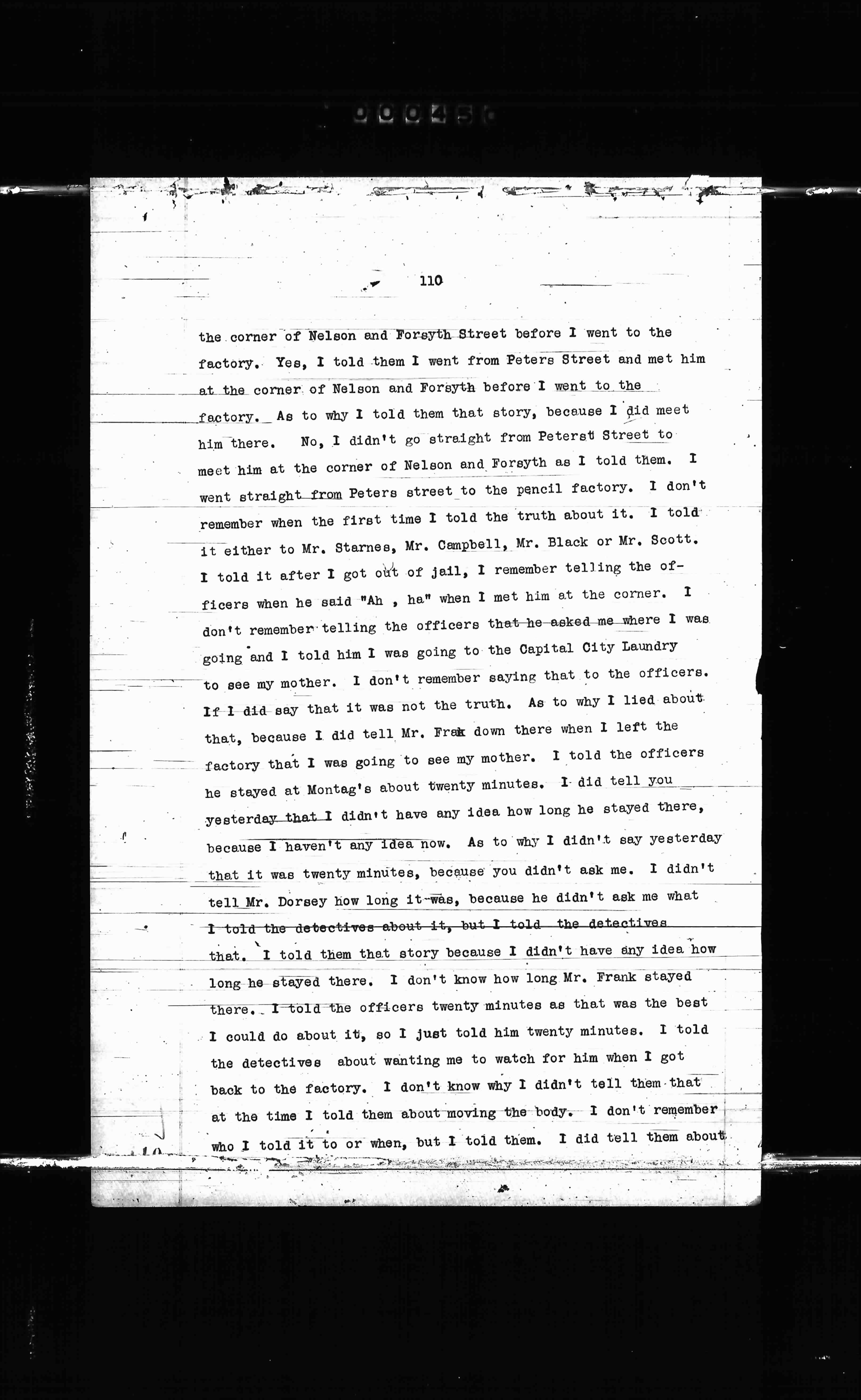 the corner of Nelson and Forsyth Street before I went to the factory. Yes, I told them I went from Peters Street and met him at the corner of Nelson and Forsyth before I went to the factory. As to why I told them that story, because I did meet him there. No, I didn't go straight from Peters Street to the factory. I met him at the corner of Nelson and Forsyth as I told them. I went straight from Peters street to the pencil factory. I don't remember when the first time I told the truth about it. I told it either to Mr. Starnes, Mr. Campbell, Mr. Black or Mr. Scott. I told it after I got out of jail. I remember telling the officers when he said "Ah, ha" when I met him at the corner. I don't remember telling the officers that he asked me where I was going and I told him I was going to the Capital City Laundry to see my mother. I don't remember saying that to the officers. If I did say that it was not the truth. As to why I lied about that, because I did tell Mr. Frank down there when I left the factory that I was going to see my mother. I told the officers he stayed at Montag's about twenty minutes. I did tell you yesterday that I didn't have any idea how long he stayed there, because I haven't any idea now. As to why I didn't say yesterday that it was twenty minutes, because you didn't ask me. I didn't tell Mr. Dorsey how long it was, because he didn't ask me what I told the detectives about it, but I told the detectives that. I told them that story because I didn't have any idea how long he stayed there. I don't know how long Mr. Frank stayed there. I told the officers twenty minutes as that was the best I could do about it, so I just told him twenty minutes. I told the detectives about wanting me to watch for him when I got back to the factory. I don't know why I didn't tell them that at the time I told them about moving the body. I don't remember who I told it to or when, but I told them. I did tell them about