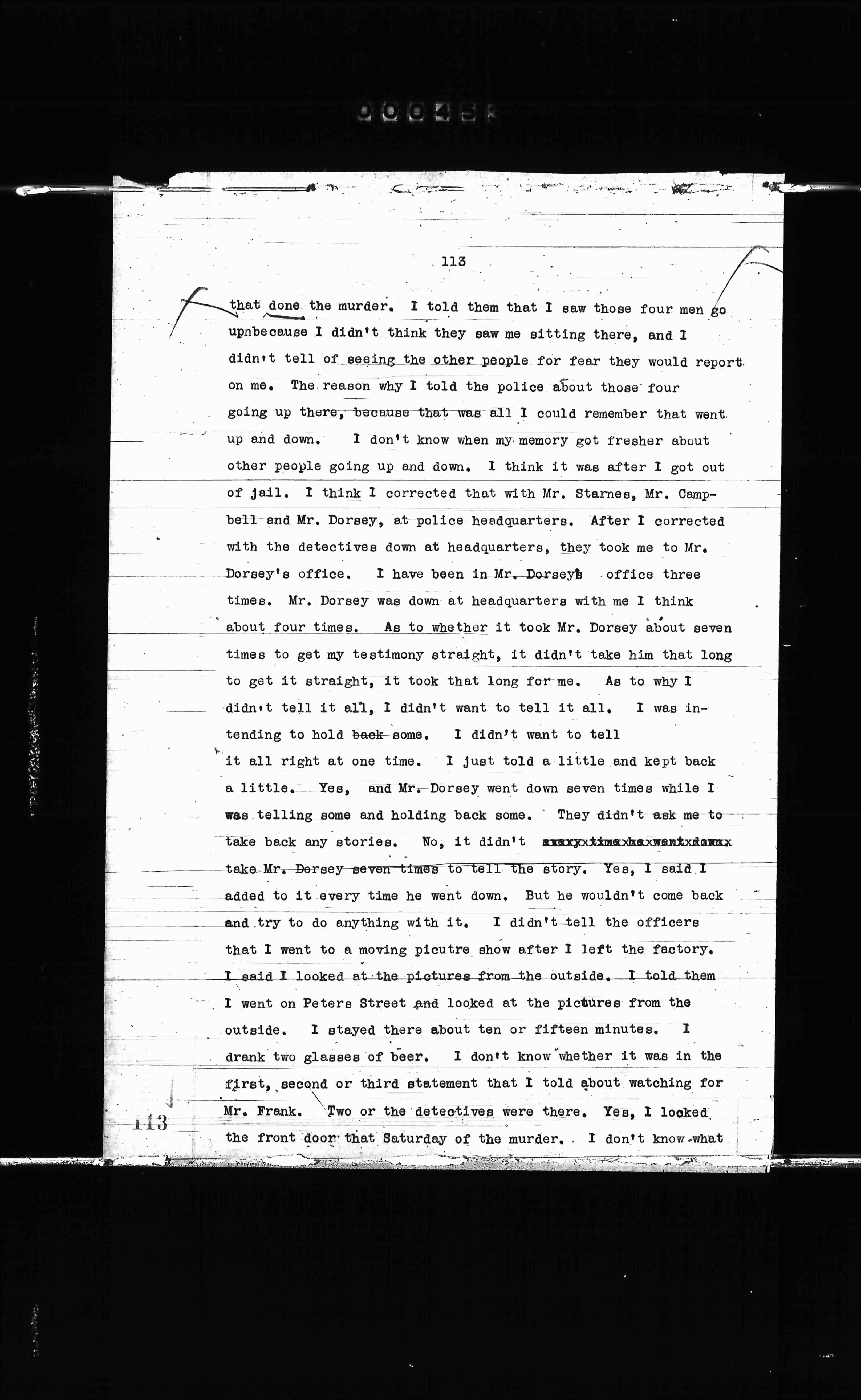 that done the murder. I told them that I saw those four men go up because I didn't think they saw me sitting there, and I didn't tell of seeing the other people for fear they would report on me. The reason why I told the police about those four going up there, because that was all I could remember that went up and down. I don't know when my memory got fresher about other people going up and down. I think it was after I got out of jail. I think I corrected that with Mr. Starnes, Mr. Campbell and Mr. Dorsey, at police headquarters. After I corrected with the detectives down at headquarters, they took me to Mr. Dorsey's office. I have been in Mr. Dorsey's office three times. Mr. Dorsey was down at headquarters with me I think about four times. As to whether it took Mr. Dorsey about seven times to get my testimony straight, it didn't take him that long to get it straight, it took that long for me. As to why I didn't tell it all, I didn't want to tell it all, I was intending to hold back some. I didn't want to tell it all right at one time. I just told a little and kept back a little. Yes, and Mr. Dorsey went down seven times while I was telling some and holding back some. They didn't ask me to take back any stories. No, it didn't take Mr. Dorsey seven times to tell the story. Yes, I said I added to it every time he went down. But he wouldn't come back and try to do anything with it. I didn't tell the officers that I went to a moving picture show after I left the factory. I said I looked at the pictures from the outside. I told them I went on Peters Street and looked at the pictures from the outside. I stayed there about ten or fifteen minutes. I drank two glasses of beer. I don't know whether it was in the first, second or third statement that I told about watching for Mr. Frank. Two or the detectives were there. Yes, I looked the front door that Saturday of the murder. I don't know what