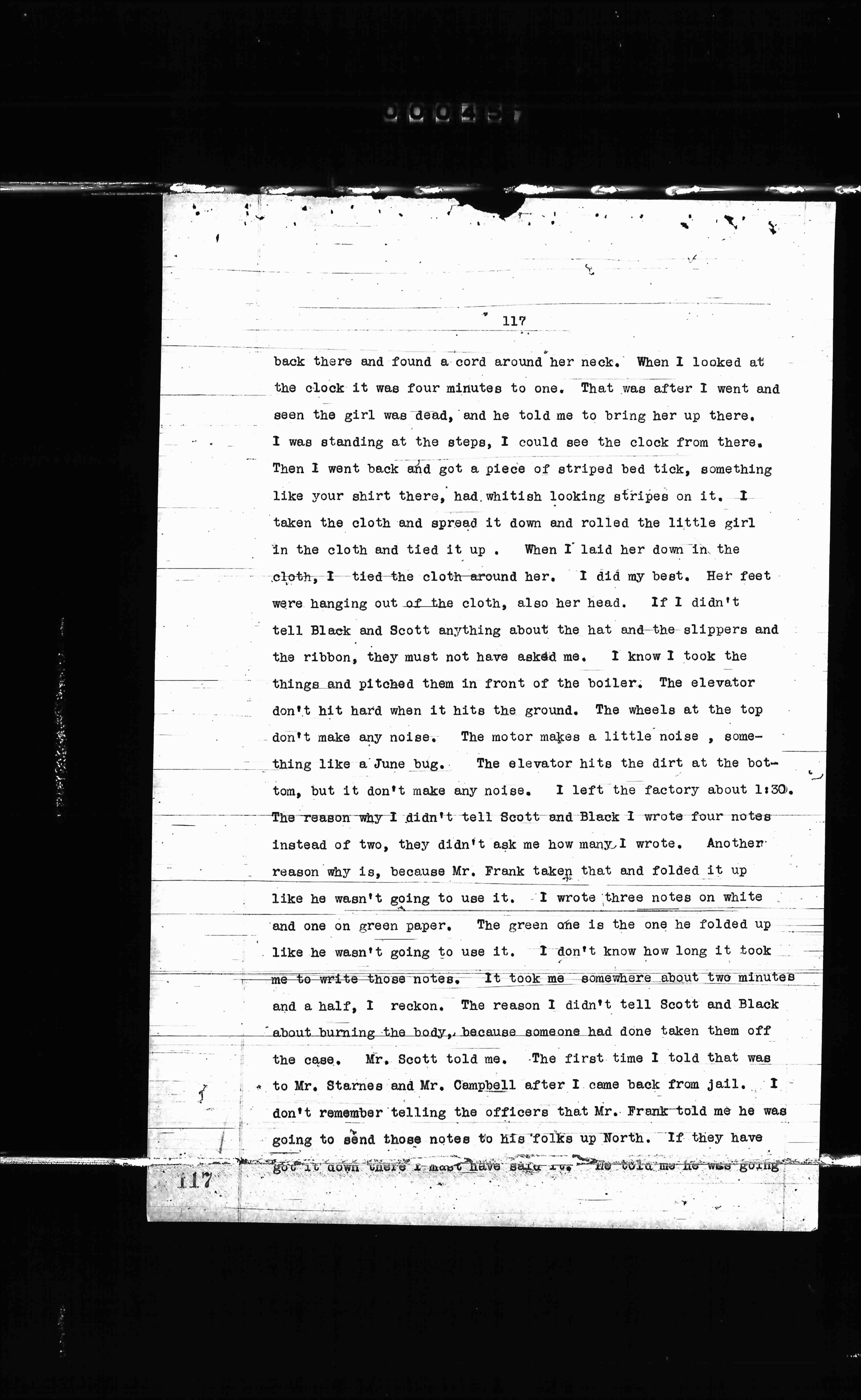 back there and found a cord around her neck. When I looked at the clock it was four minutes to one. That was after I went and seen the girl was dead, and he told me to bring her up there. I was standing at the steps, I could see the clock from there. Then I went back and got a piece of striped bed tick, something like your shirt there, and wrapped it around the little girl. I taken the cloth and spread it down and rolled her up in the cloth and tied it up. When I rolled her down in the cloth, I tied the cloth around her. I did my best. Her feet were hanging out of the cloth, also her head. If I didn't tell Black and Scott anything about the hat and the slippers and the ribbon, they must not have asked me. I know I took the things and pitched them in front of the boiler. The elevator don't hit hard when it hits the ground. The wheels at the top don't make any noise. The motor makes a little noise, something like a June bug. The elevator hits the dirt at the bottom, but it don't make any noise. I left the factory about 1:30. The reason why I didn't tell Black and Black I wrote four notes instead of two, they didn't ask me how many I wrote. Another reason why is, because Mr. Frank taken and folded it up like he wasn't going to use it. I wrote three notes on white and one on green paper. The green one is the one he folded up like he wasn't going to use it. I don't know how long it took me to write those notes. It took me somewhere about two minutes and a half, I reckon. The reason I didn't tell Scott and Black about burning the body, because someone had done taken them off the case. Mr. Scott told me. The first time I told that was to Mr. Starnes and Mr. Campbell after I came back from jail. I don't remember telling the officers that Mr. Frank told me he was going to send those notes to his folks up North. If they have got it down there I must have said it. He told me he was going