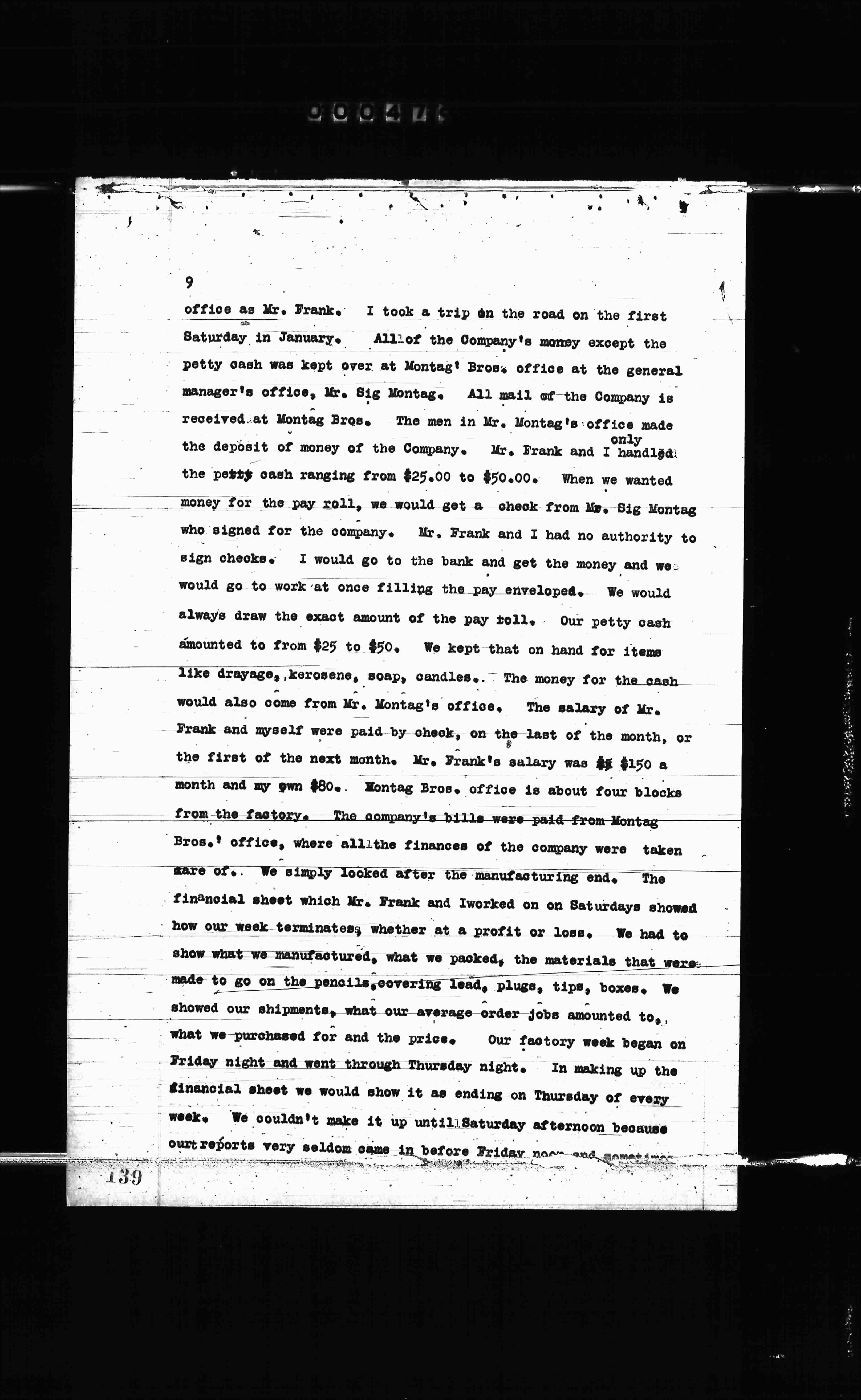 office as Mr. Frank. I took a trip on the road on the first Saturday in January. All of the Company's money except the petty cash was kept over at Montag Bros. office at the general manager's office, Mr. Sig Montag. All mail of the Company is received at Montag Bros. The men in Mr. Montag's office made the deposit of money of the Company. Mr. Frank and I handled the petty cash ranging from $25.00 to $50.00. When we wanted money for the pay roll, we would get a check from Mr. Sig Montag who signed for the company. Mr. Frank and I had no authority to sign checks. I would go to the bank and get the money and we would go to work at once filling the pay envelopes. We would always draw the exact amount of the pay roll. Our petty cash amounted to from $25 to $50. We kept that on hand for items like drayage, kerosene, soap, candles. The money for the cash would also come from Mr. Montag's office. The salary of Mr. Frank and myself were paid by check, on the last of the month, or the first of the next month. Mr. Frank's salary was $150 a month and my own $80. The Montag Bros. office is about four blocks from the factory. The company's bills were paid from Montag Bros.' office, where all the finances of the company were taken care of. We simply looked after the manufacturing end. The financial sheet which Mr. Frank and I worked on on Saturdays showed how our week terminates, whether at a profit or loss. We had to show what we manufactured, what we packed, the materials that were made to go on the pencils, covering lead, plugs, tips, boxes. We showed our shipments, what our average order jobs amounted to, what we purchased for and the price. Our factory week began on Friday night and went through Thursday night. In making up the financial sheet we would show it as ending on Thursday of every week. We couldn't make it up until Saturday afternoon because our reports very seldom came in before Friday noon, and sometimes