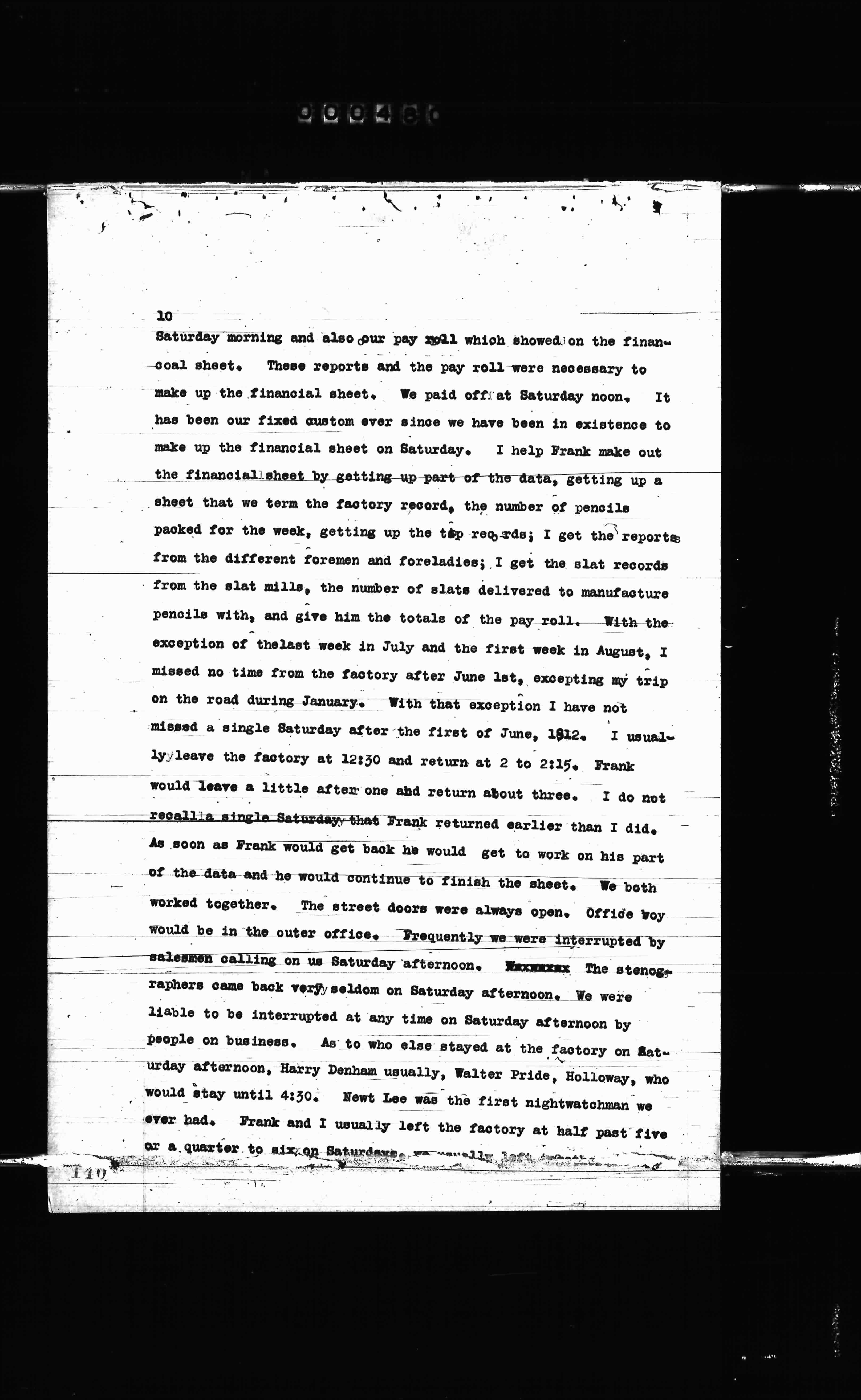 Saturday morning and also our pay roll which showed on the financial sheet. These reports and the pay roll are necessary to make up the financial sheet. We paid off at Saturday noon. It has been our fixed custom ever since we have been in existence to make up the financial sheet on Saturday. I help Frank make out the financial sheet by getting up part of the data, getting up a sheet that we term the factory record, the number of pencils packed for the week, getting up the time records; I get the reports from the different foremen and foreladies; I get the slat records from the slat mills, the number of slats delivered to manufacture pencils with, and give him the totals of the pay roll. With the exception of the last week in July and the first week in August, I missed no time from the factory after June last, excepting my trip on the road during January. With that exception I have not missed a single Saturday after the first of June, 1912. I usually leave the factory at 12:30 and return at 2 to 2:15. Frank would leave a little after one and return about three. I do not recall a single Saturday that Frank returned earlier than I did. As soon as Frank would get back he would get to work on his part of the data and he would continue to finish the sheet. We both worked together. The street doors were always open. Office boys would be in the outer office. Frequently we were interrupted by salesmen calling on us Saturday afternoon. The stenographers came back very seldom on Saturday afternoon. We were liable to be interrupted any time on Saturday afternoon by people on business. As to who else stayed at the factory on Saturday afternoon, Harry Denham usually, Walter Pride, Holloway, who would stay until 4:30. Newt Lee was the first nightwatchman we ever had. Frank and I usually left the factory at half past five or a quarter to six on Saturdays.