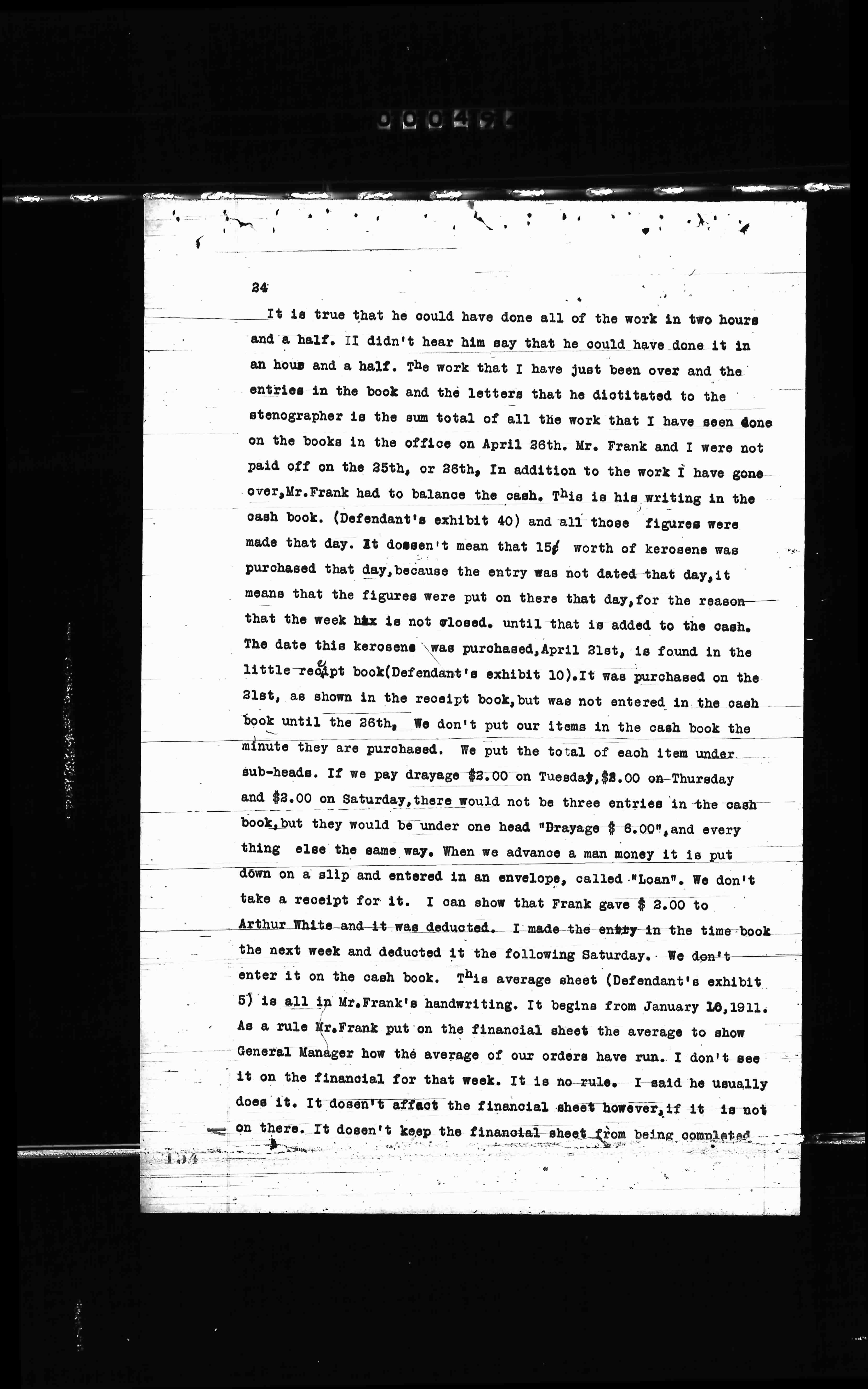It is true that he could have done all of the work in two hours and a half. I didn't hear him say that he could have done it in an hour and a half. The work that have just been over and the entries in the book and the letters that he dictated to the stenographer is the sum total of all the work that I have seen done on the books in the office on April 26th. Mr. Frank and I were not paid off on the 25th, or 26th. In addition to the work I have gone over,Mr.Frank had to balance the cash. This is his writing in the cash book. (Defendant's exhibit 40) and all those figures were made that day. It doesn't mean that 15ยข worth of kerosene was purchased that day, because the entry was not dated that day, it means that the figures were put on there that day, for the reason that the week has is not closed, until that is added to the cash. The date this kerosene was purchased, April 21st, is found in the little receipt book(Defendant's exhibit 10).It was purchased on the 21st, as shown in the receipt book, but was not entered in the cash book until the 26th. We don't put our items in the cash book the minute they are purchased. We put our total of each item under sub-heads. If we pay drayage $2.00 on Tuesday, $3.00 on Thursday and $2.00 on Saturday, there would not be three entries in the cash book, but they would be under one head "Drayage $6.00", and every thing else the same way. When we advance a man money it is put down on a slip and entered in an envelope, called "Loan". We don't take a receipt for it. I can show that Frank gave $2.00 to Arthur White and it was deducted. I made the entry in the time book the next week and deducted it the following Saturday. We don't enter it on the cash book. This average sheet (Defendant's exhibit 5) is all in Mr.Frank's handwriting. It begins from January 16,1911. As a rule Mr.Frank put on the financial sheet the average to show General Manager how the average of our orders have run. I don't see it on the financial for that week. It is no rule. I said he usually does it. It doesn't affect the financial sheet however, if it is not on there. It doesn't keep the financial sheet from being completed