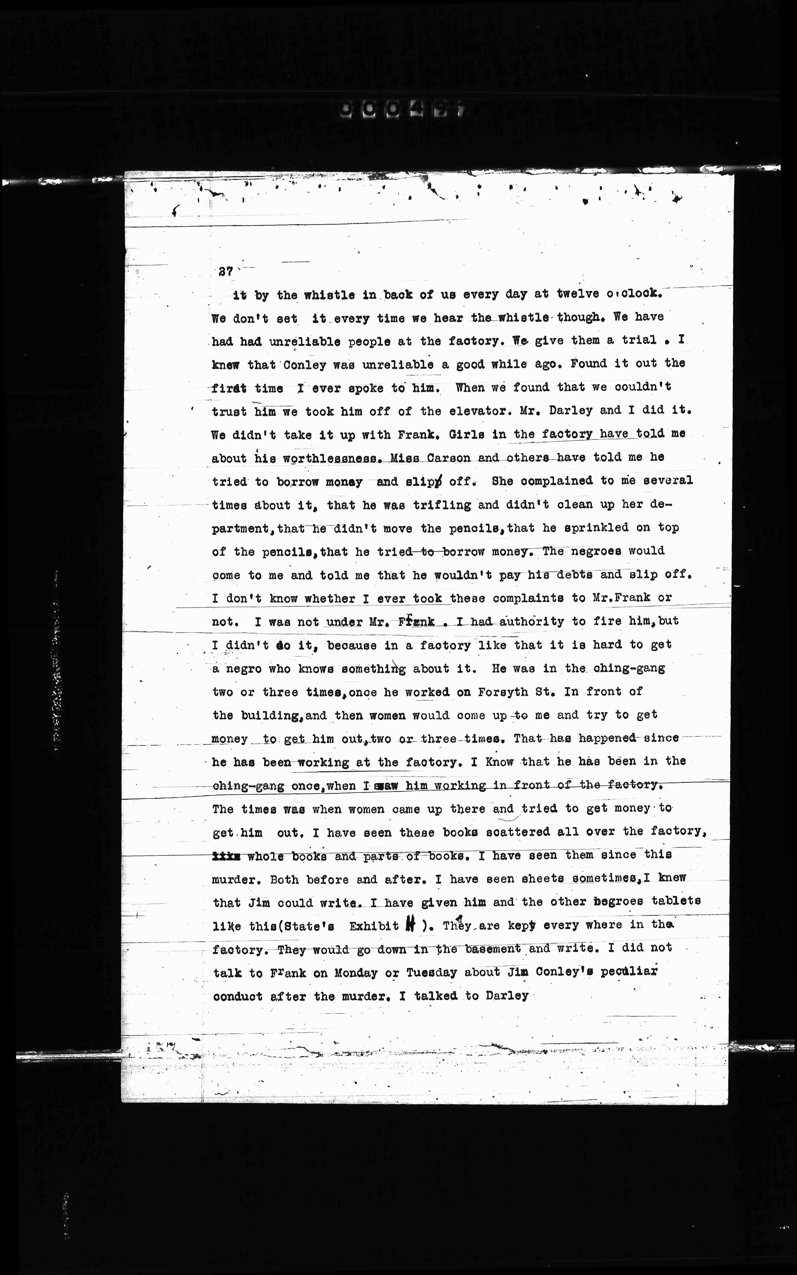 it by the whistle in back of us every day at twelve o'clock. We don't set it every time we hear the whistle- though. We have had unreliable people at the factory. We give them a trial. I knew that Conley was unreliable a good while ago. Found it out the first time I ever spoke to him. When we found that we couldn't trust him we took him off the elevator. Mr. Darley and I did it. We didn't take it up with Frank. Girls in the factory have told me about his worthlessness. Miss Carson and others have told me he tried to borrow money and slip off. She complained to me several times about it, that he was trifling and didn't clean up her department, that he didn't move the pencils, that he sprinkled on top of the pencils, that he tried to borrow money. The negroes would come to me and told me that he wouldn't pay his debts and slip off. I don't know whether I ever took these complaints to Mr. Frank or not. I was not under Mr. Frank. I had authority to fire him, but I didn't do it, because in a factory like that it is hard to get a negro who knows something about it. He was in the ching-gang two or three times, once he worked on Foreyth St. In front of the building, and then women would come up there and try to get money to get him out, two or three times. That has happened since he has been working at the factory. I know that he has been in the ching-gang once, when I saw him working in front of the factory. The times was when women came up there and tried to get money to get him out. I have seen these books scattered all over the factory, the whole books and parts of books. I have seen them since this murder. Both before and after. I have seen sheets sometimes. I knew that Jim could write. I have given him and the other negroes tablets like this (State's Exhibit B). They are kept every where in the factory. They would go down in the basement and write. I did not talk to Frank on Monday or Tuesday about Jim Conley's peculiar conduct after the murder. I talked to Darley