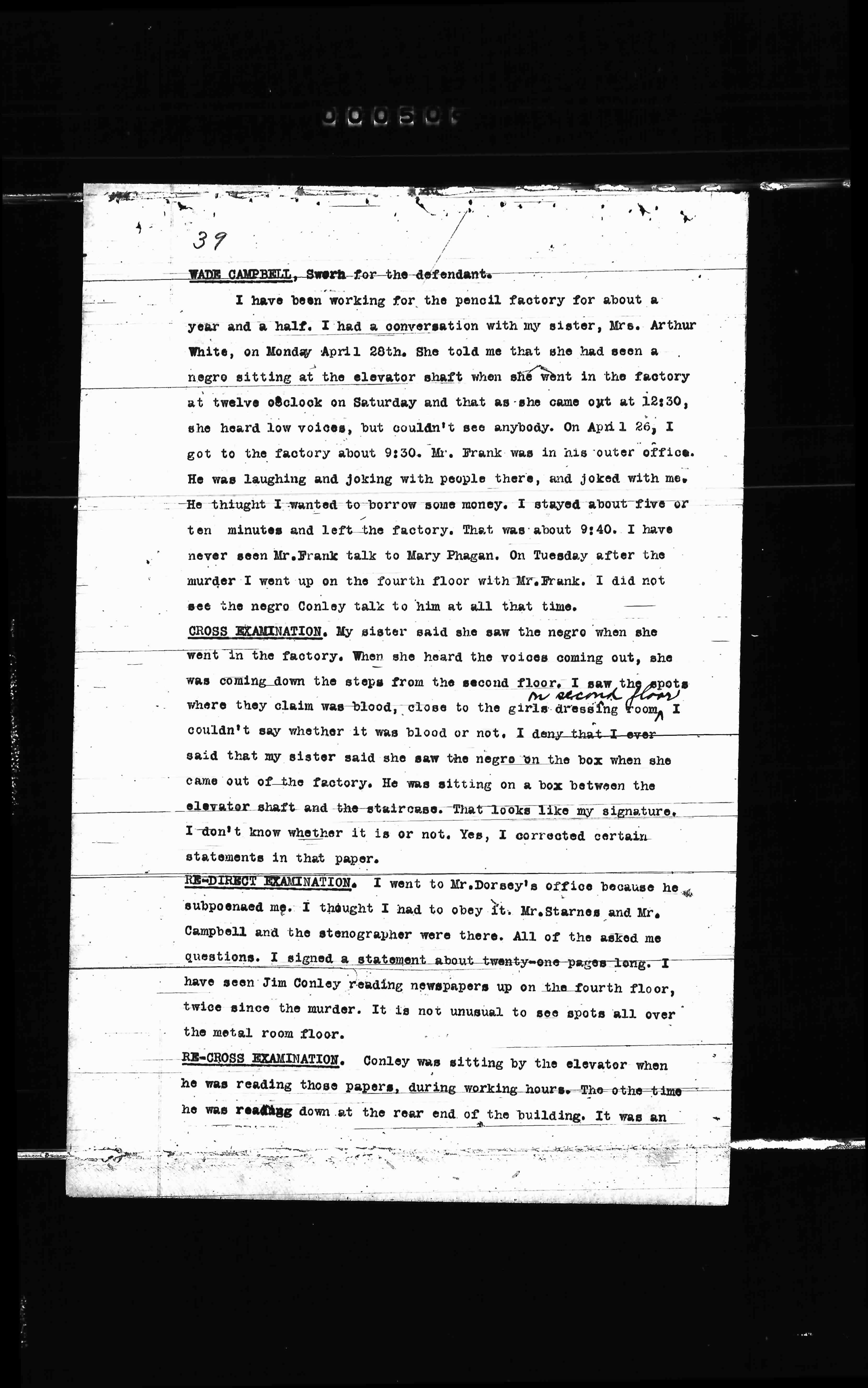 RE-DIRECT EXAMINATION. I went to Mr. Dorsey's office because he subpoenaed me. I thought I had to obey it. Mr. Starnes and Mr. Campbell and the stenographer were there. All of them asked me questions. I signed a statement about twenty-one pages long. I have seen Jim Conley reading newspapers up on the fourth floor, twice since the murder. It is not unusual to see spots all over the metal room floor.