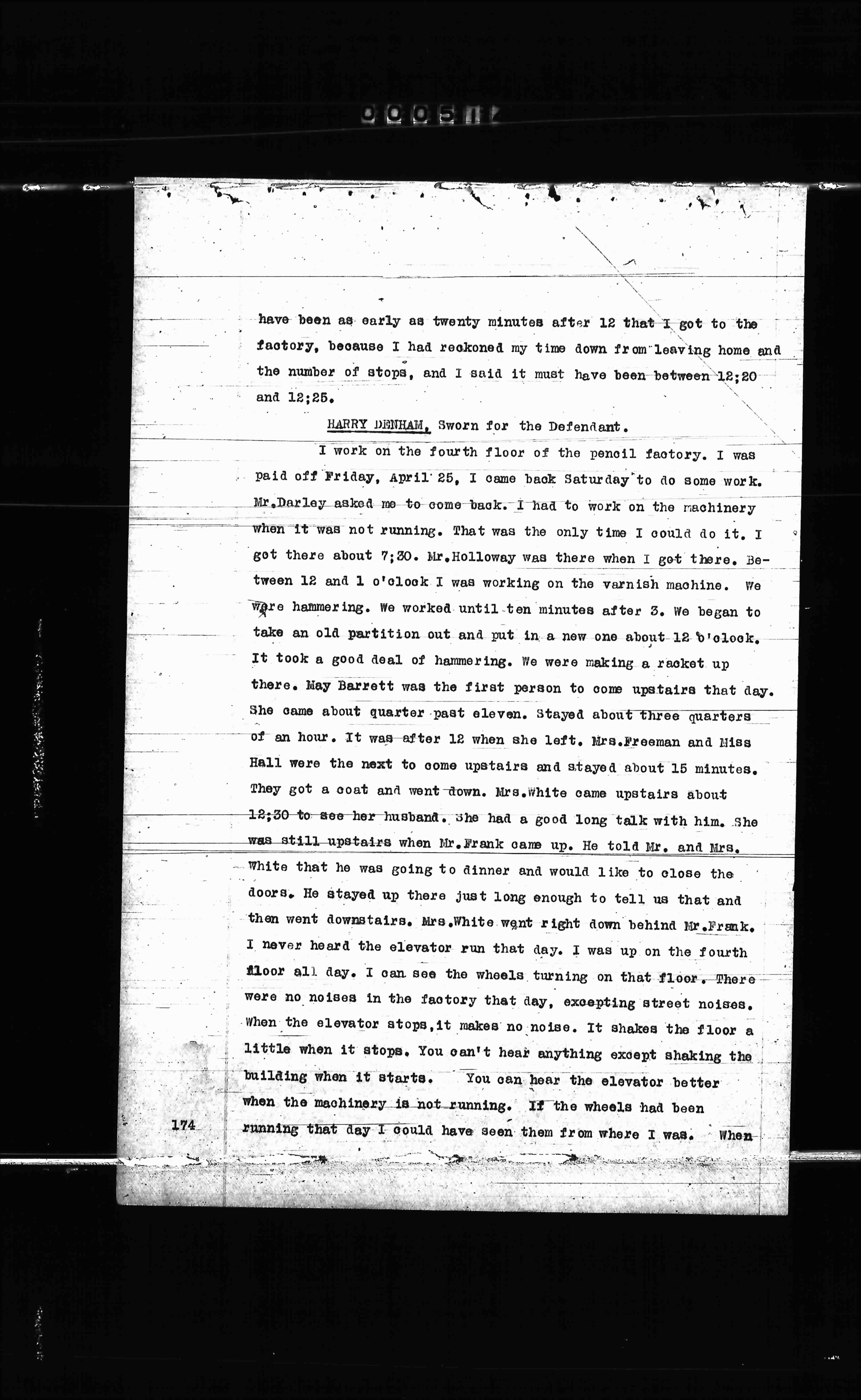 I work on the fourth floor of the pencil factory. I was paid off Friday, April 25. I came back Saturday to do some work. Mr.Darley asked me to come back. I had to work on the machinery when it was not running. It was the only time I could do it. I got there about 7:30. Mr.Holmes was there when I got there. Between 12 and 1 o'clock I was working on the varnish machine. We were hammering. We worked until ten minutes after 3. We began to take an old partition out and put in a new one about 12 o'clock. It took a good deal of hammering. We were making a racket up there. May Barrett was the first person to come upstairs that day. She came about quarter past eleven. Stayed about three quarters of an hour. It was after 12 when she left. Mrs.Freeman and Miss Hall were the next to come upstairs and stayed about 15 minutes. They got a coat and went down. Mrs.White came upstairs about 12:30 to see her husband. She had a good long talk with him. She was still upstairs when Mr.Frank came up. He told Mr. and Mrs. White that he was going to dinner and would like to close the doors. He stayed up there just long enough to tell us that and then went downstairs. Mrs.White went right down behind Mr.Frank. I never heard the elevator run that day. I was up on the fourth floor all day. I can see the wheels turning on that floor. There were no noises in the factory that day, excepting street noises. When the elevator stops, it makes a noise. It shakes the floor a little when it stops. You can hear anything except shaking the building when it starts. You can hear the elevator better when the machinery is not running. If the wheels had been running that day I could have seen them from where I was. When