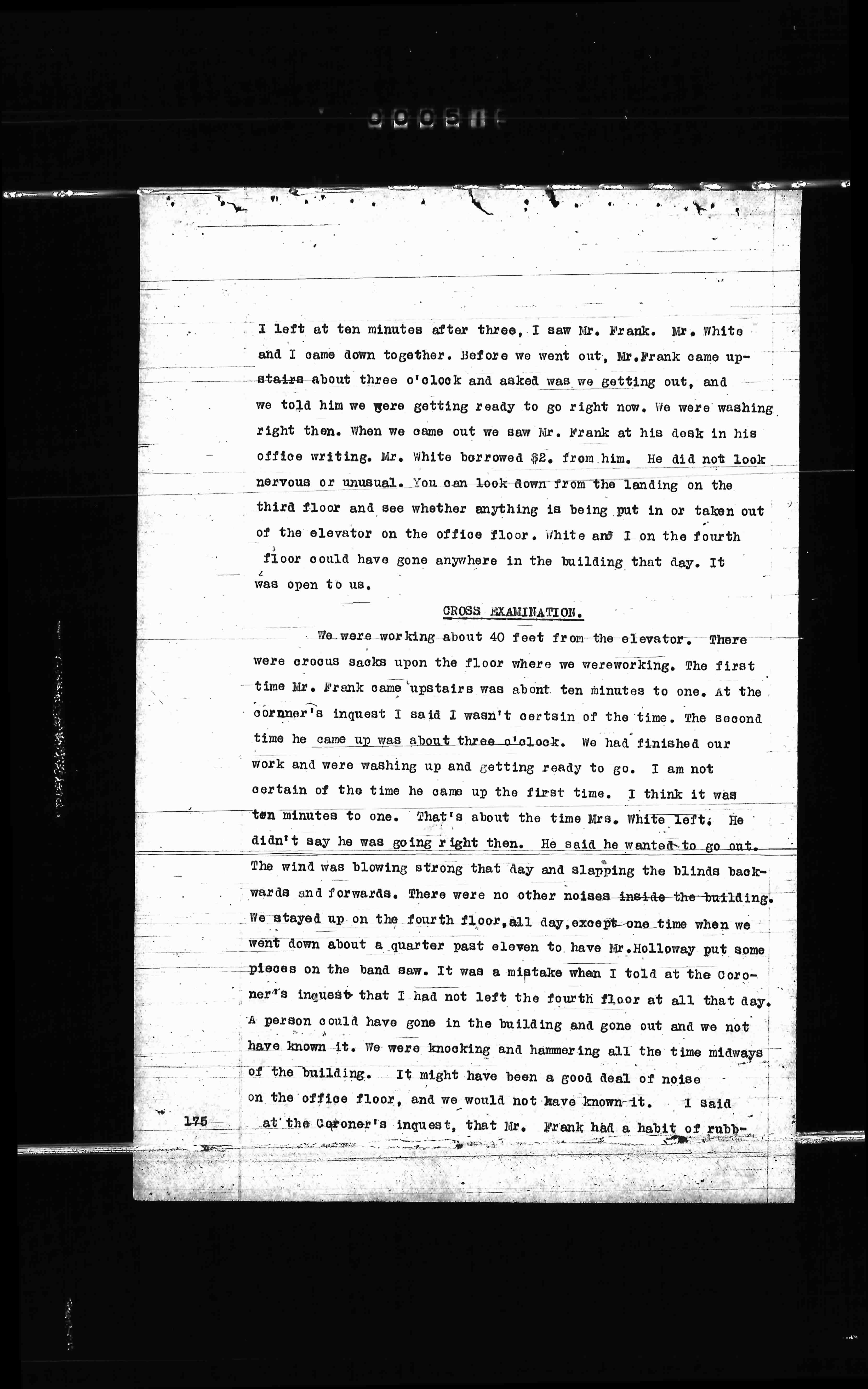 We were working about 40 feet from the elevator. There were crocus sacks upon the floor where we were working. The first time Mr. Frank came upstairs was about ten minutes to one. At the coroner's inquest I said I wasn't certain of the time. The second time he came up was about three o'clock. We had finished our work and were washing up and getting ready to go. I am not certain of the time he came up the first time. I think it was ten minutes to one. That's about the time Mrs. White left. He didn't say he was going right then. He said he wanted to go out. The wind was blowing strong that day and slapping the blinds back- wards and forwards. There were no other noises inside the building. We stayed up on the fourth floor all day except one time when we went down about a quarter past eleven to have Mr. Holloway put some pieces on the band saw. It was a mistake when I told at the coro- ner's inquest that I had not left the fourth floor at all that day. A person could have gone in the building and gone out and we not have known it. We were knocking and hammering all the time midway of the building. It might have been a good deal of noise on the office floor, and we would not have known it. I said at the Coroner's inquest, that Mr. Frank had a habit of rubb-