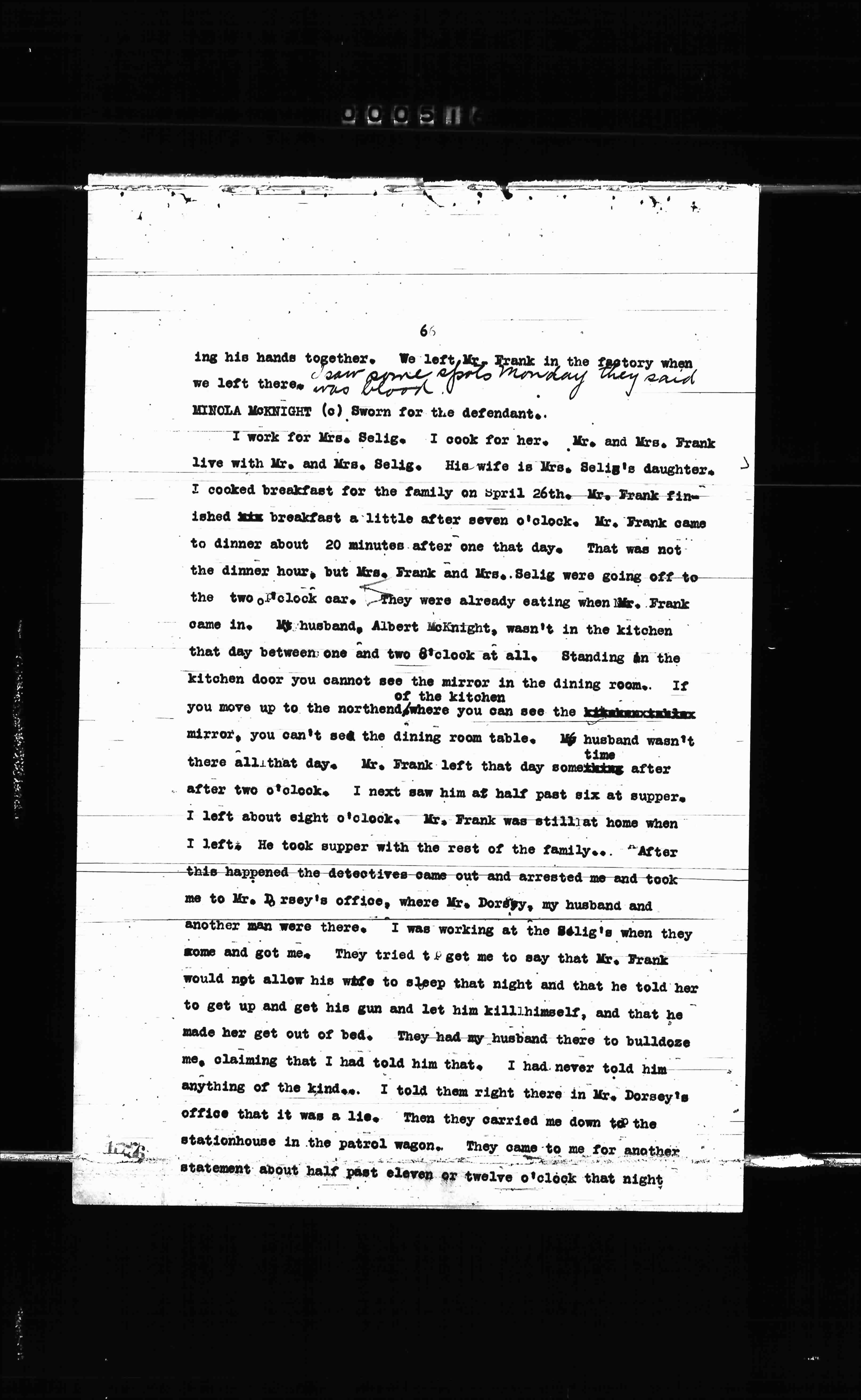 I work for Mrs. Selig. I cook for her. Mr. and Mrs. Frank live with Mr. and Mrs. Selig. His wife is Mrs. Selig's daughter. I cooked breakfast for the family on April 26th. Mr. Frank finished his breakfast a little after eleven o'clock. Mr. Frank came to dinner about 20 minutes after one o'clock. That was not the dinner hour, but Mrs. Frank and Mrs. Selig were going off to the two o'clock car. They were already eating when Mr. Frank came in. My husband, Albert McKnight, wasn't in the kitchen that day between one and two o'clock at all. Standing at the kitchen door you cannot see the mirror in the dining room. If you move up to the north end where you can see the kitchen mirror, you can't see the dining room table. My husband wasn't there all that day. Mr. Frank left that day sometime after after two o'clock. I next saw him at half past six at supper. I left about eight o'clock. Mrs. Frank was still at home when I left. He took supper with the rest of the family. "After this happened the detectives came out and arrested me and took me to Mr. Dorsey's office, where Mr. Dorsey, my husband and another man were there. I was working at the Selig's when they came and got me. They tried to get me to say that Mr. Frank would not allow his wife to sleep that night and that he told her to get up and get his gun and let him kill himself, and that he made her get out of bed. They had my husband there to bulldose me, claiming that I had told him that. I had never told him anything of the kind. I told them right there in Mr. Dorsey's office that it was a lie. Then they carried me down to the stationhouse in the patrol wagon. They came to me for another statement about half past eleven or twelve o'clock that night