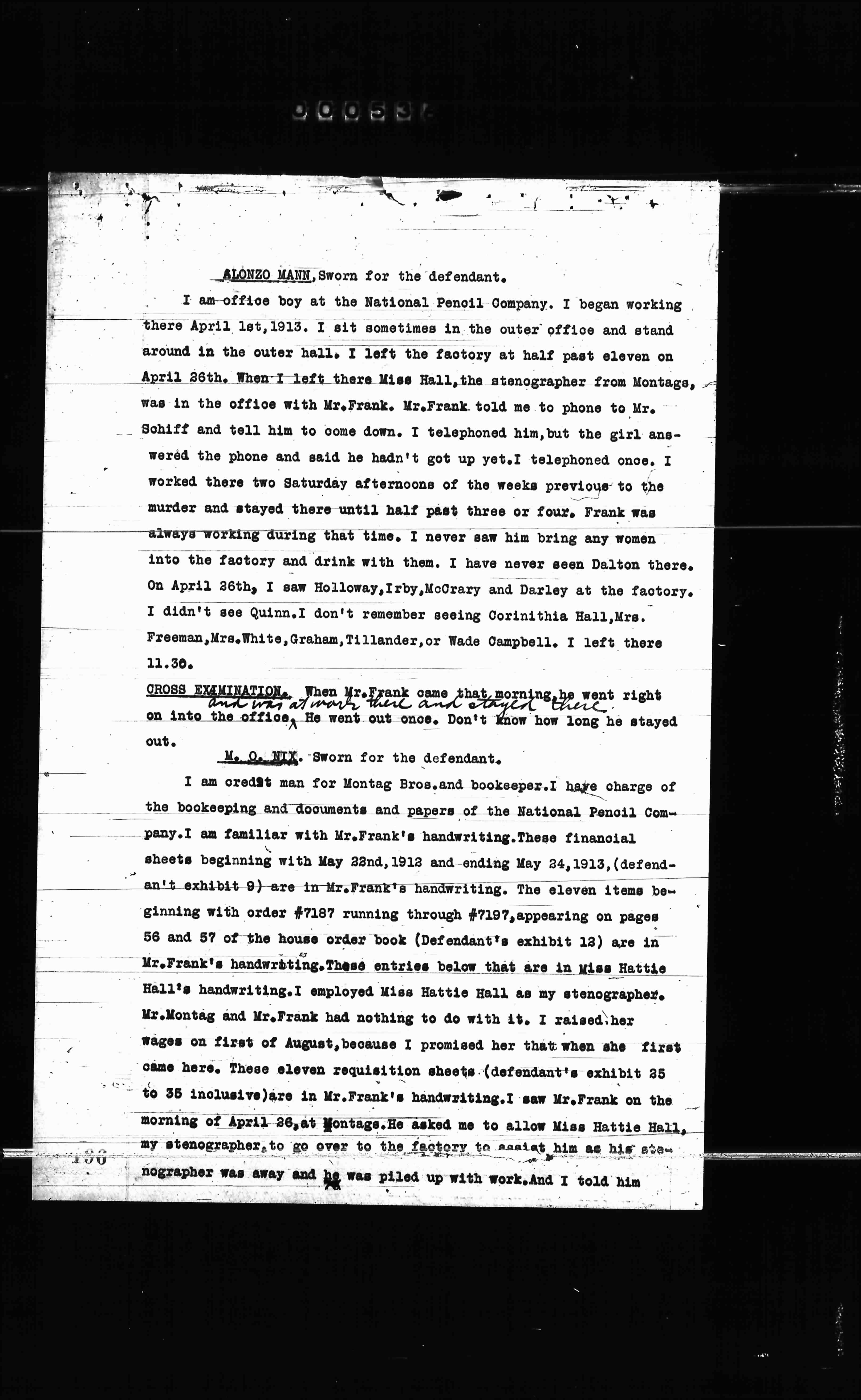 I am oredit man for Montag Bros.and bookkeeper. I have charge of the bookkeeping and documents and papers of the National Pencil Company.I am familiar with Mr.Frank's handwriting. These financial sheets beginning with May 28nd,1913 and ending May 31,1913,(defendant's exhibit 9) are in Mr.Frank's handwriting. The eleven items beginning with order #7187 running through #7197,appearing on pages 56 and 57 of the house order book (Defendant's exhibit 12) are in Mr.Frank's handwriting. These entries below that are in Miss Hattie Hall's handwriting.I employed Miss Hattie Hall as my stenographer. Mr.Montag and Mr.Frank had nothing to do with it. I raised her wages on first of August, because I promised her that when she first came here. These eleven requisition sheets (defendant's exhibit 25 to 35 inclusive) are in Mr.Frank's handwriting. I saw Mr.Frank on the morning of April 26,at Montag's. He asked me to allow Miss Hattie Hall, my stenographer, to go over to the factory to assist him as his stenographer was away and he was piled up with work.And I told him