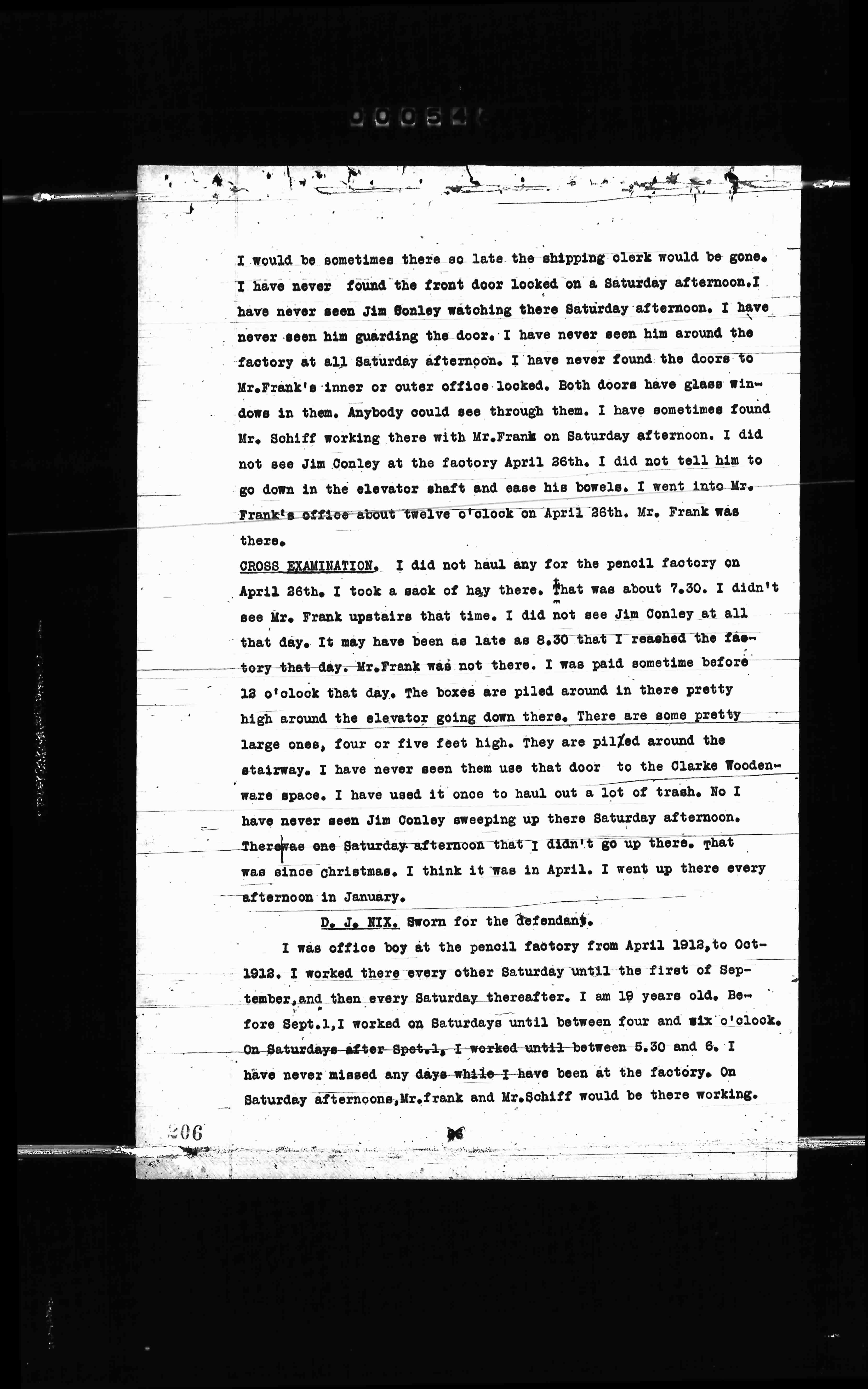 I was office boy at the pencil factory from April 1913 to Oct- 1913. I worked there every other Saturday until the first of September, and then every Saturday thereafter. I am 19 years old. Before Sept.1, I worked on Saturdays until between four and six o'clock. On Saturdays after Sept.1, I worked until between 5.30 and 6. I have never missed any days while I have been at the factory. On Saturday afternoons, Mr.Frank and Mr.Schiff would be there working.