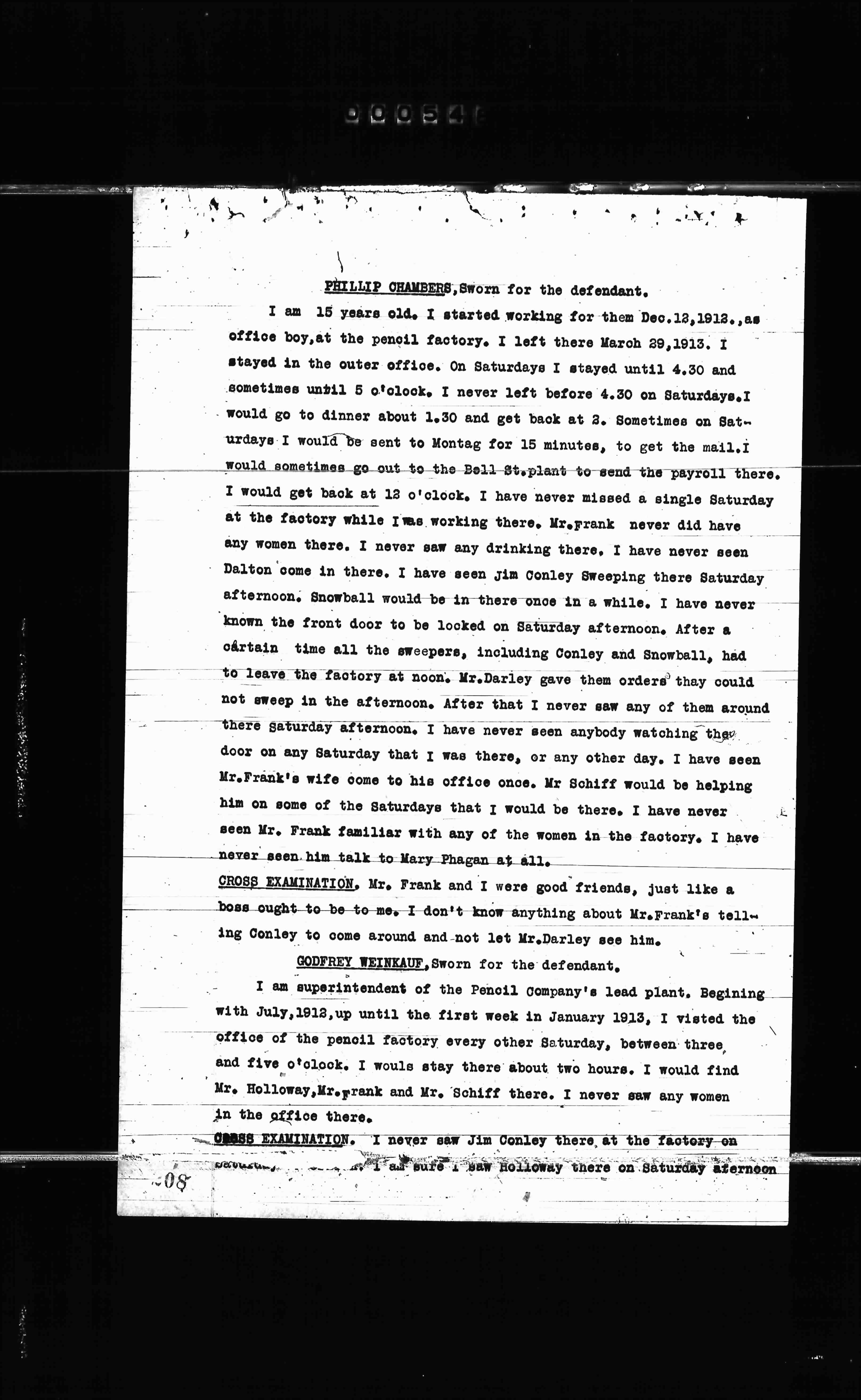 I am 15 years old. I started working for them Dec.13,1912, as office boy at the pencil factory. I left there March 29,1913. I stayed in the outer office. On Saturdays I stayed until 4.30 and sometimes until 5 o'clock. I never left before 4.30 on Saturdays. I would go to dinner about 1.30 and get back at 3. Sometimes on Saturdays I would be sent to Montag for 15 minutes, to get the mail. I would sometimes go out to the Bell St plant to send the payroll there. I would get back at 12 o'clock. I have never missed a single Saturday at the factory while I was working there. Mr.Frank never did have any women there. I never saw any drinking there. I have never seen Dalton come in there. I have seen Jim Conley sweeping there Saturday afternoon. Snowball would be in there once in a while. I have never known the front door to be locked on Saturday afternoon. After a certain time all the sweepers, including Conley and Snowball, had to leave the factory at noon. Mr.Darley gave them orders they could not sweep in the afternoon. After that I never saw any of them around there Saturday afternoon. I have never seen anybody watching the door on any Saturday that I was there, or anybody day. I have seen Mr.Frank's wife come to his office once. Mr Schiff would be helping him on some of the Saturdays that I would be there. I have never seen Mr. Frank familiar with any of the women in the factory. I have never seen him talk to Mary Phagan at all.