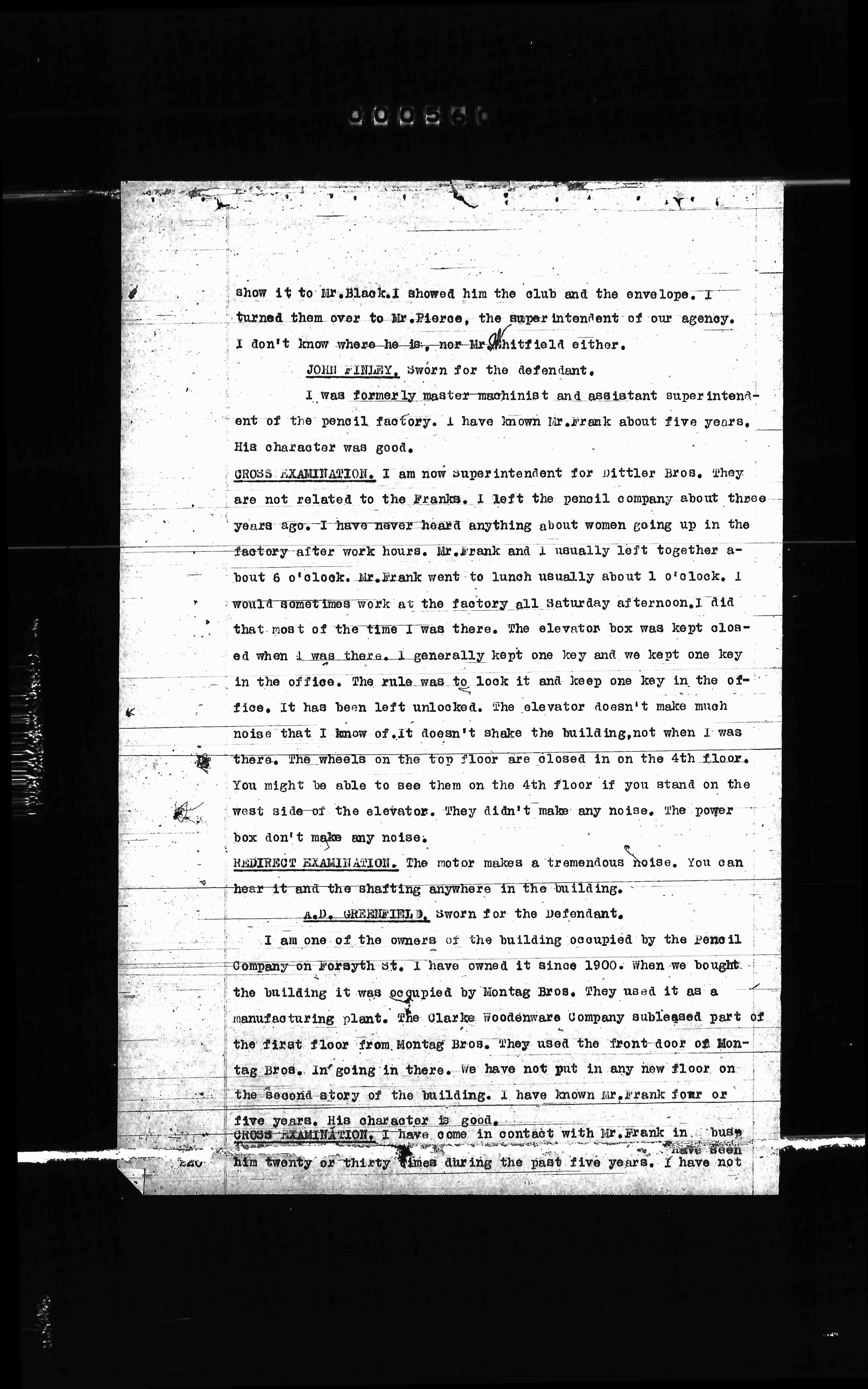 CROSS EXAMINATION. I am now superintendent for Jettler Bros. They are not related to the FRANKS. I left the pencil company about three years ago. I have never heard anything about women going up in the factory after work hours. MR. FRANK and I usually left together about 6 o'clock. MR. FRANK went to lunch usually about 1 o'clock. I would sometimes work at the factory all Saturday afternoon. I did that most of the time I was there. The elevator box was kept closed when I was there. I generally kept one key and we kept one key in the office. The rule was to lock it and keep one key in the office. It has been left unlocked. The elevator doesn't make much noise that I know of. It doesn't shake the building, not when I was there. The wheels on the top floor are closed in on the 4th floor. You might be able to see them on the 4th floor if you stand on the west side of the elevator. They didn't make any noise. The power box don't make any noise.
