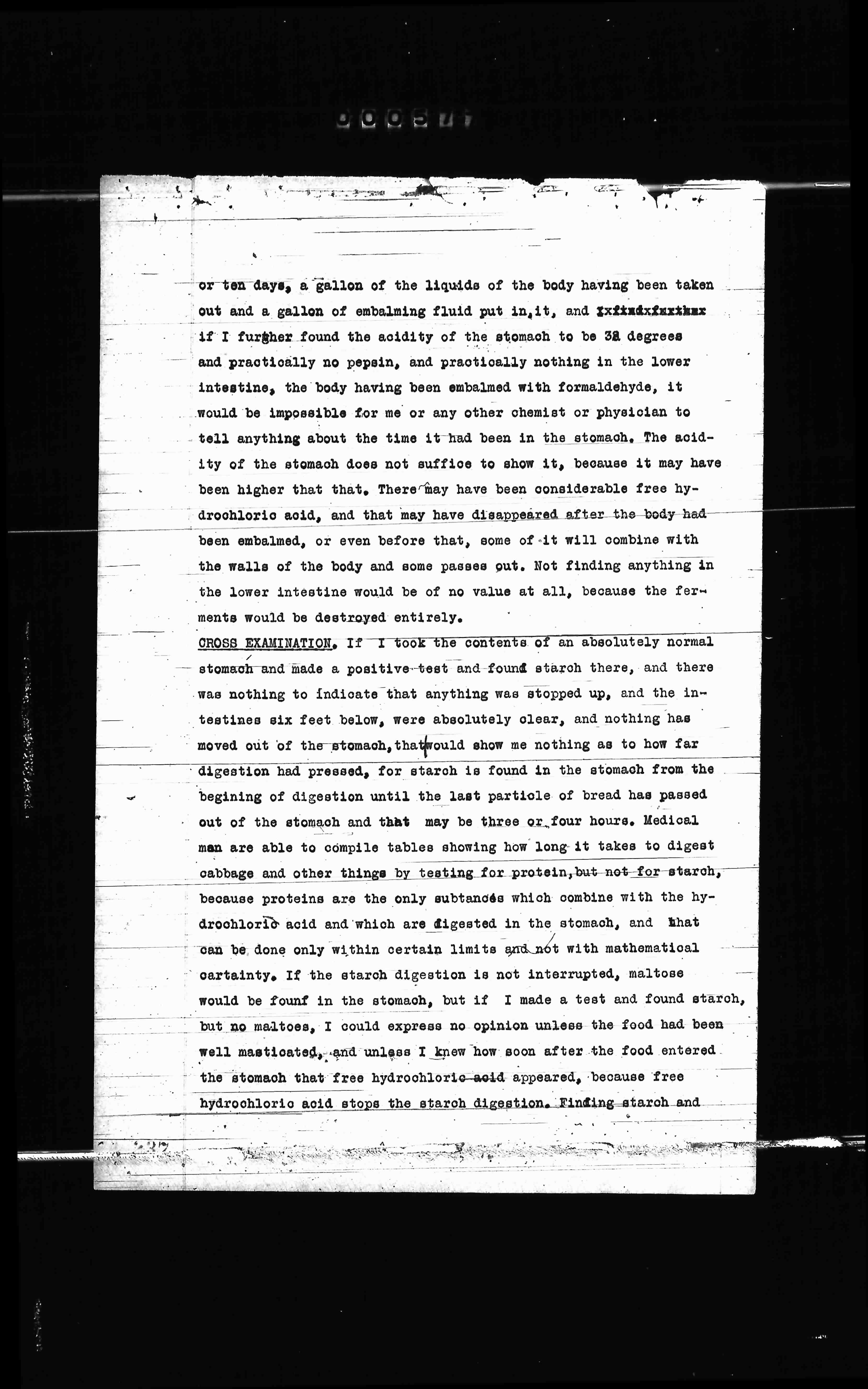 CROSS EXAMINATION. If I took the contents of an absolutely normal stomach and made a positive test and found starch there, and there was nothing to indicate anything was stopped up, and the intestines six feet below, were absolutely clear, and nothing has moved out of the stomach, that would show me nothing as to how far digestion had passed, for starch is found in the stomach from the beginning of digestion until the last particle of bread has passed out of the stomach and that may be three or four hours. Medical men are able to compile tables showing how long it takes to digest cabbage and other things by testing for protein, but not for starch, because proteins are the only substances which combine with the hydrochloric acid and which are digested in the stomach, and that can be done only within certain limits and not with mathematical certainty. If the starch digestion is not interrupted, maltose would be found in the stomach, but if I made a test and found starch, but no maltose, I could express no opinion unless the food had been well masticated, and unless I knew how soon after the food entered the stomach that free hydrochloric acid appeared, because free hydrochloric acid stops the starch digestion. Finding starch and