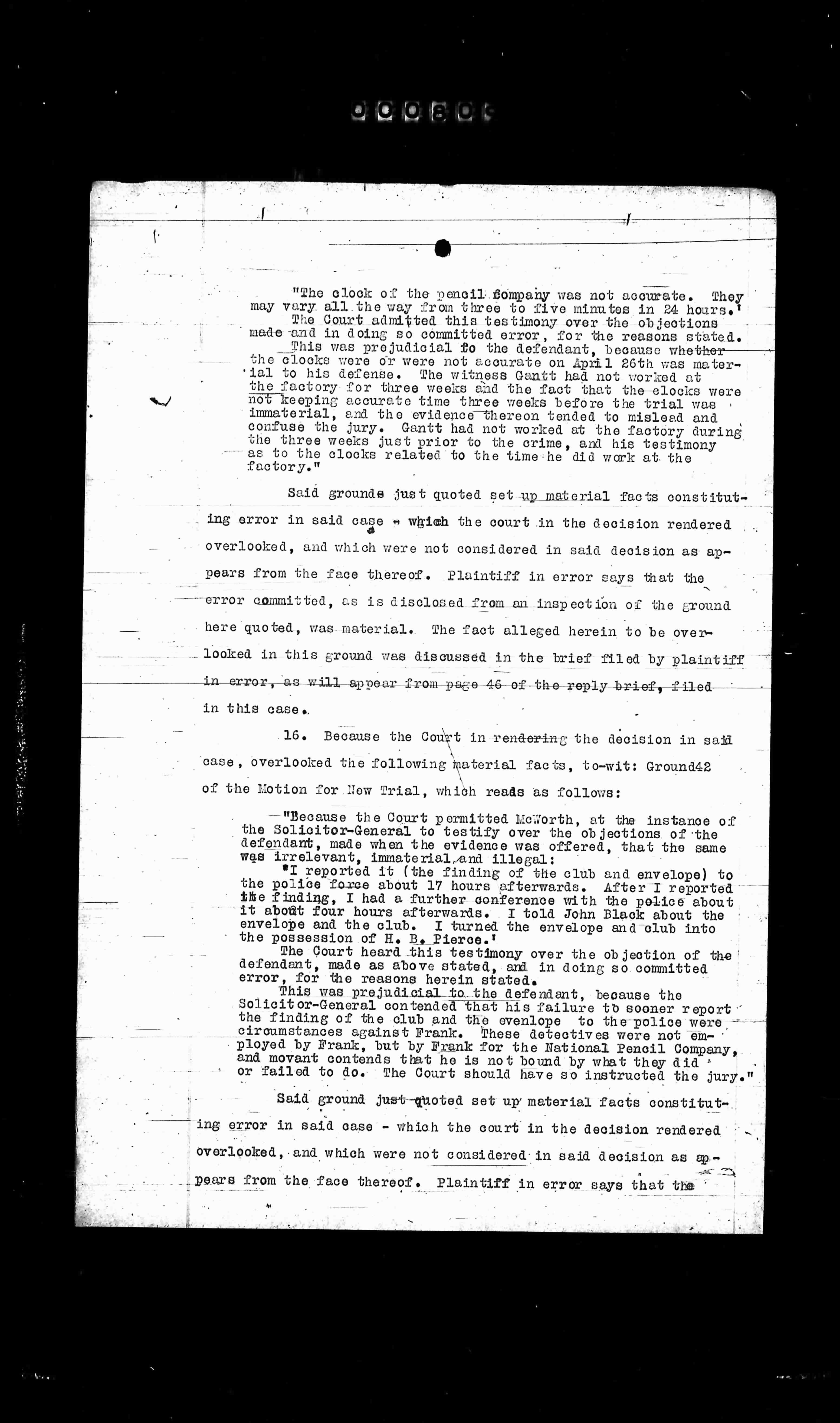 "Because the Court permitted Leo M. Frank, at the instance of the Solicitor-General, to testify over the objections of the defendant, made when the testimony was offered, that the same was irrelevant, immaterial and prejudicial, that on April 26th, 1913, he received a report from the police about the finding of a club and envelope in the police station about 17 hours afterwards. After I reported it about four hours afterwards. I told John Black about the envelope and the club. I turned the envelope and club into the possession of H. B. Pierce, the Court heard this testimony over the objection of the defendant, made as above stated, and in doing so committed error for the reasons herein stated.