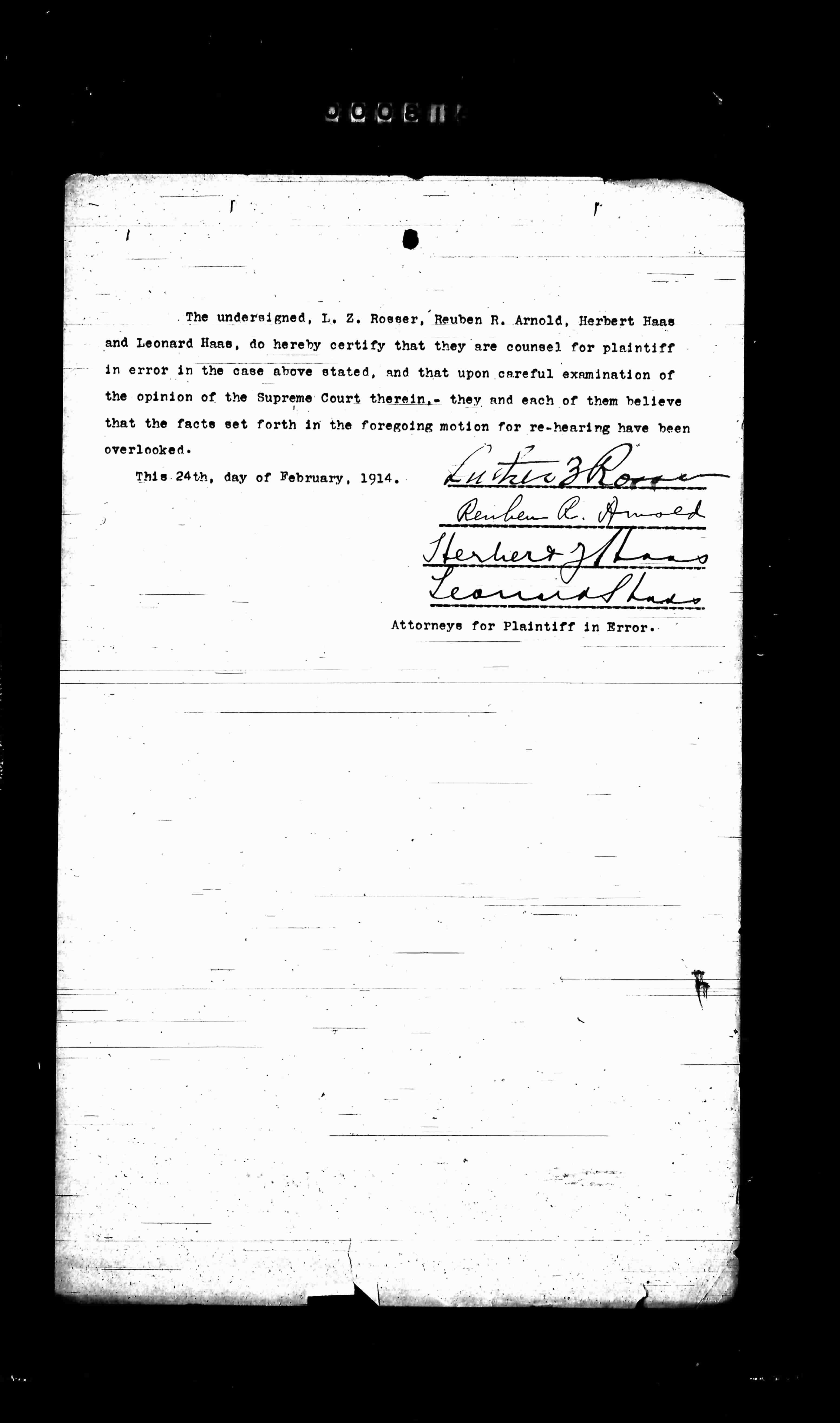 The undersigned, L. Z. Rosser, Reuben R. Arnold, Herbert Haas and Leonard Haas, do hereby certify that they are counsel for plaintiff in error in the case above stated, and that upon careful examination of the opinion of the Supreme Court therein, - they, and each of them believe that the facts set forth in the foregoing motion for re-hearing have been overlooked.