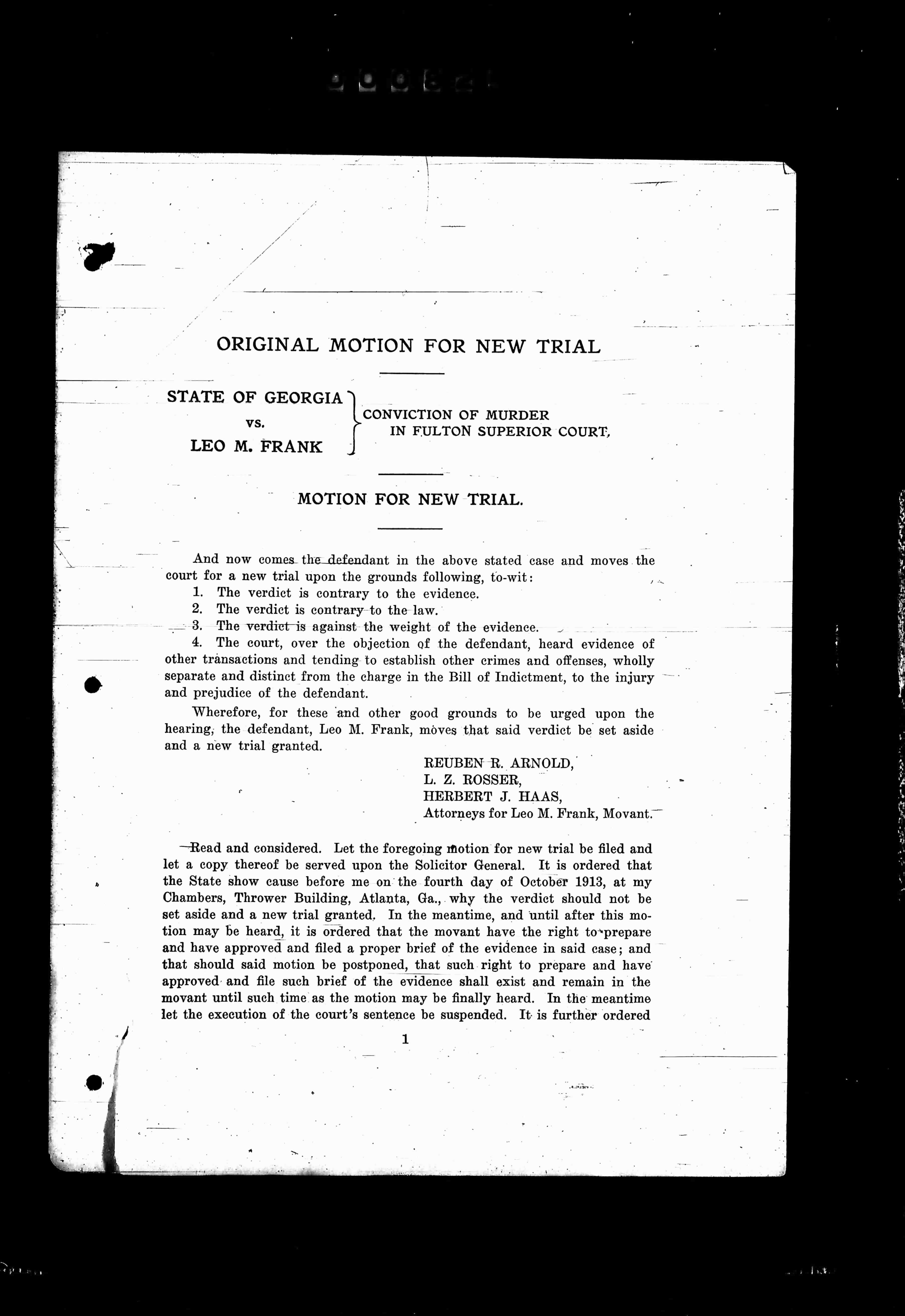 Wherefore, for these and other good grounds to be urged upon the hearing, the defendant, Leo M. Frank, moves that said verdict be set aside and a new trial granted.