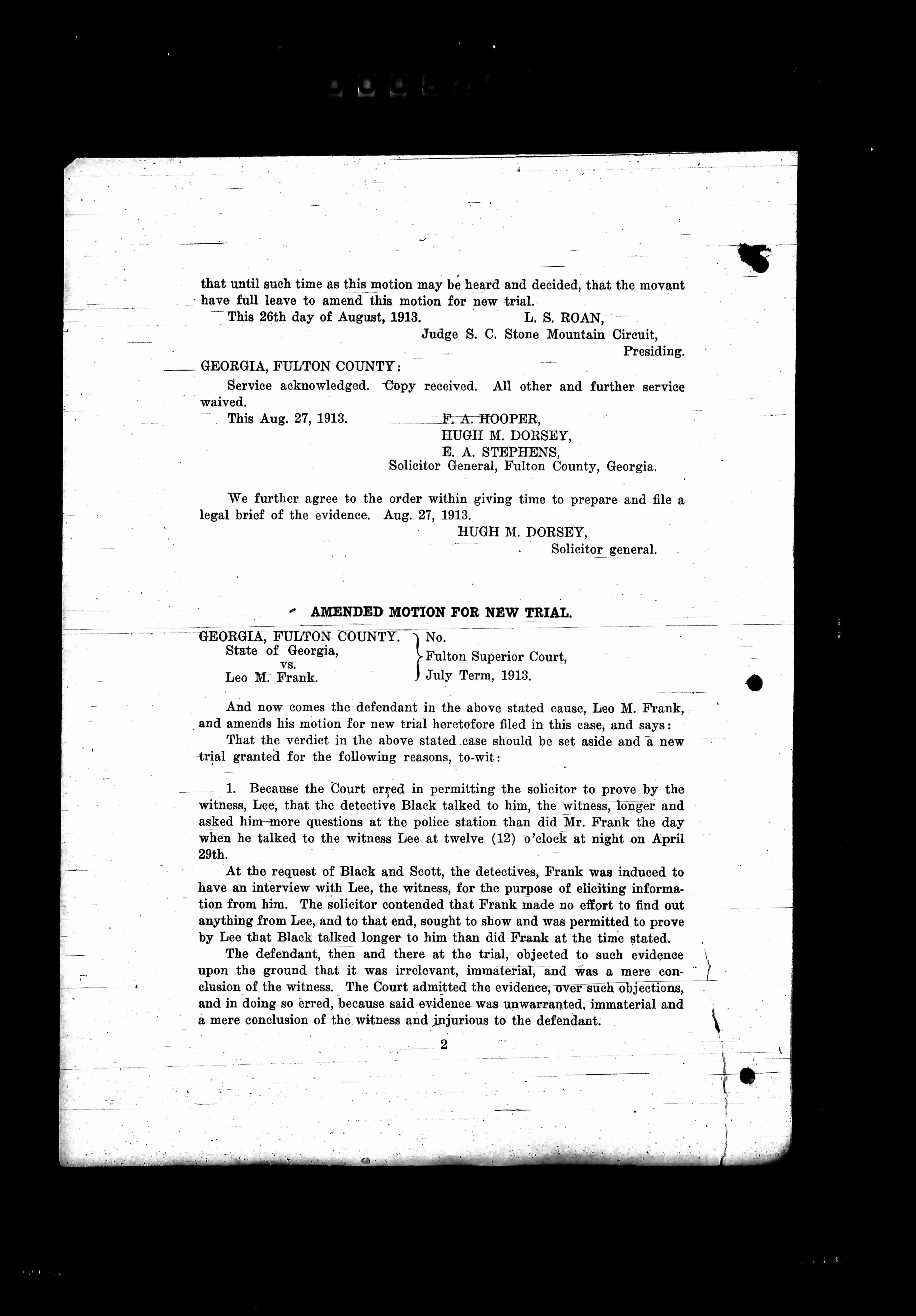 And now comes the defendant in the above stated cause, Leo M. Frank, and amends his motion for new trial heretofore filed in this case, and says: