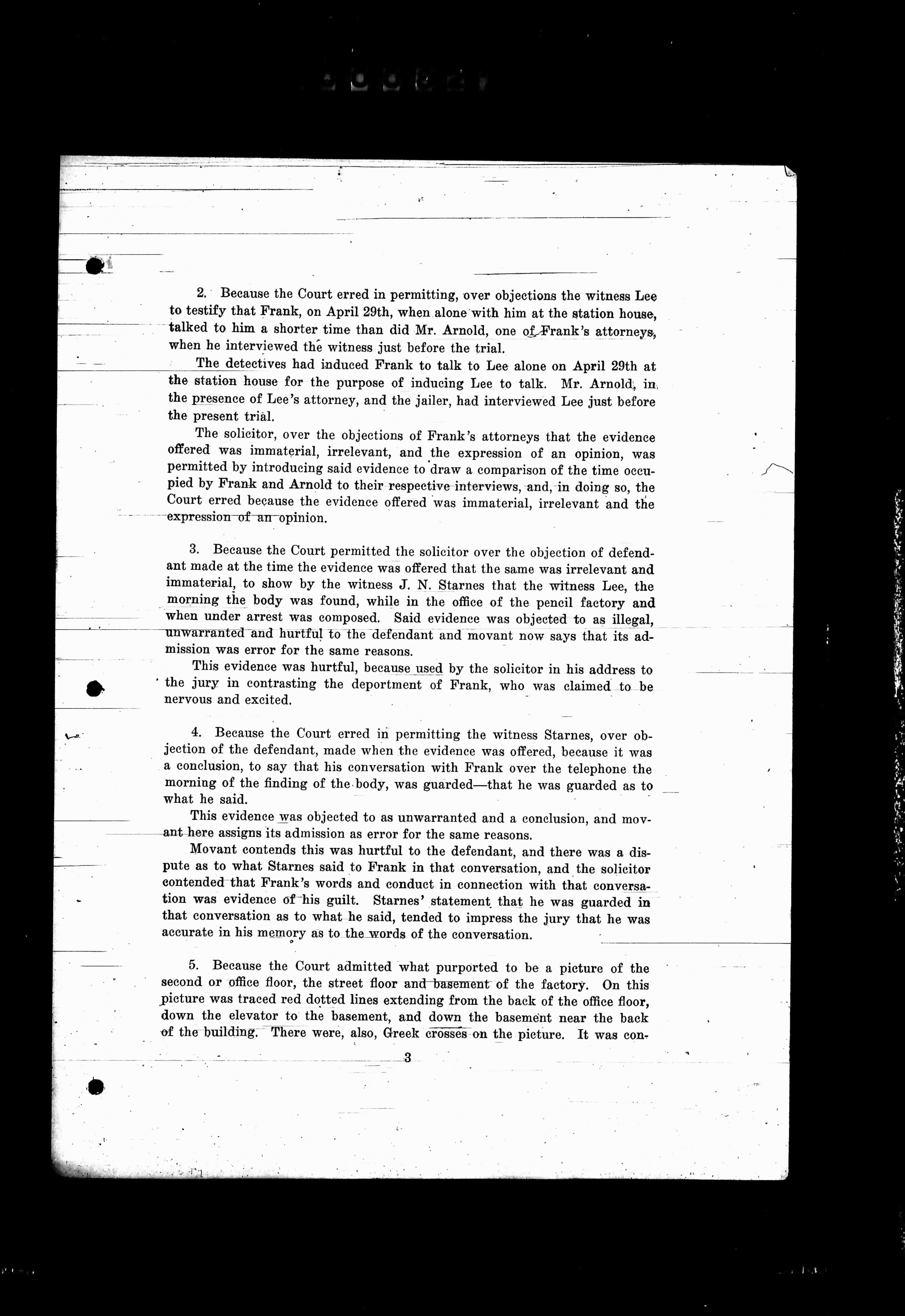 2. Because the Court erred in permitting, over objections the witness Lee to testify that Frank, on April 29th, when alone with him at the station house, talked to him a shorter time than did Mr. Arnold, one of Frank's attorneys, when he interviewed the witness just before he talked to Lee.