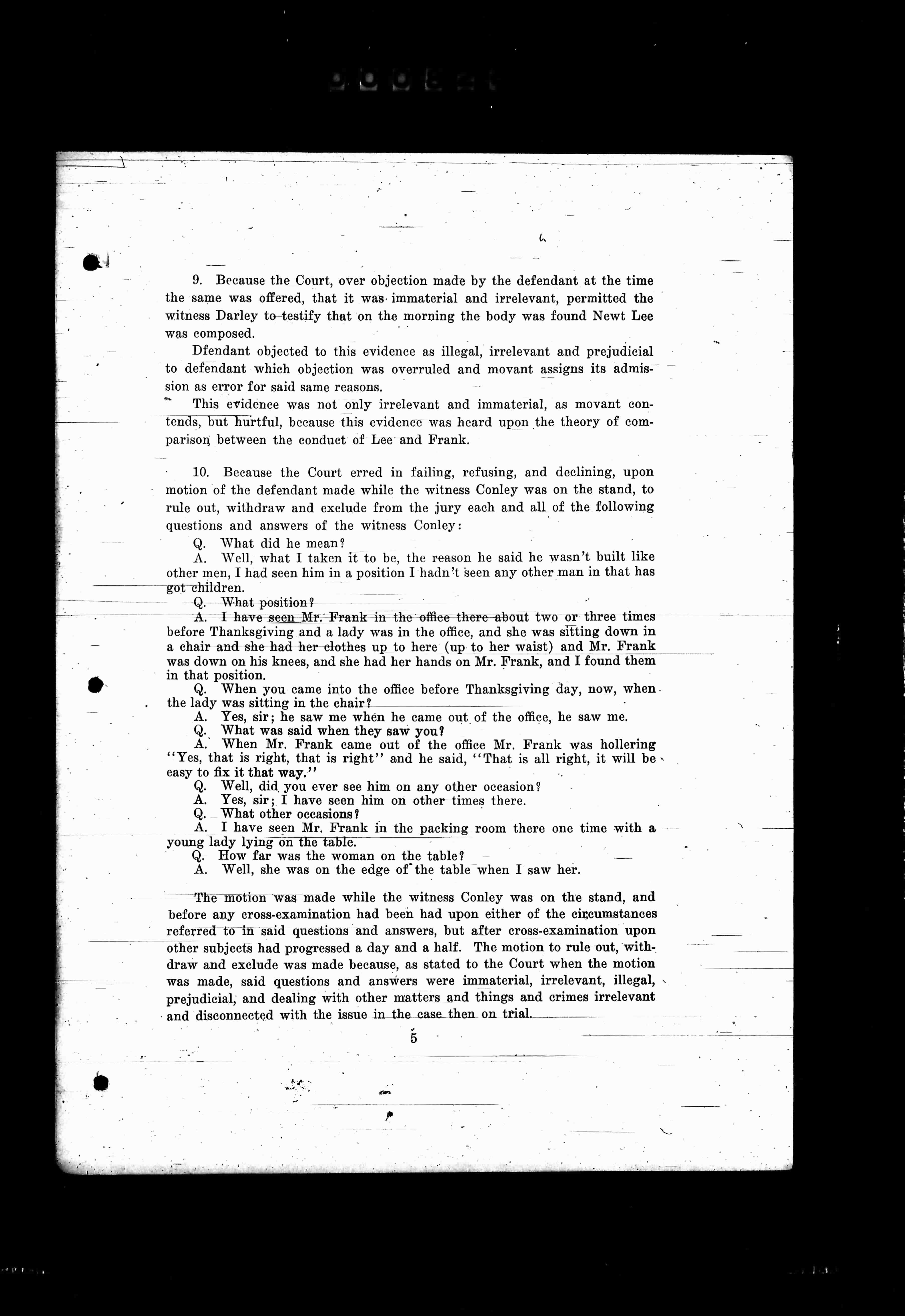 10. Because the Court erred in failing, refusing, and declining, upon motion of the defendant made while the witness Conley was on the stand, to rule out, withdraw and exclude from the jury each and all of the following questions and answers of the witness Conley: